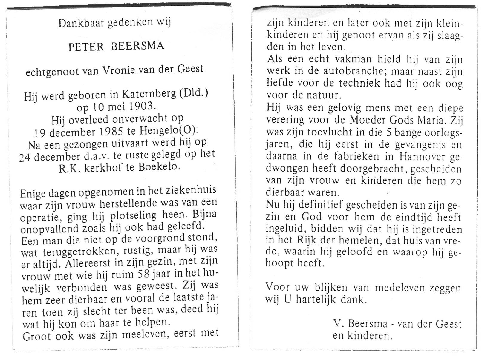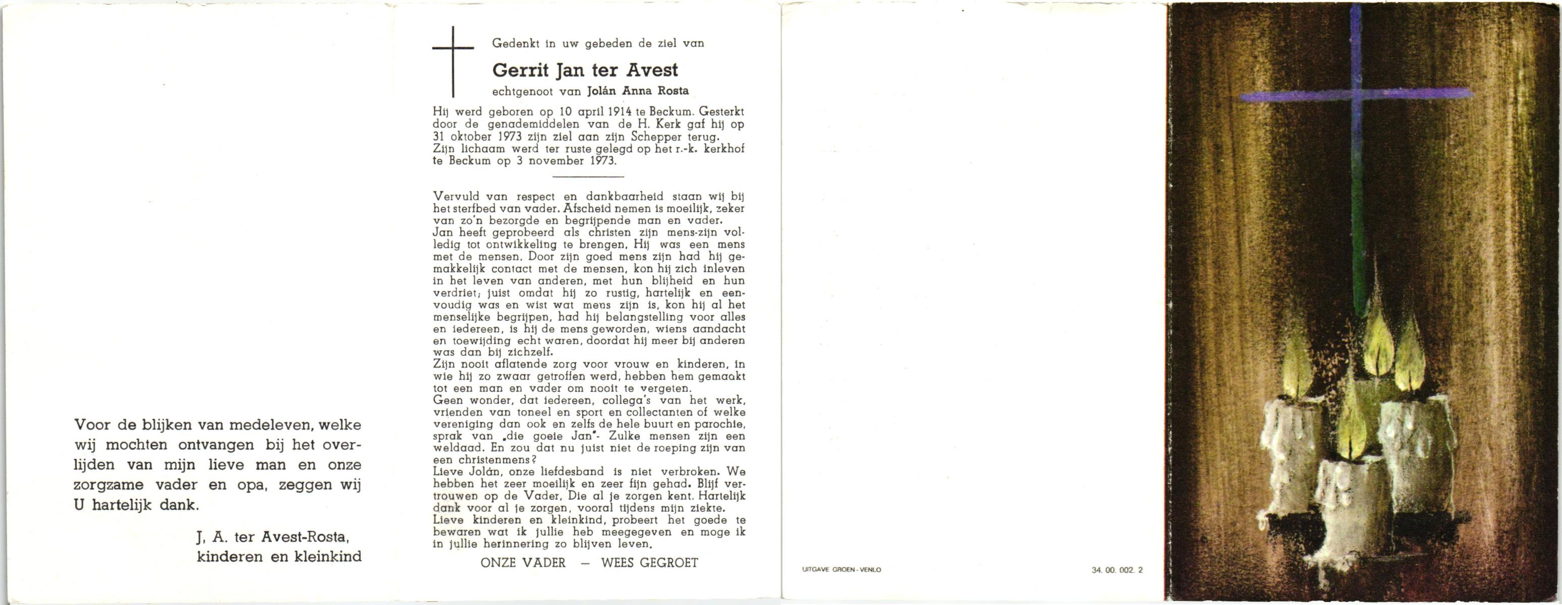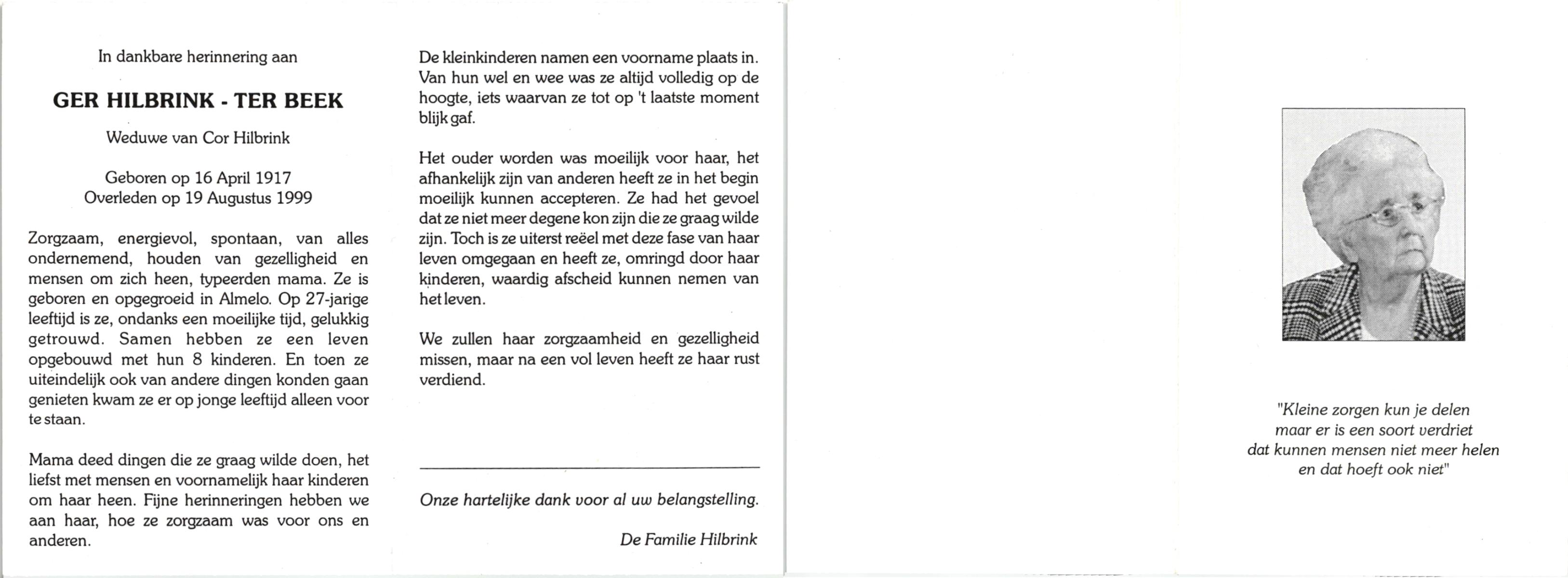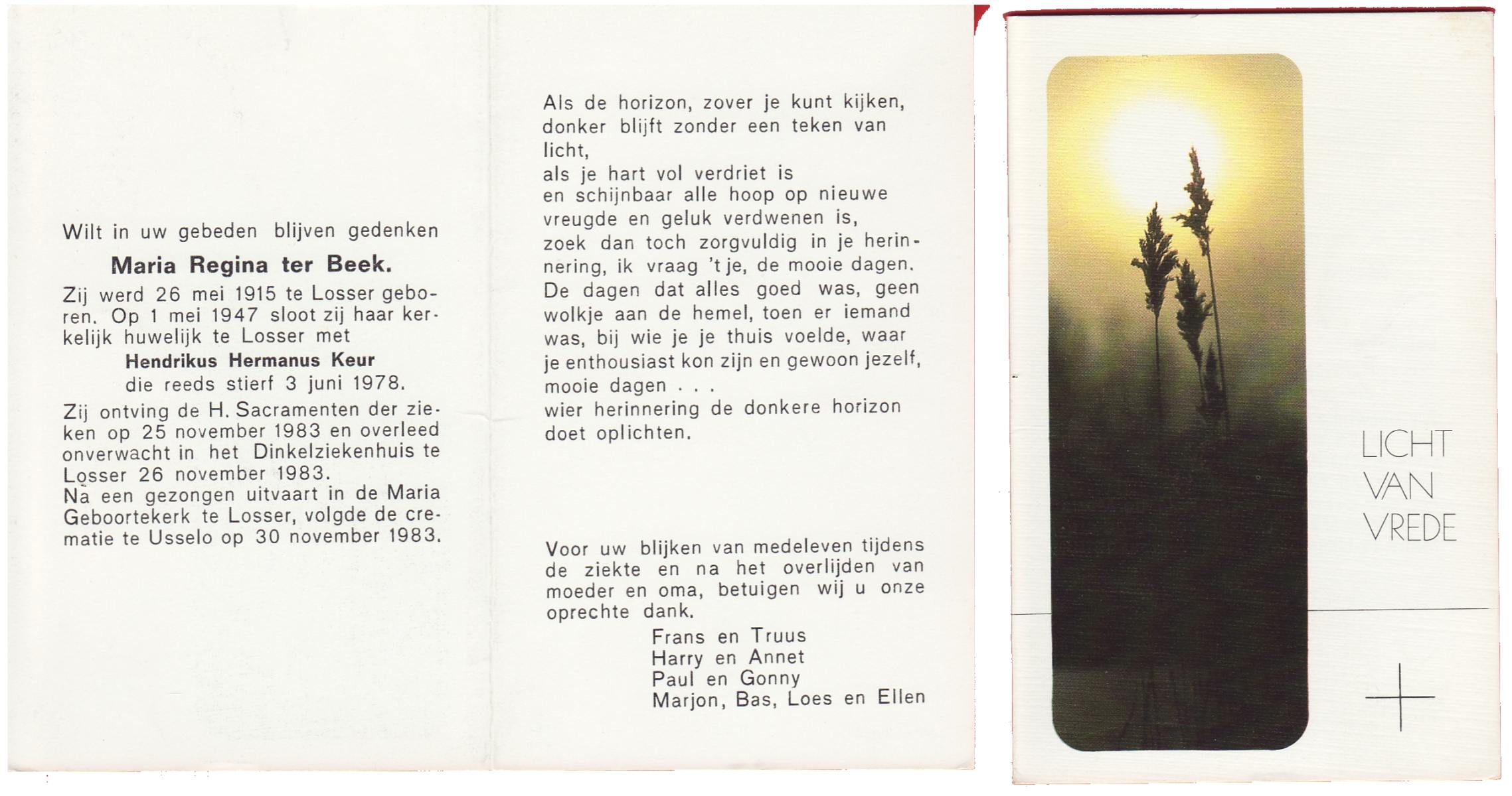 BEKE, ter, Gerrit, geboren op 1-9-1921 te Hengelo (O), overleden op 5-9-1984 te Enschede op 63-jarige leeftijd, begraven op 10-9-1984 te Hengelo (Ov.).