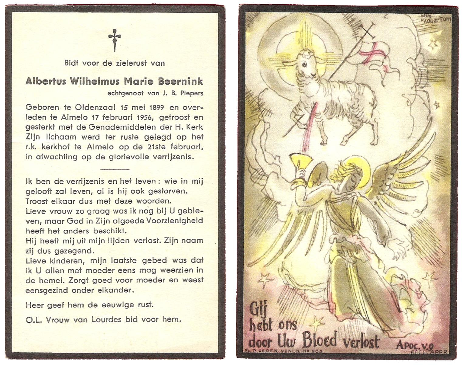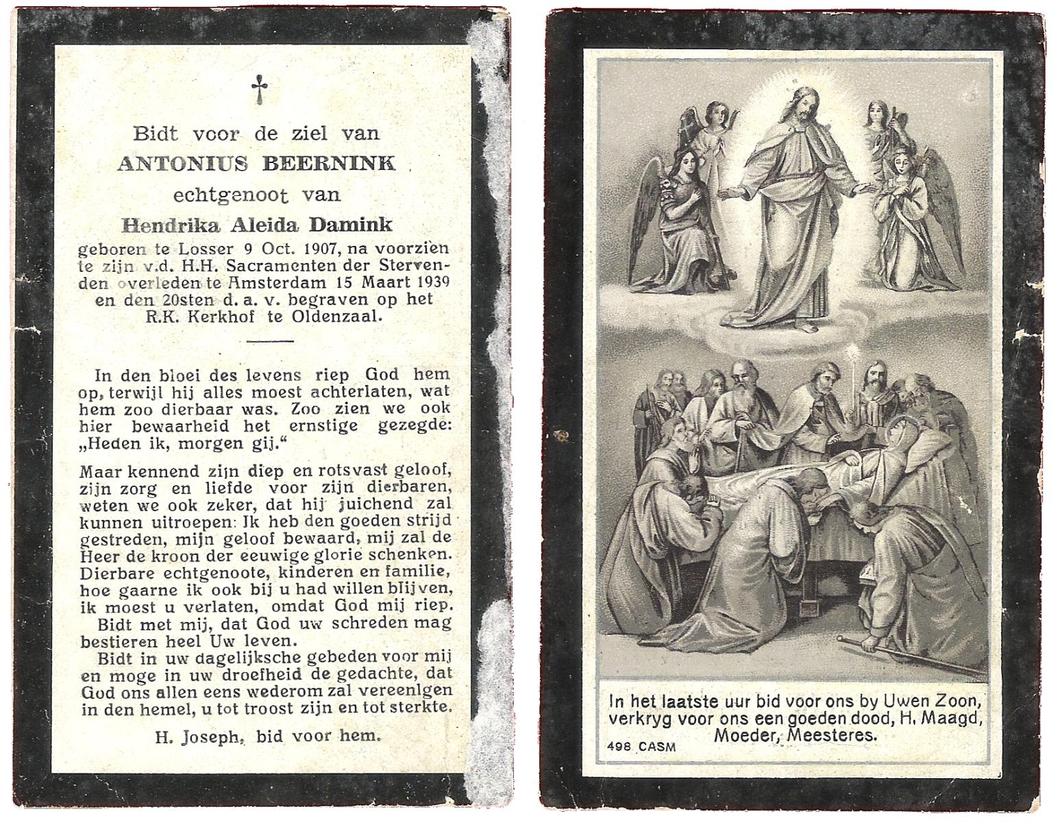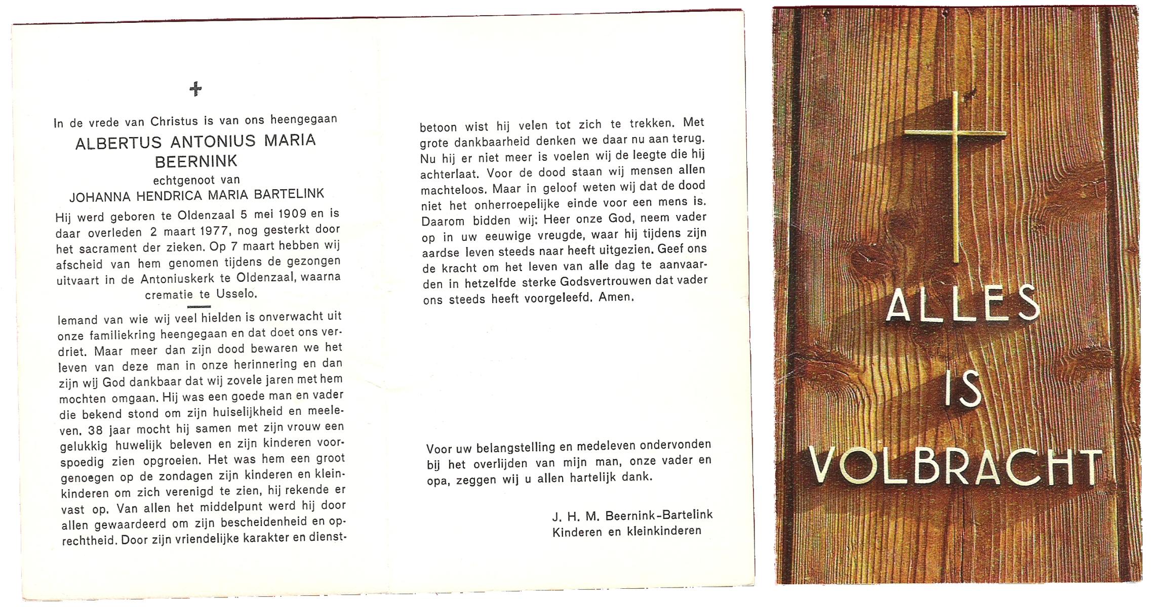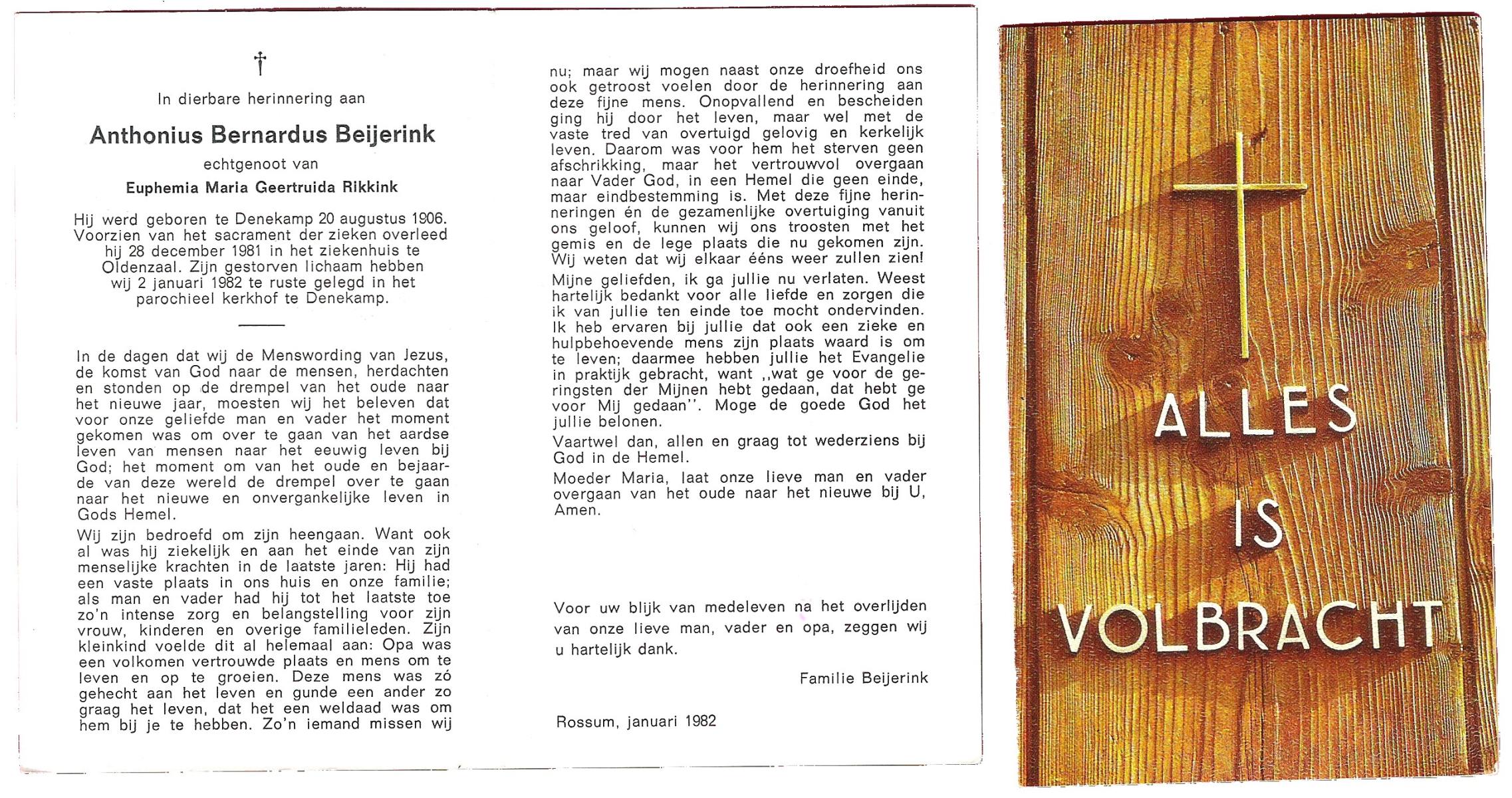BEIJERINK, Anthonius Bernardus, geboren op 20-8-1906 te Denekamp, overleden op 28-12-1981 te Oldenzaal op 75-jarige leeftijd, begraven op 2-1-1982 te Denekamp.