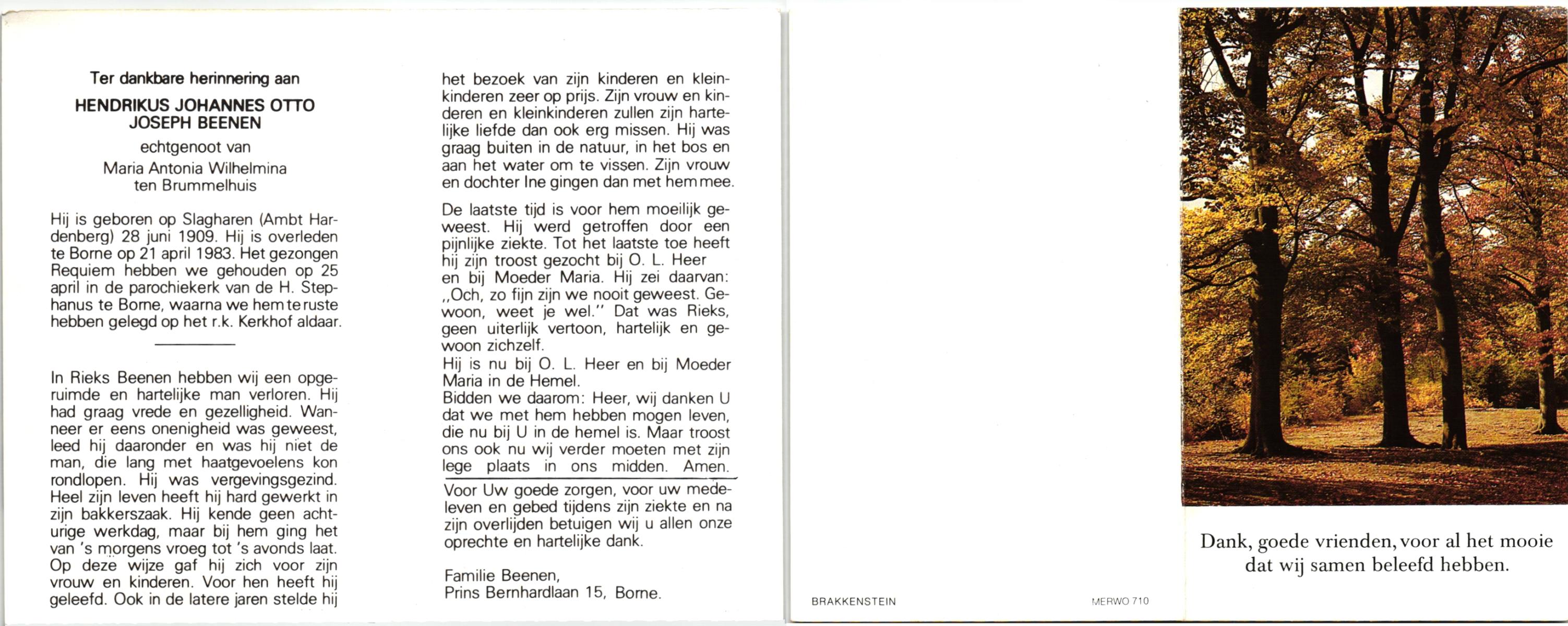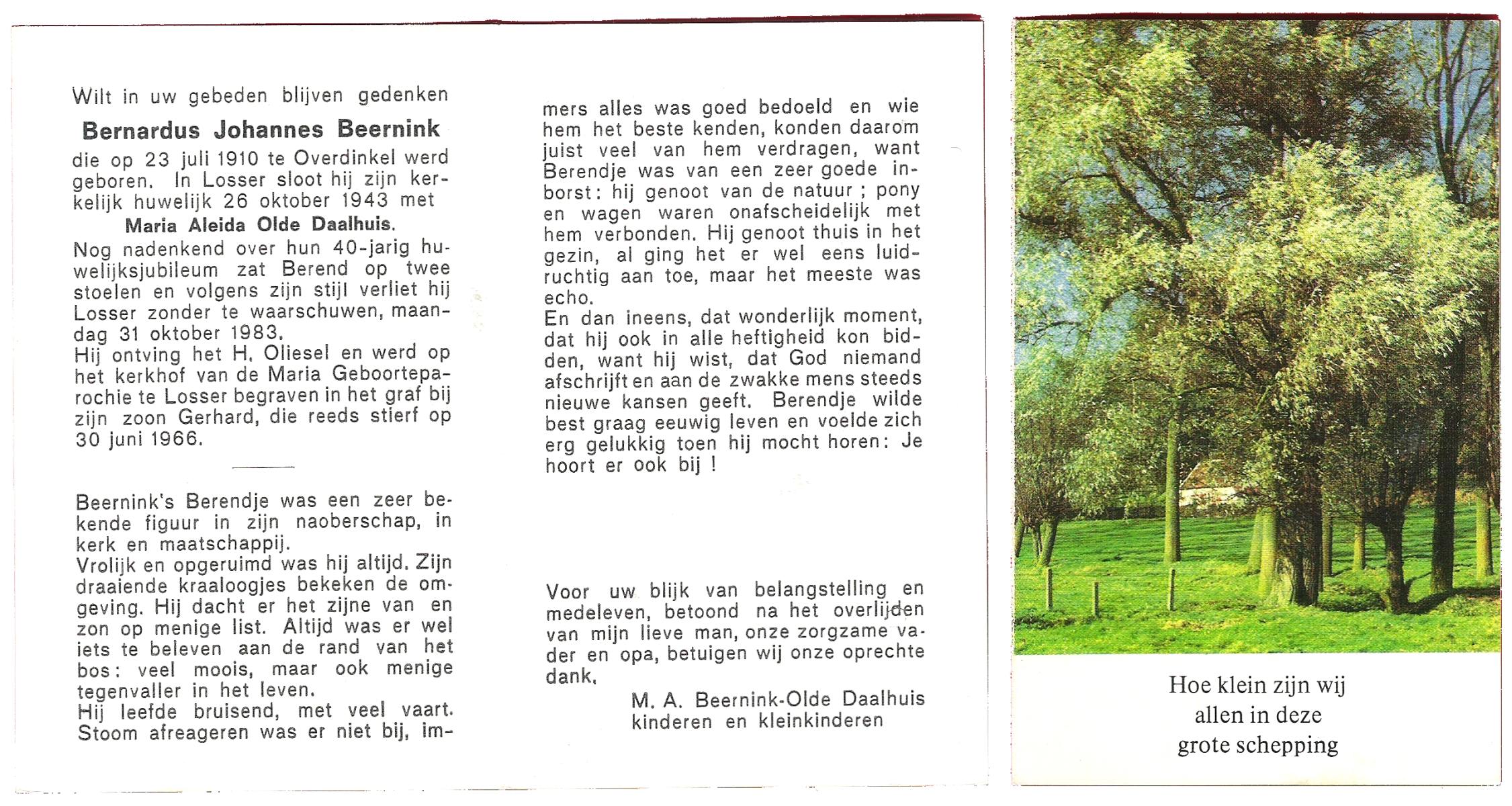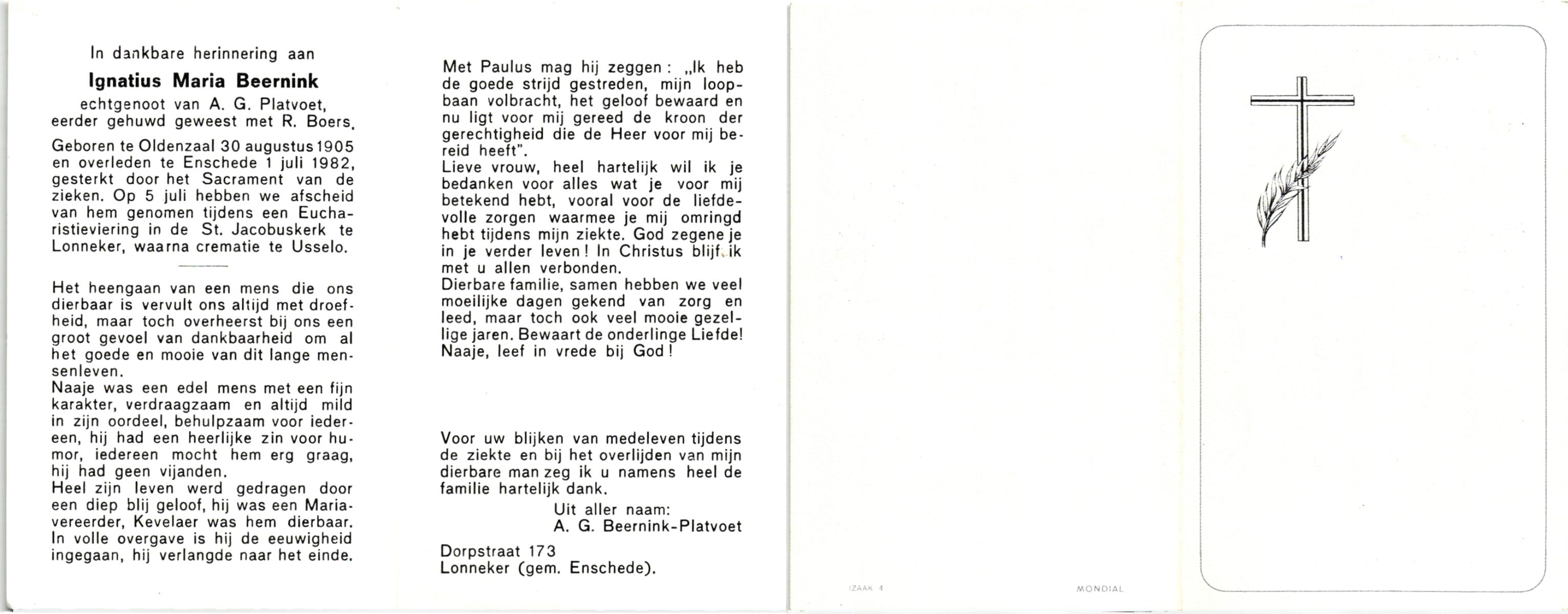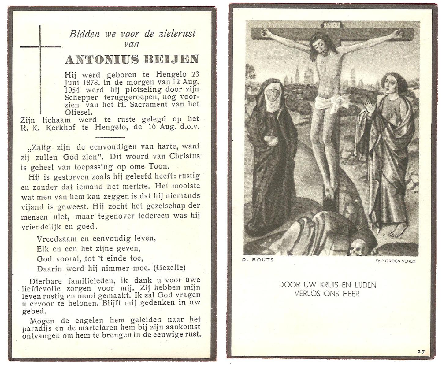 BEIJERINK, Anthonius Bernardus, geboren op 20-8-1906 te Denekamp, overleden op 28-12-1981 te Oldenzaal op 75-jarige leeftijd, begraven op 2-1-1982 te Denekamp.