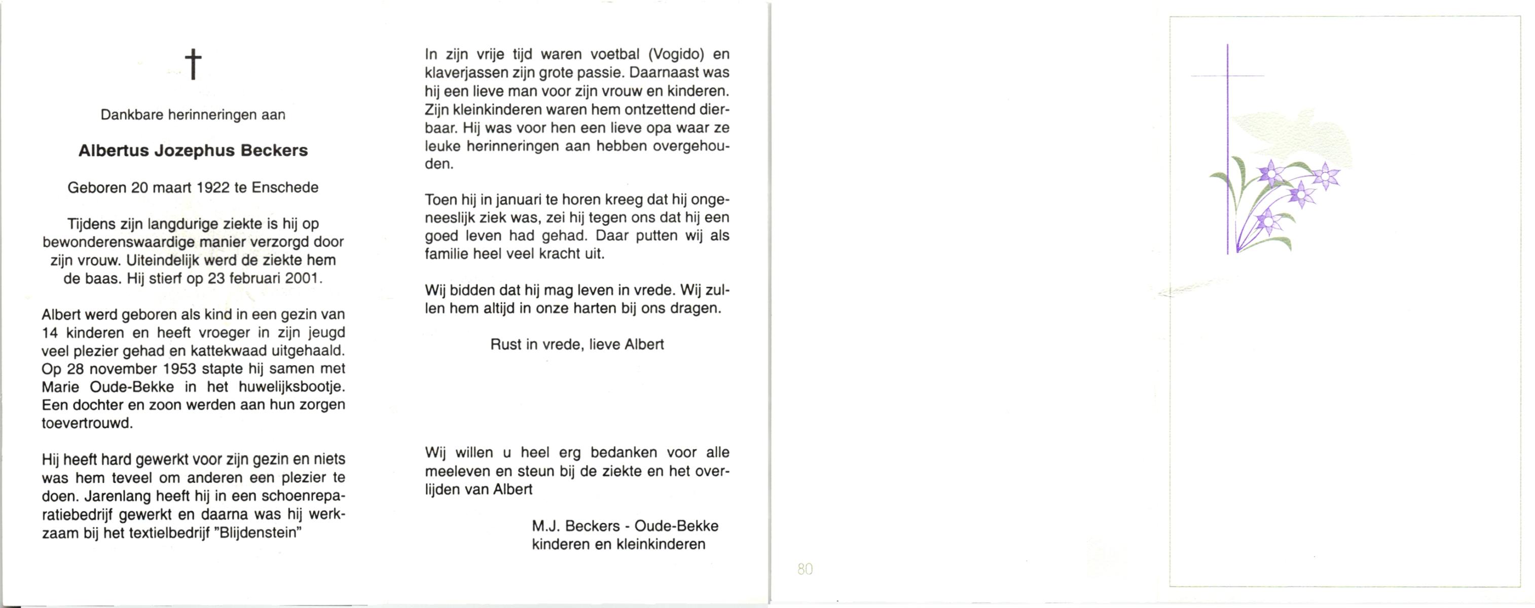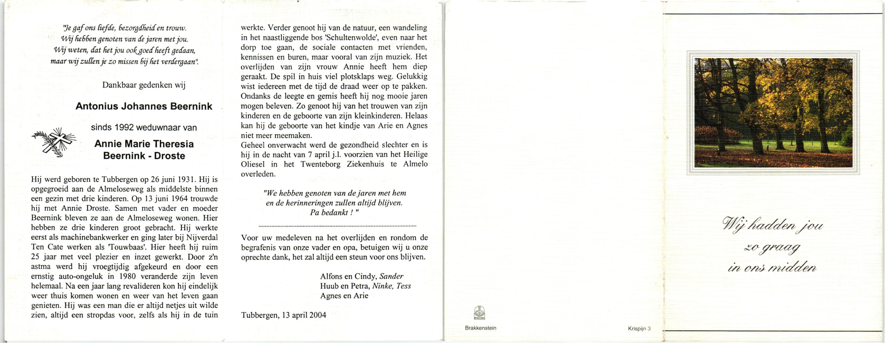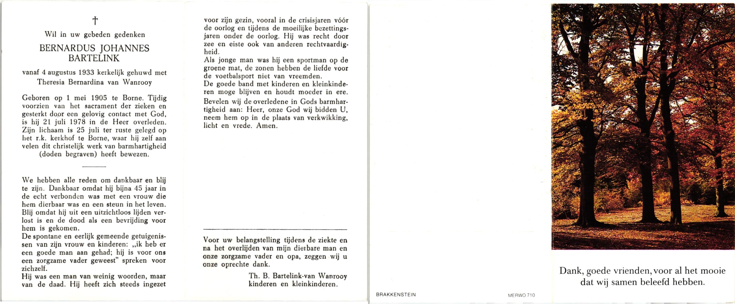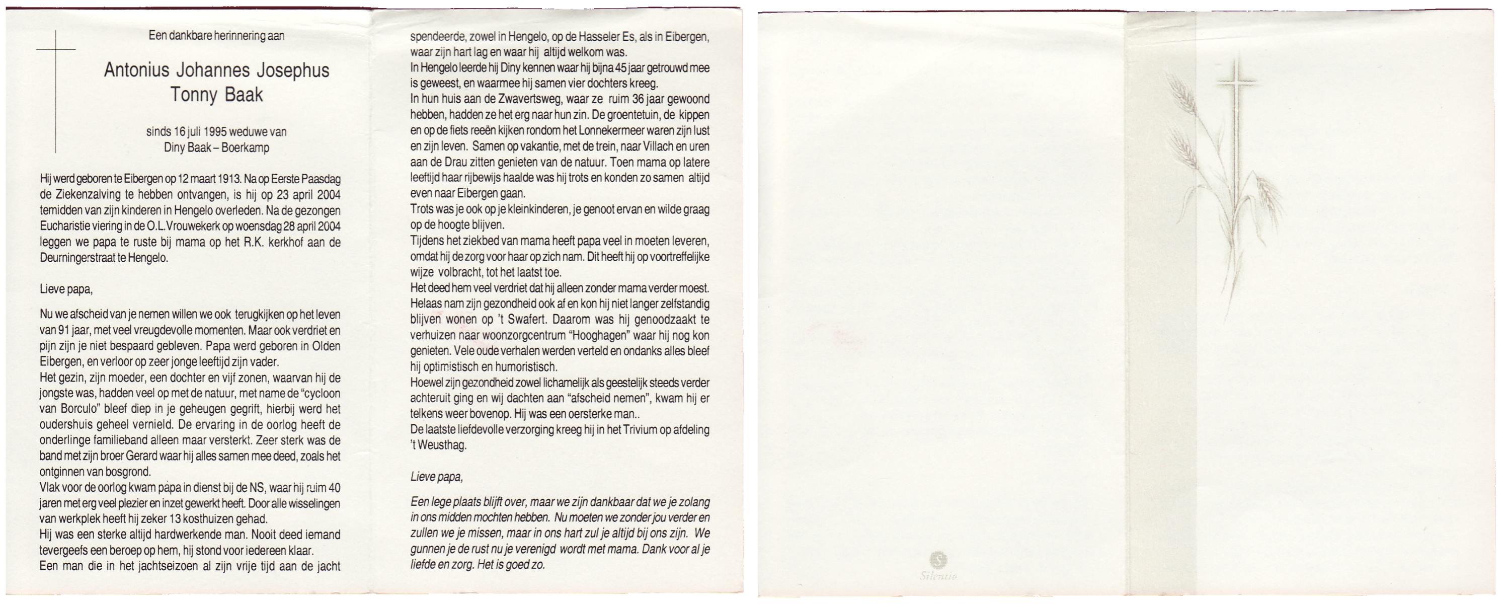 BEIJERINK, Anthonius Bernardus, geboren op 20-8-1906 te Denekamp, overleden op 28-12-1981 te Oldenzaal op 75-jarige leeftijd, begraven op 2-1-1982 te Denekamp.