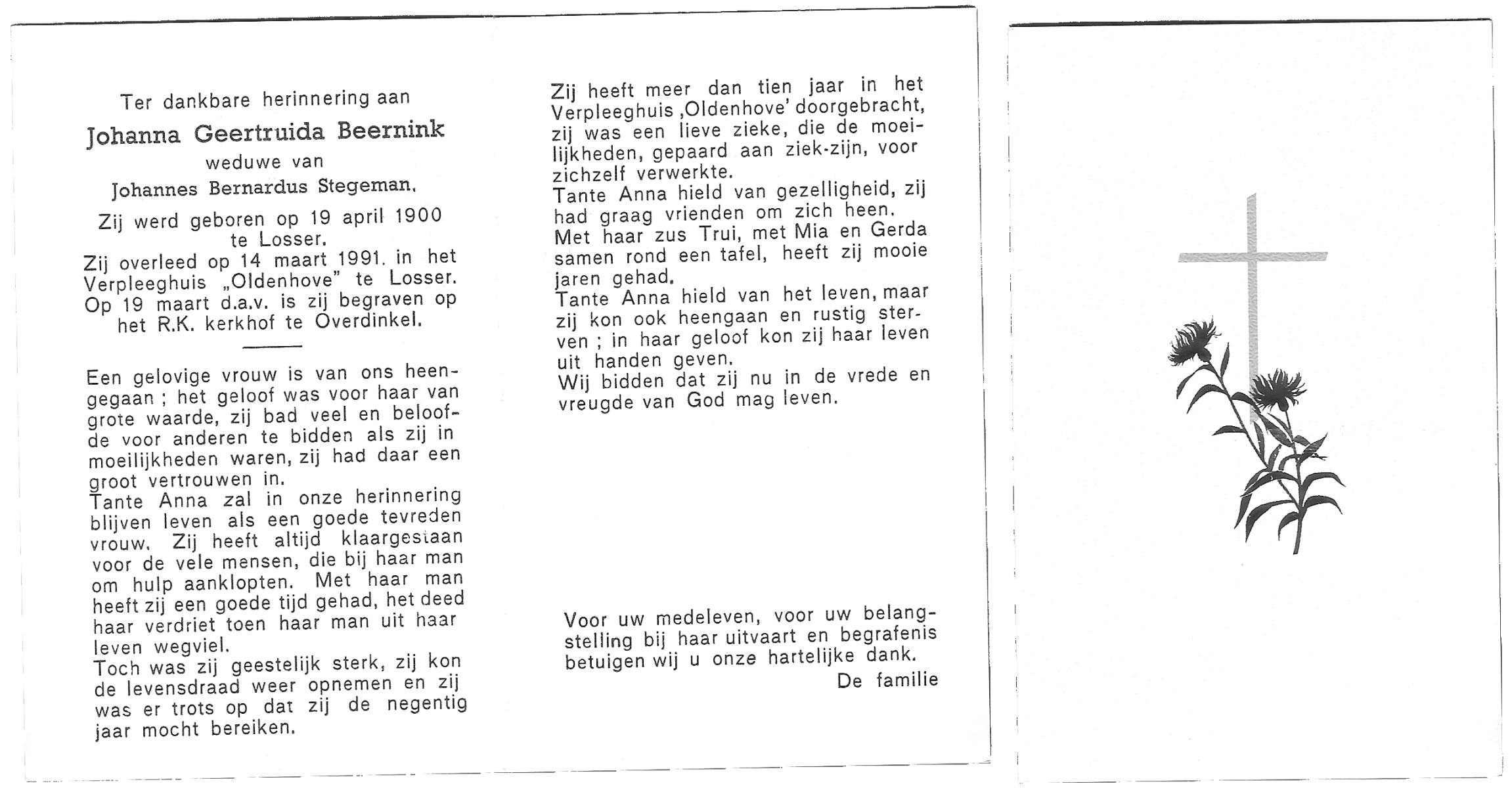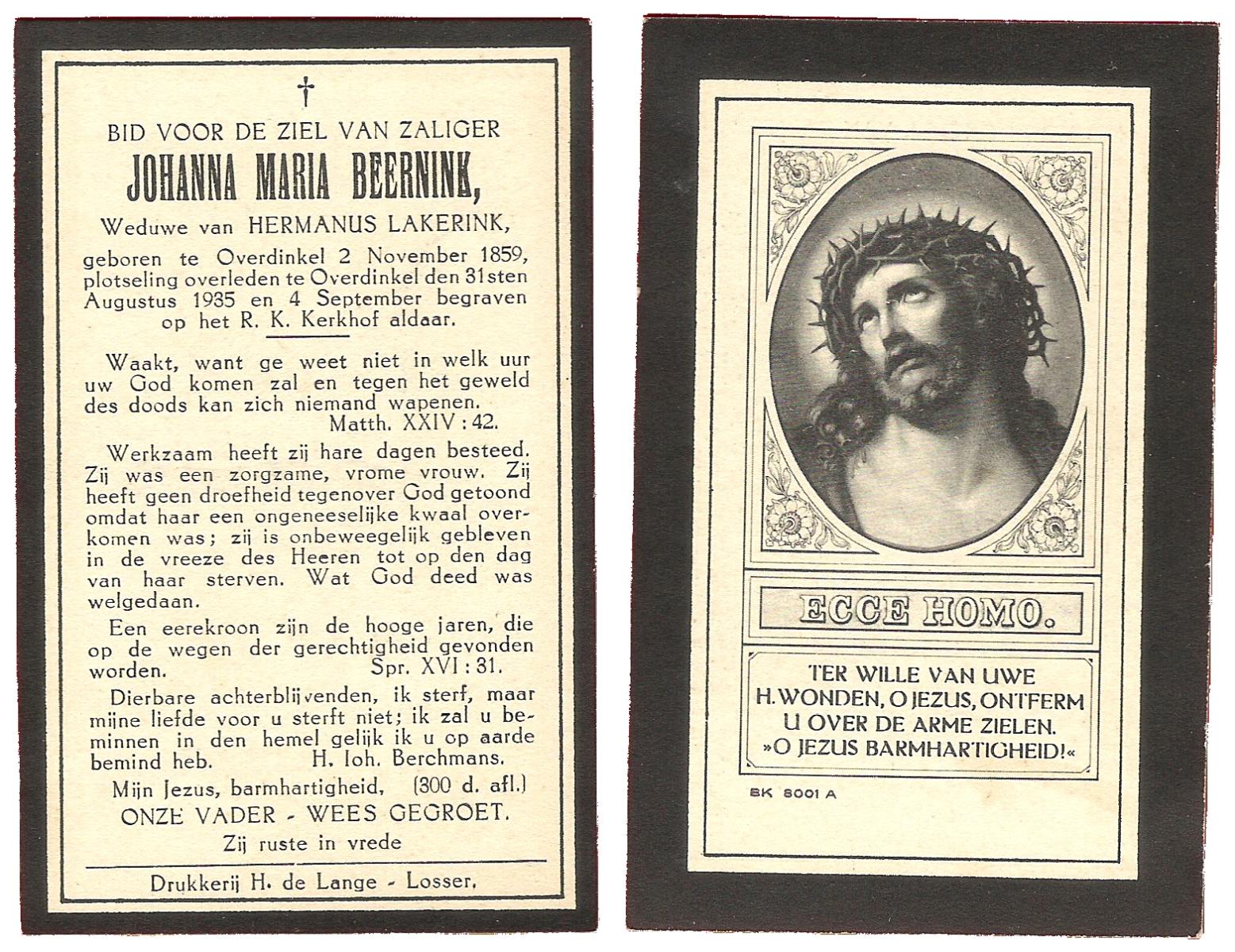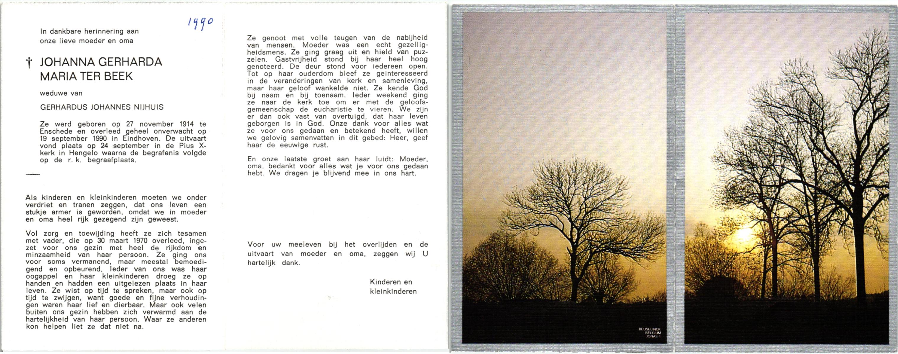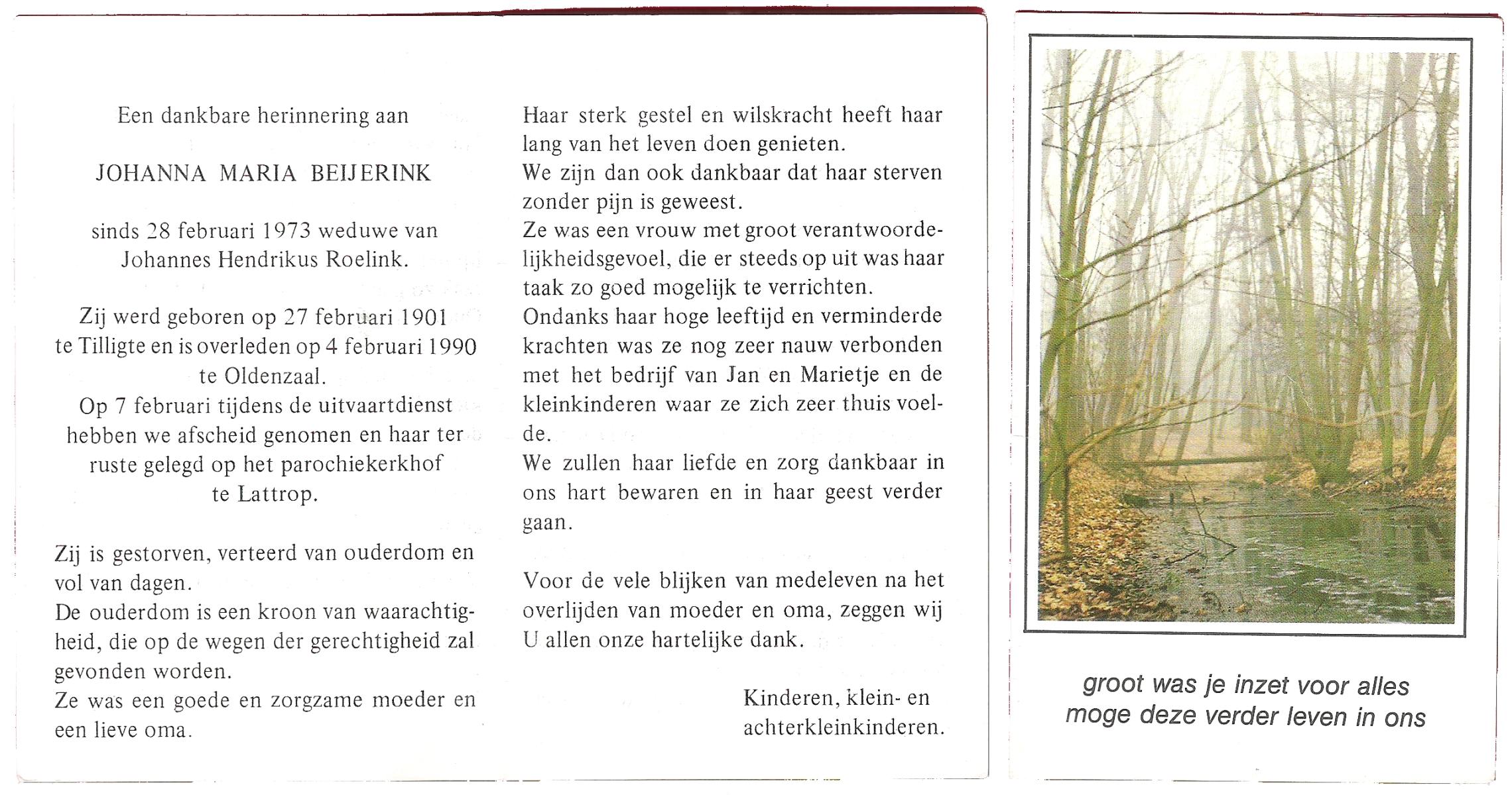 BEIJERINK, Johanna Maria, geboren op 27-2-1901 te Tilligte, overleden op 4-2-1990 te Oldenzaal op 88-jarige leeftijd, begraven op 7-2-1990 te Lattrop.