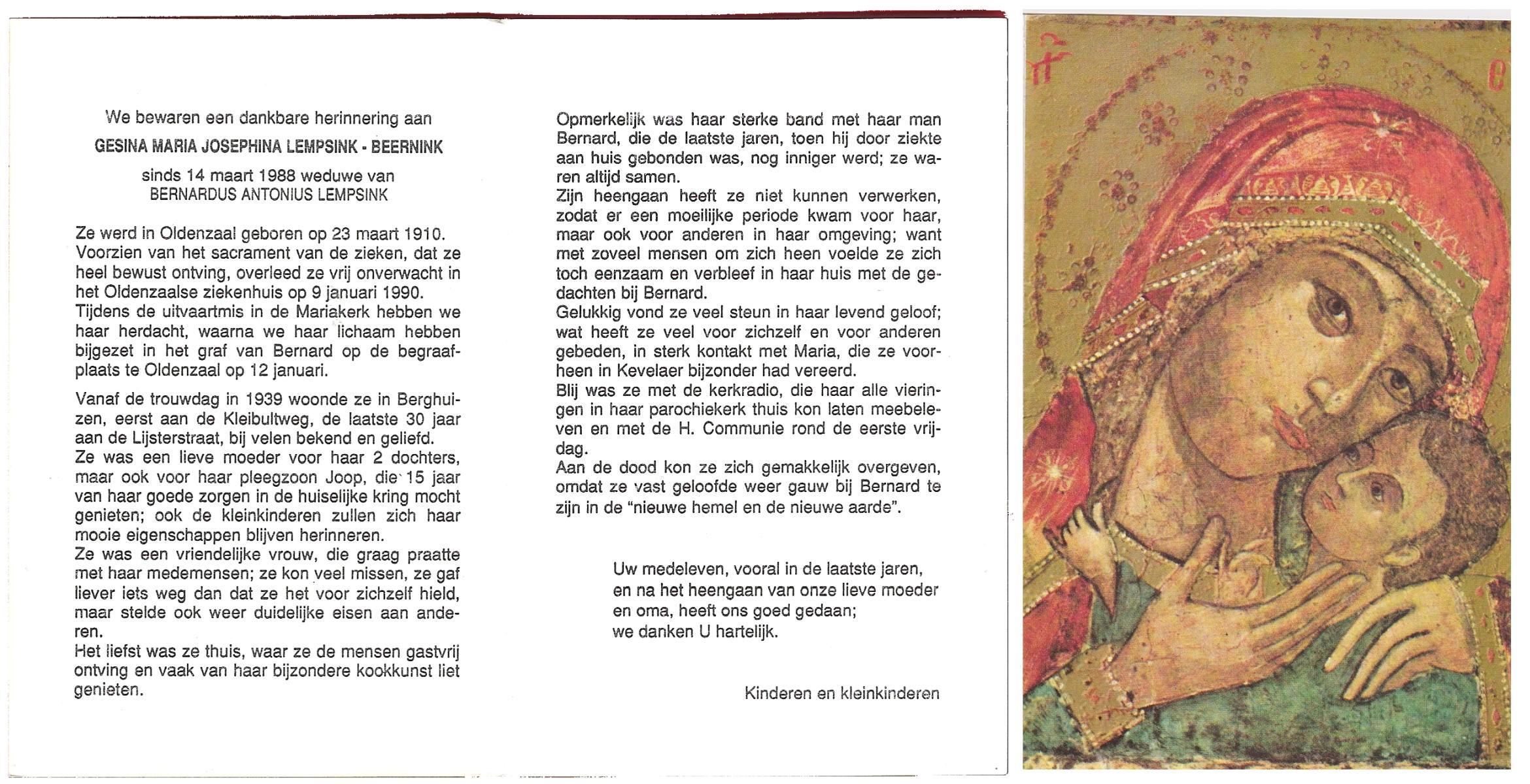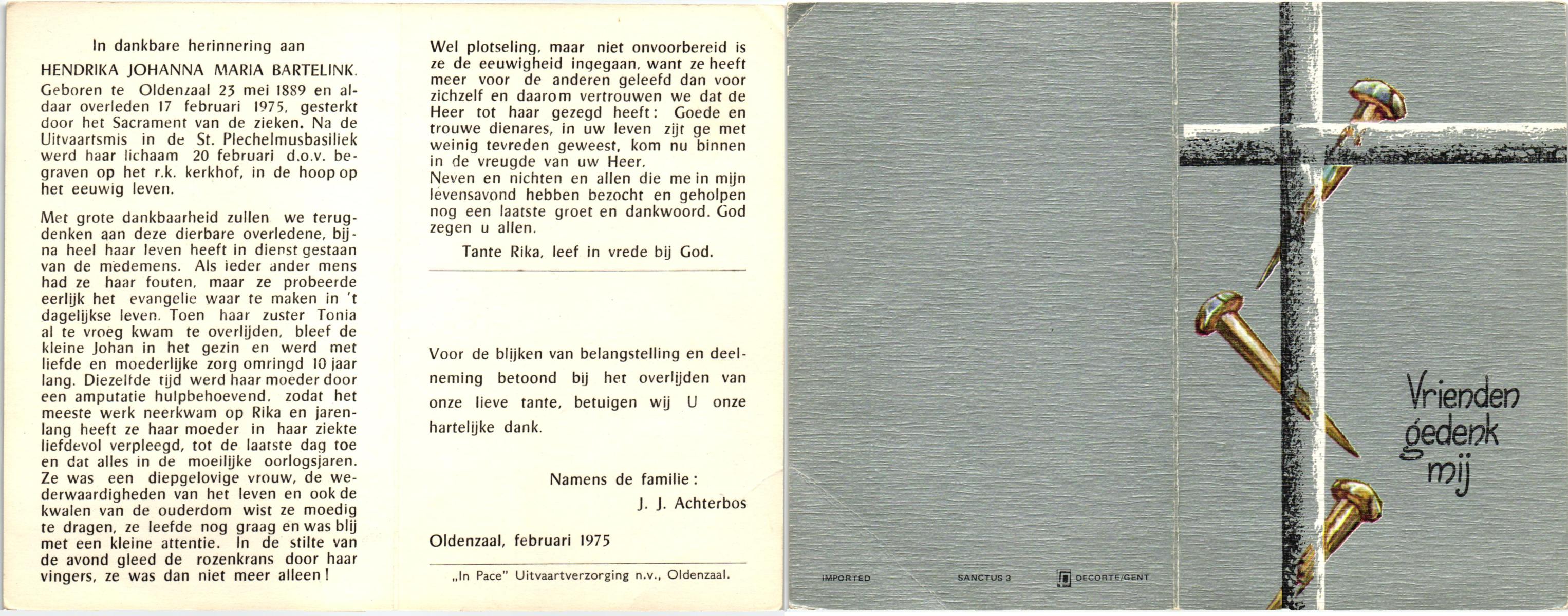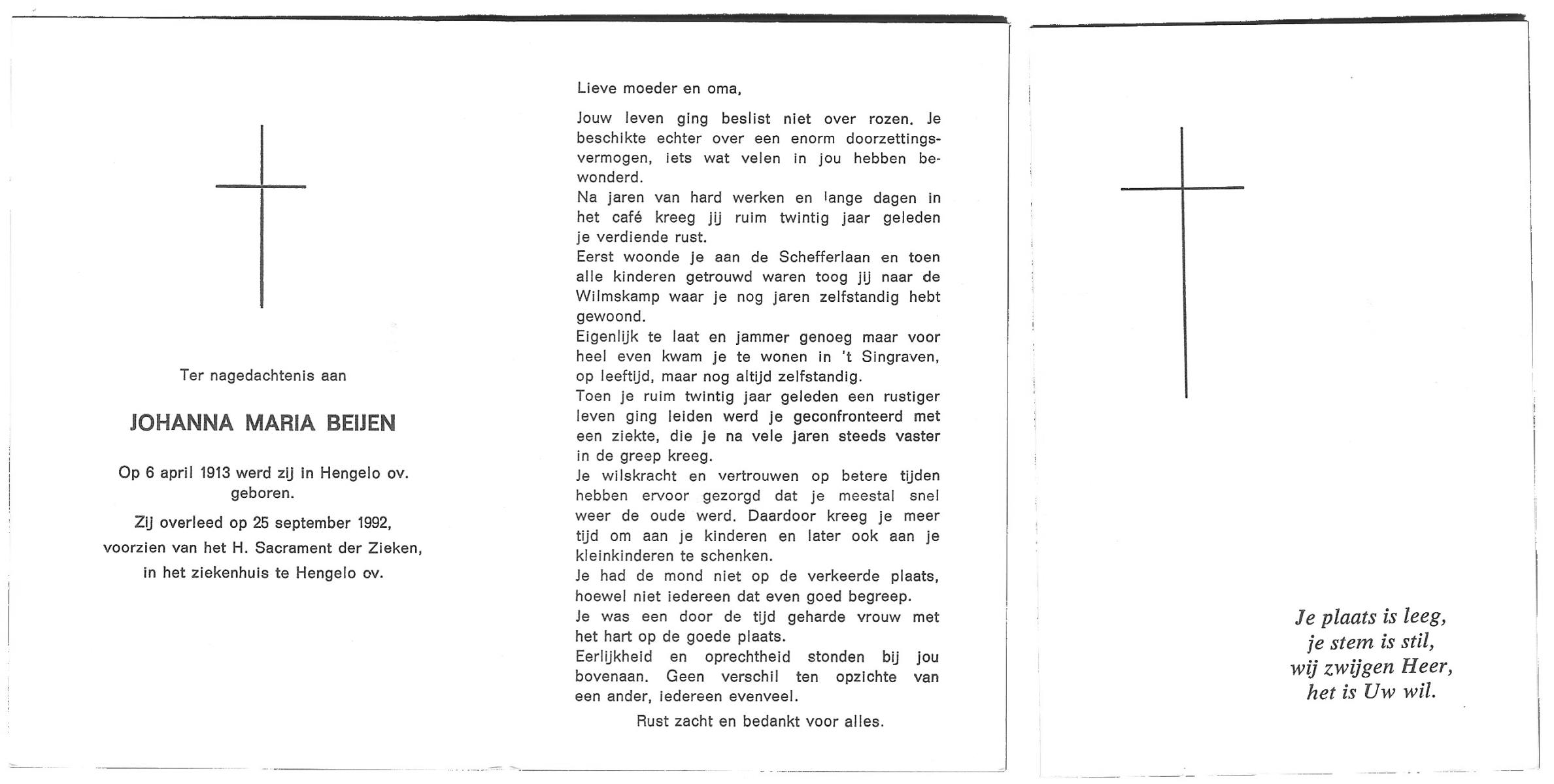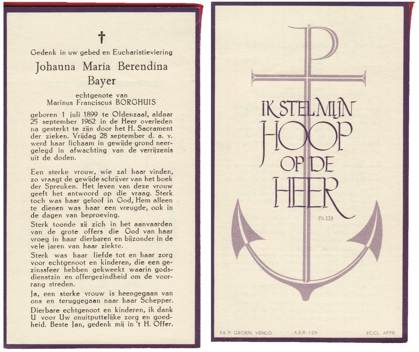 BEIJERINK, Johanna Maria, geboren op 27-2-1901 te Tilligte, overleden op 4-2-1990 te Oldenzaal op 88-jarige leeftijd, begraven op 7-2-1990 te Lattrop.
