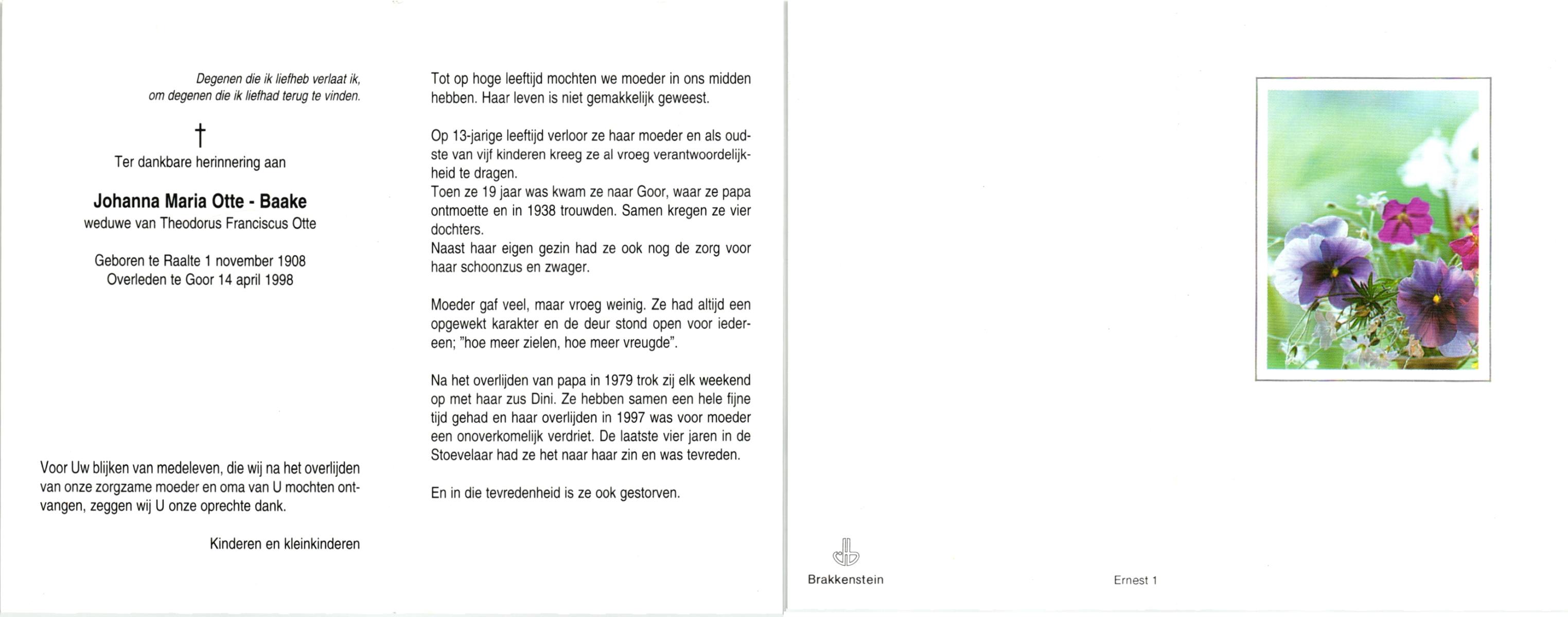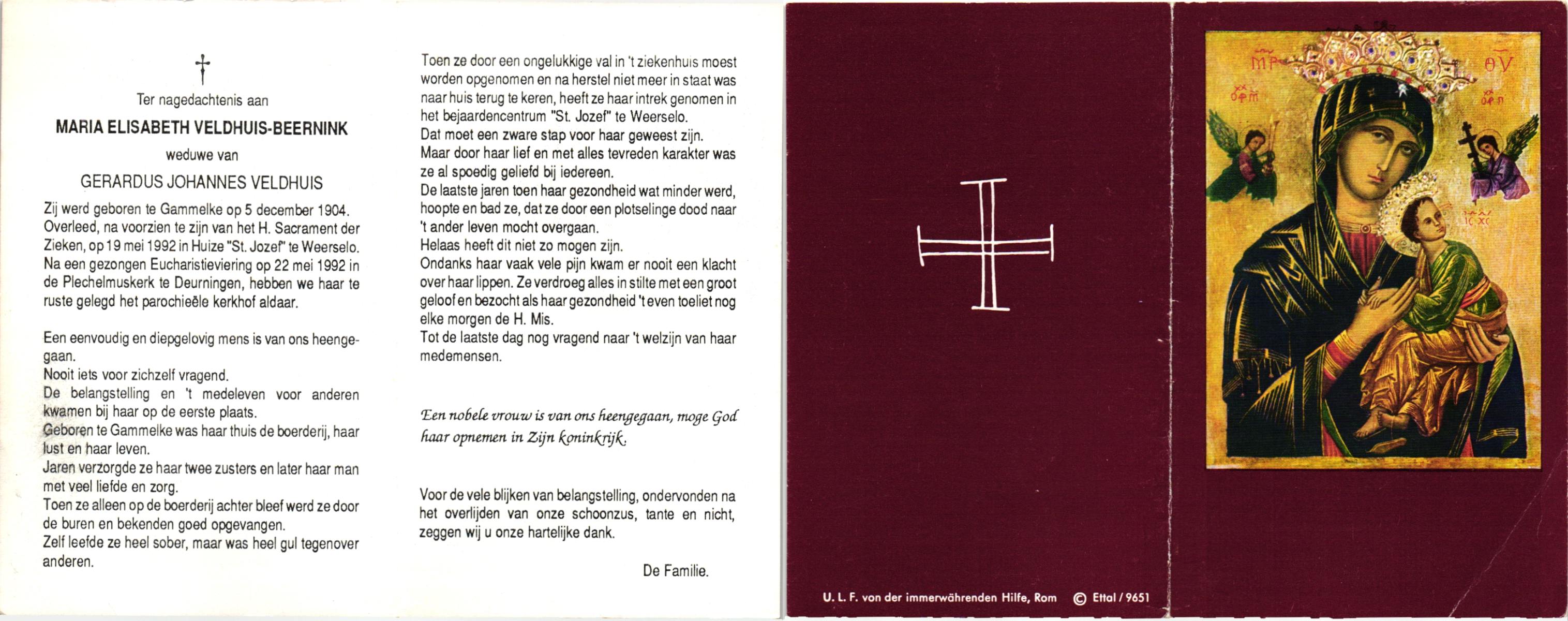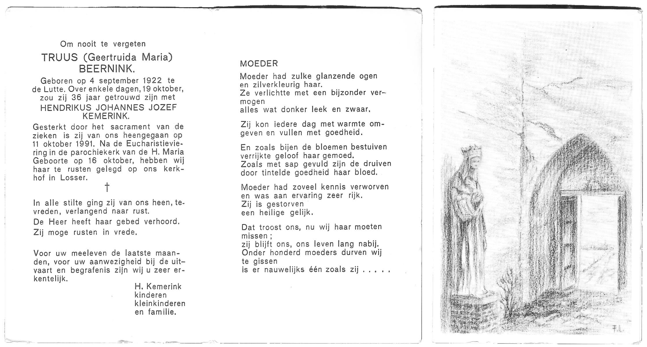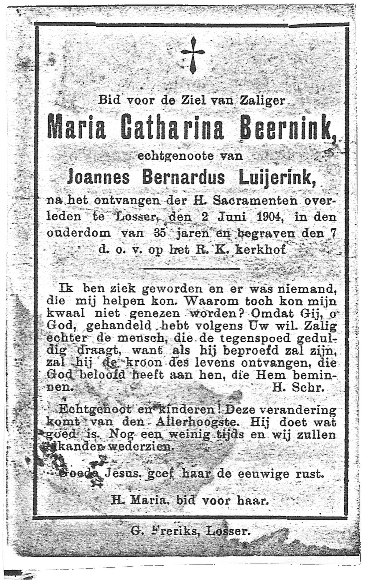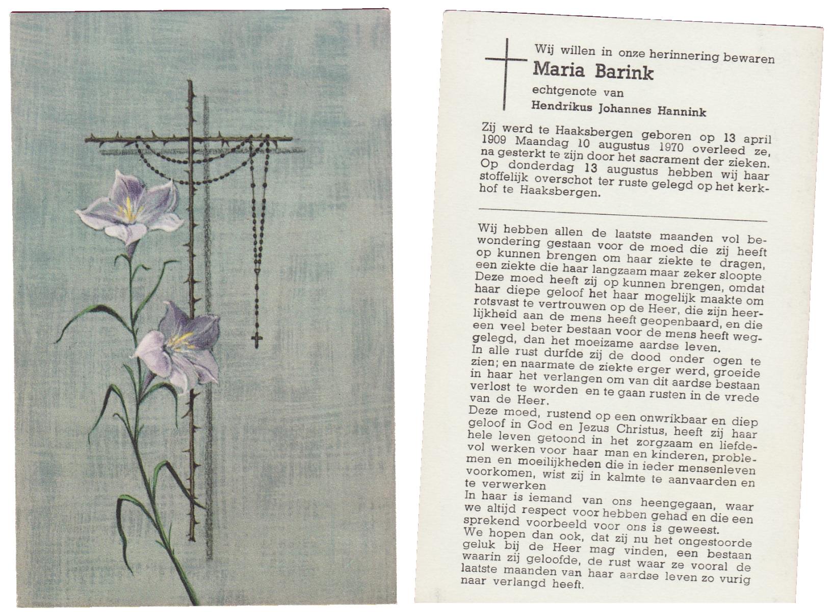 BEIJERINK, Johanna Maria, geboren op 27-2-1901 te Tilligte, overleden op 4-2-1990 te Oldenzaal op 88-jarige leeftijd, begraven op 7-2-1990 te Lattrop.