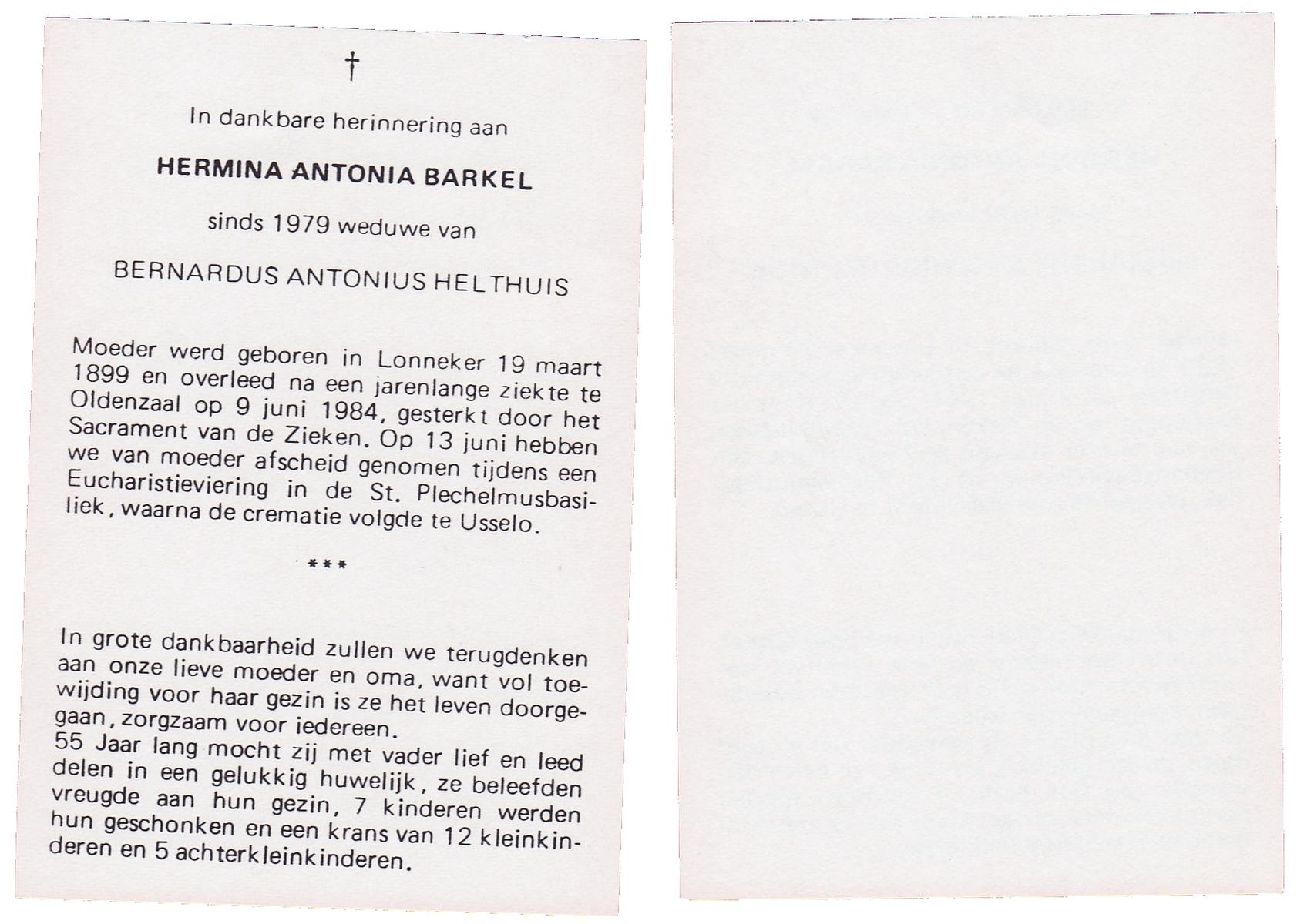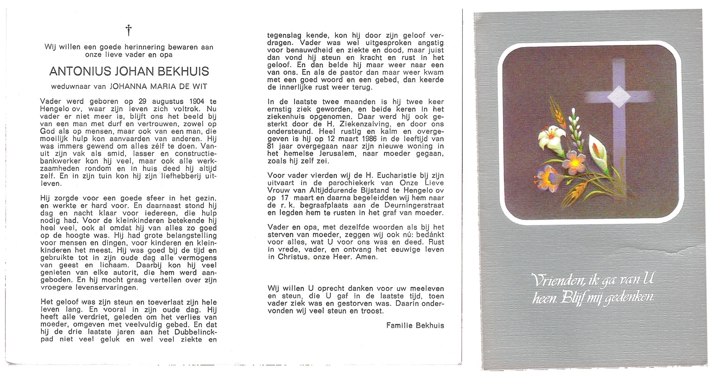 BEKHUIS, Antonius Johan, geboren op 29-8-1904 te Helo, overleden op 12-3-1986 op 81-jarige leeftijd, begraven op 17-3-1986.