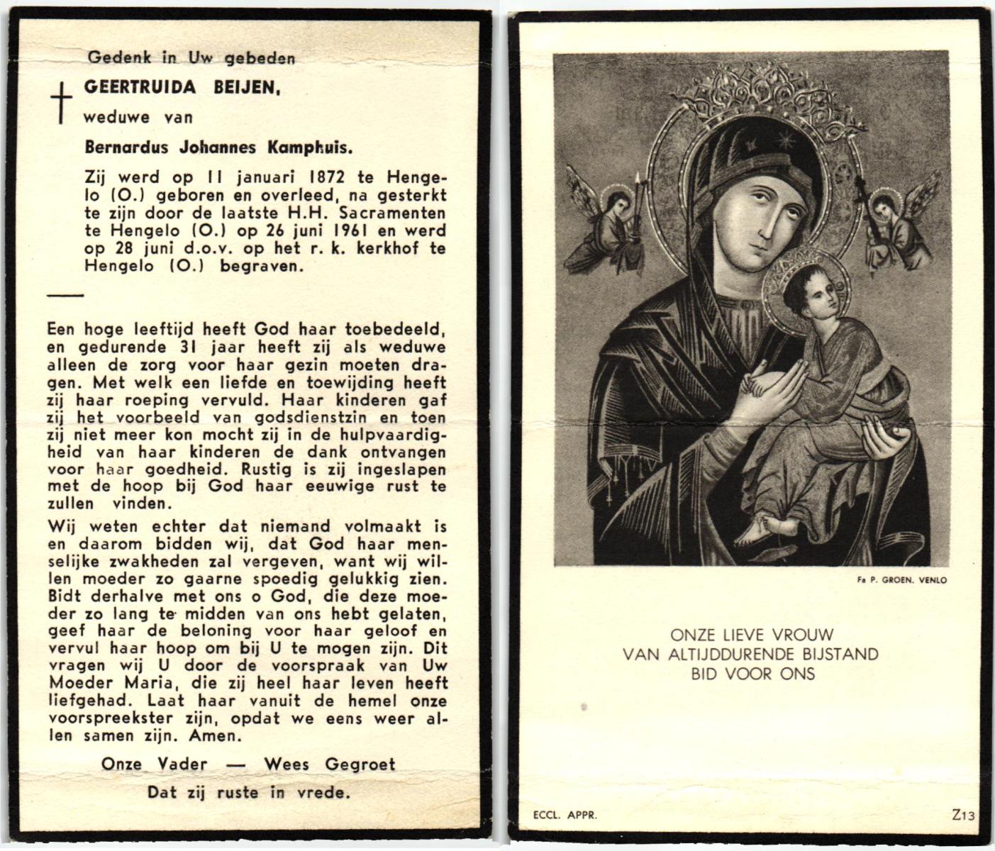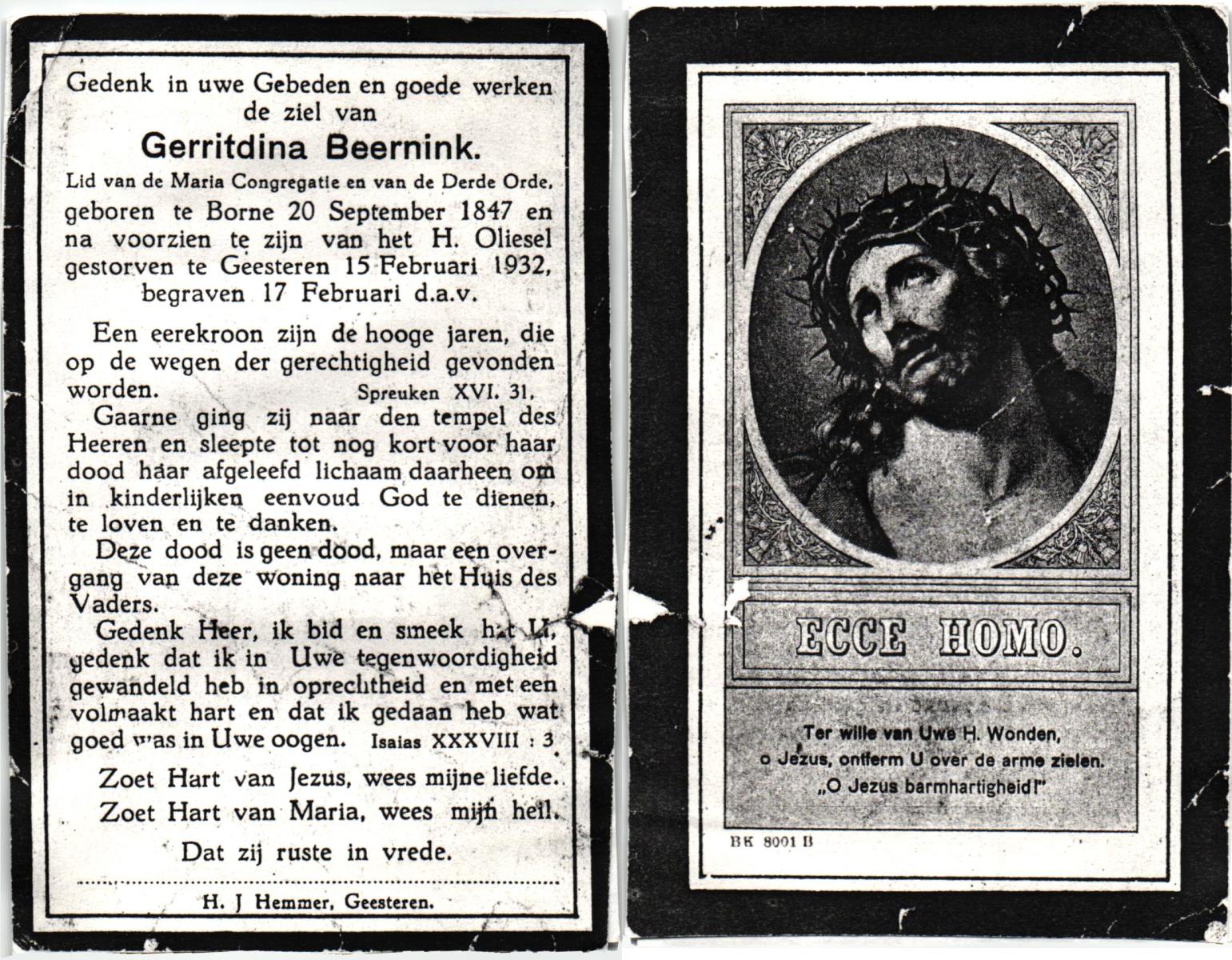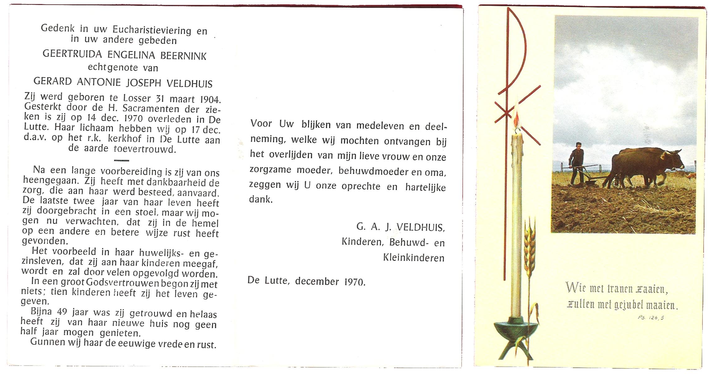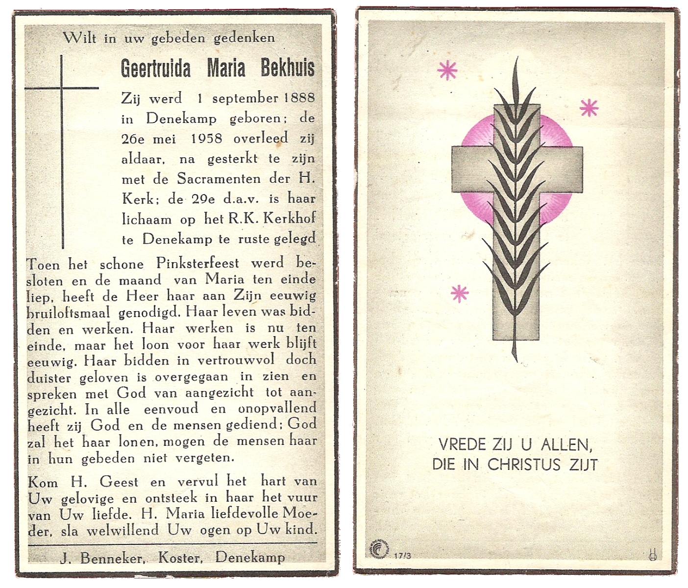 BEKHUIS, Geertruida Maria, geboren op 01-09-1888 te Denekamp, overleden op 26-5-1958 te Denekamp op 70-jarige leeftijd, begraven op 29-5-1958 te Denekamp.