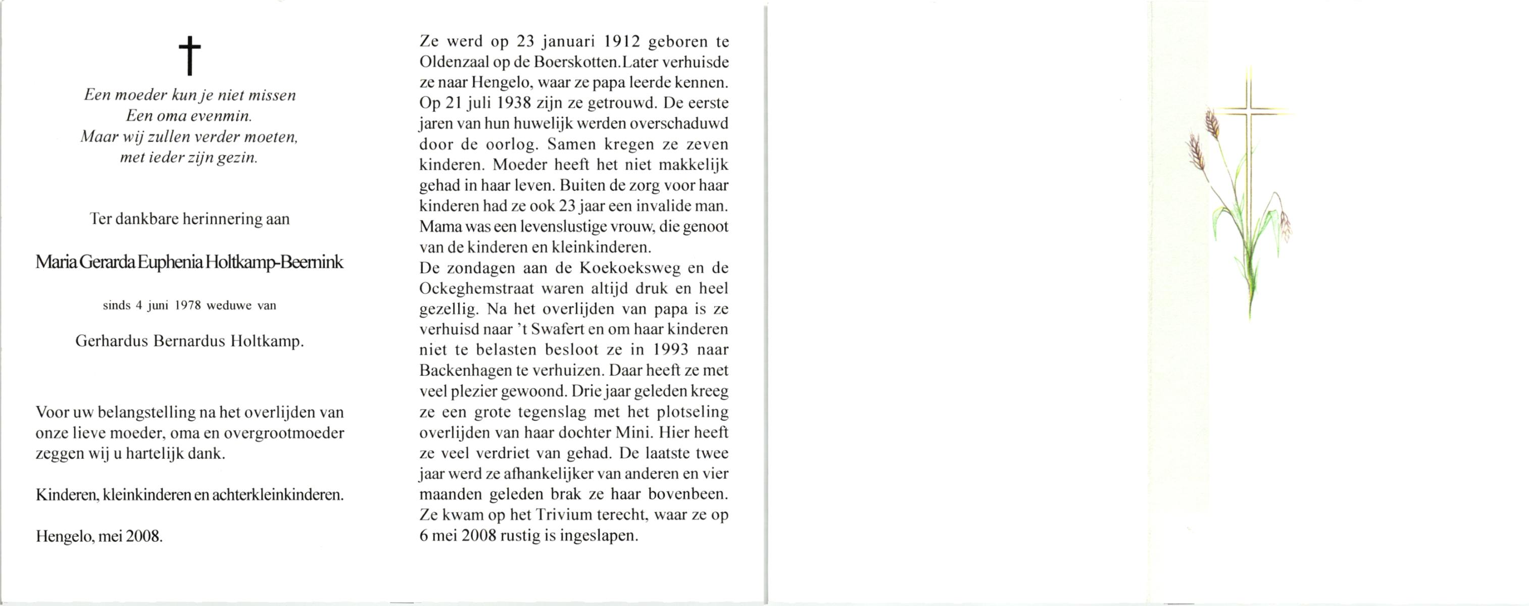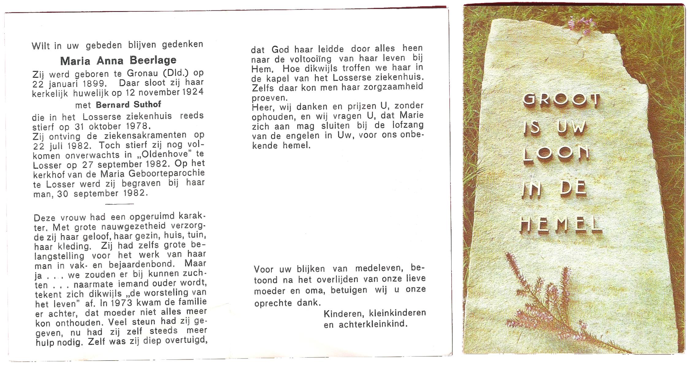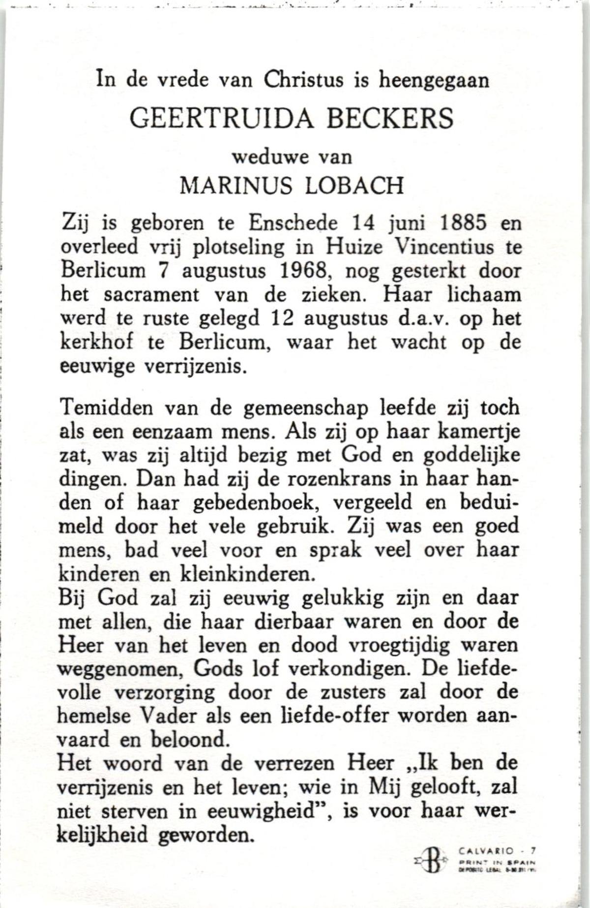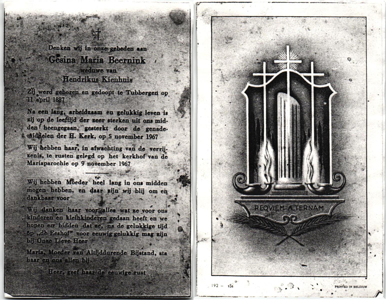 BEKHUIS, Geertruida Maria, geboren op 01-09-1888 te Denekamp, overleden op 26-5-1958 te Denekamp op 70-jarige leeftijd, begraven op 29-5-1958 te Denekamp.