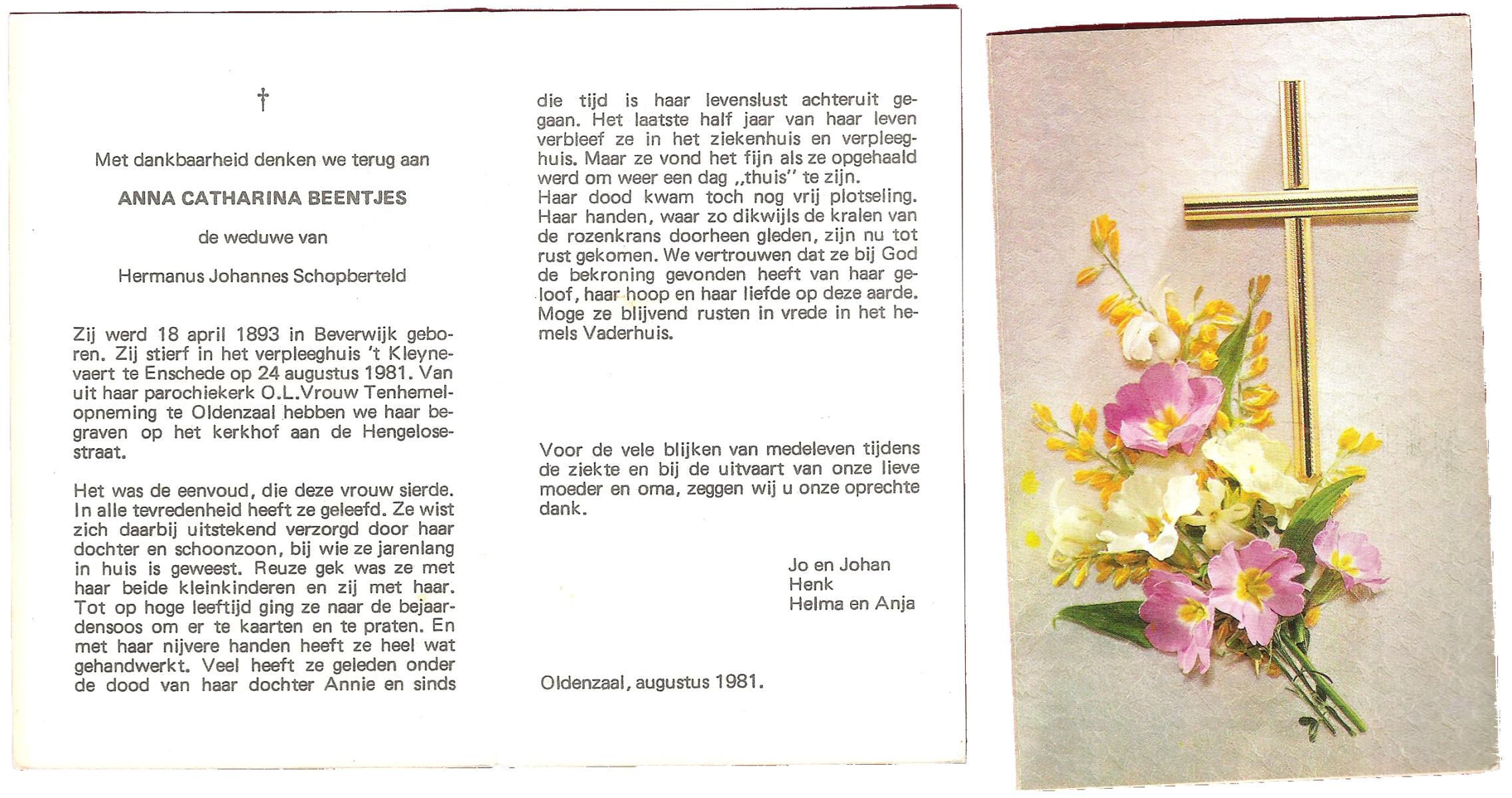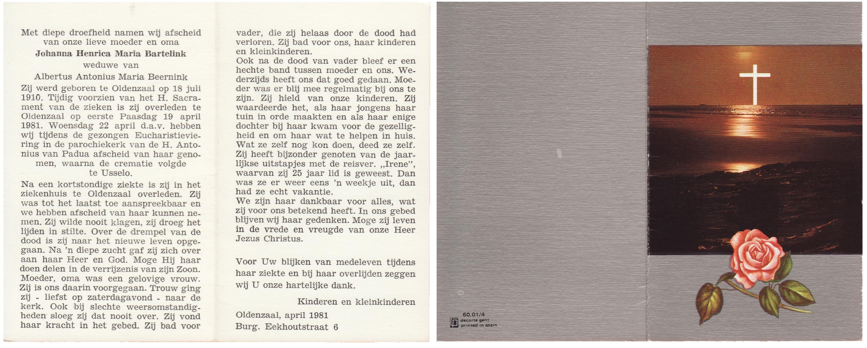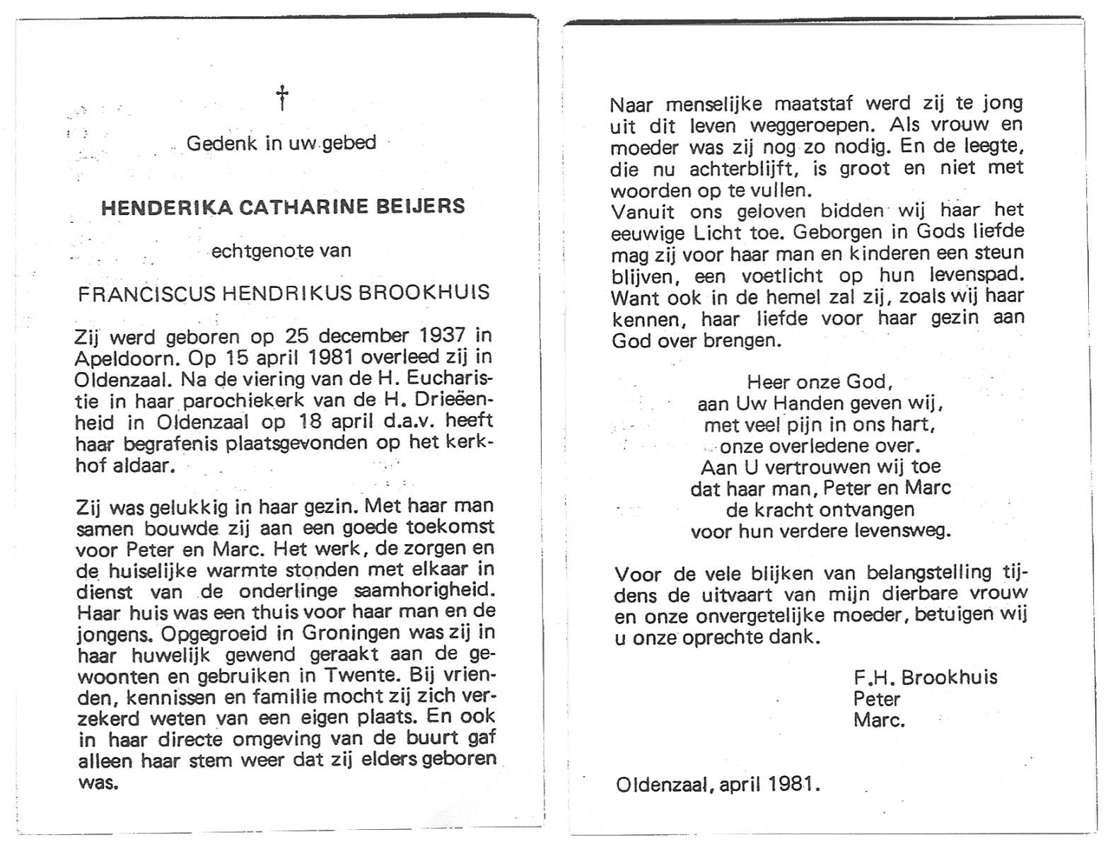 BEIJERS, Hendrika Catharine, geboren op 25-12-1937 te Apeldoorn, overleden op 15-4-1981 te Oldenzaal op 43-jarige leeftijd, begraven op 18-4-1981 te Oldenzaal.