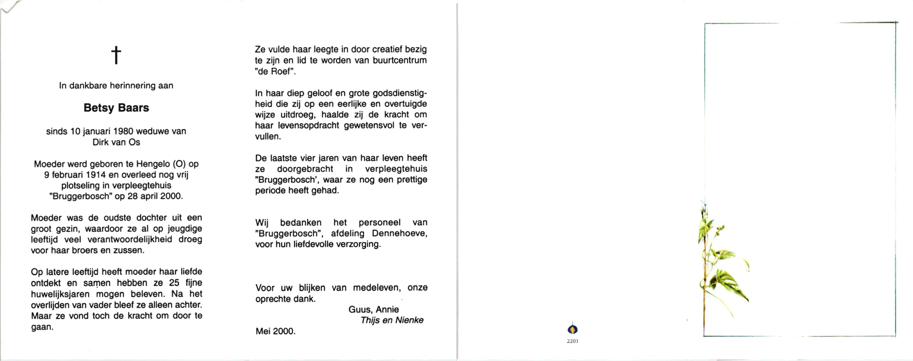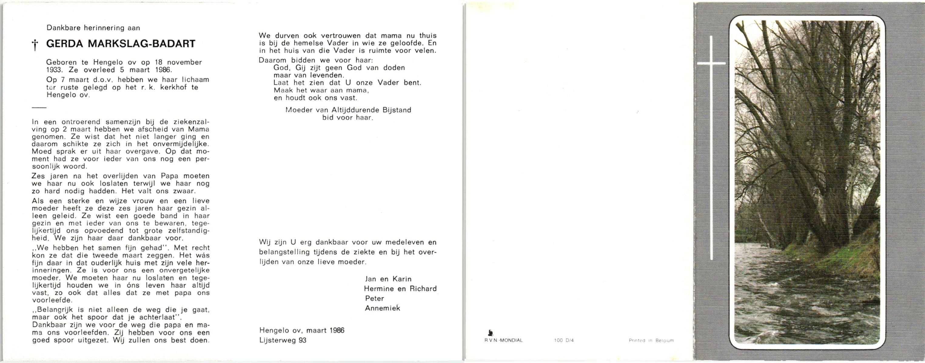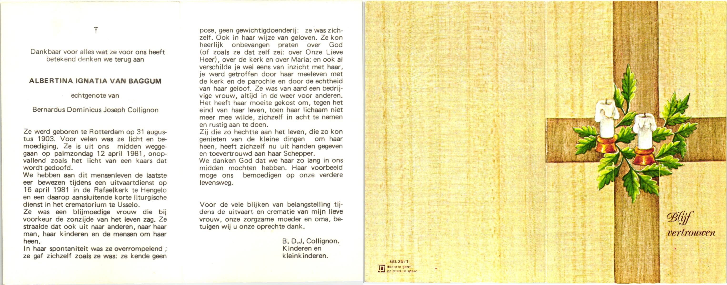 BEIJERS, Hendrika Catharine, geboren op 25-12-1937 te Apeldoorn, overleden op 15-4-1981 te Oldenzaal op 43-jarige leeftijd, begraven op 18-4-1981 te Oldenzaal.