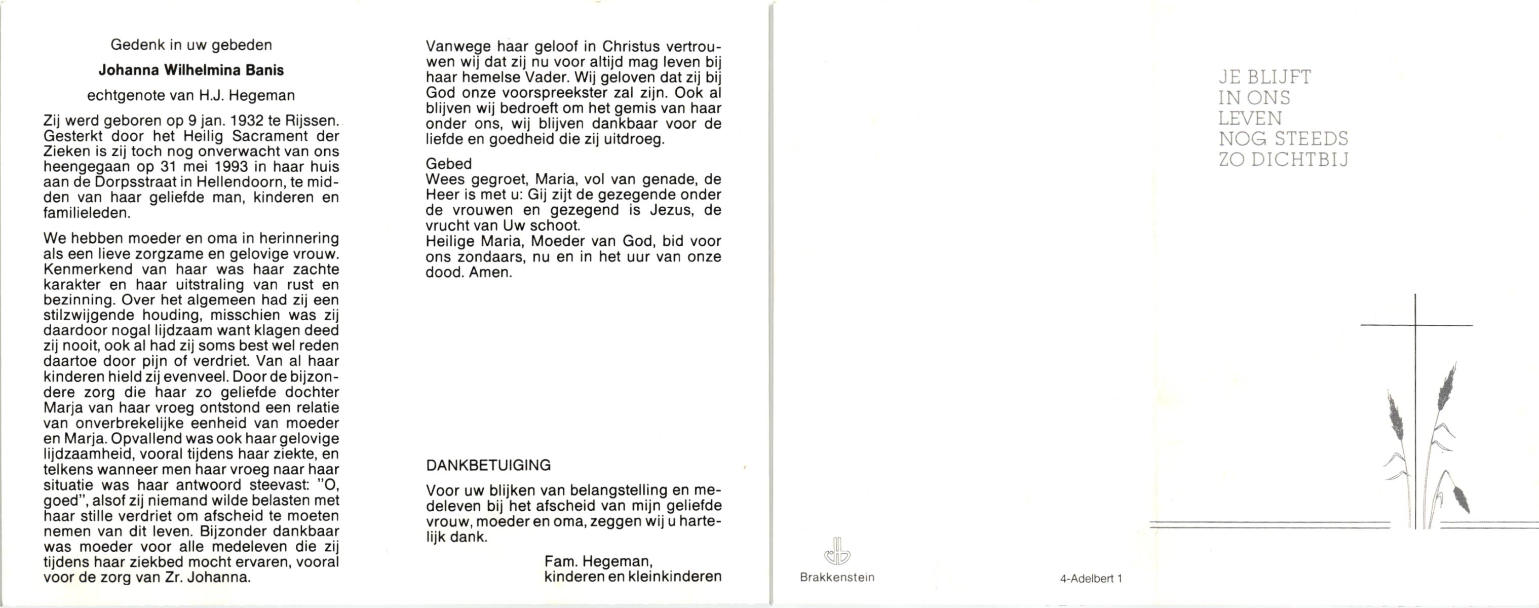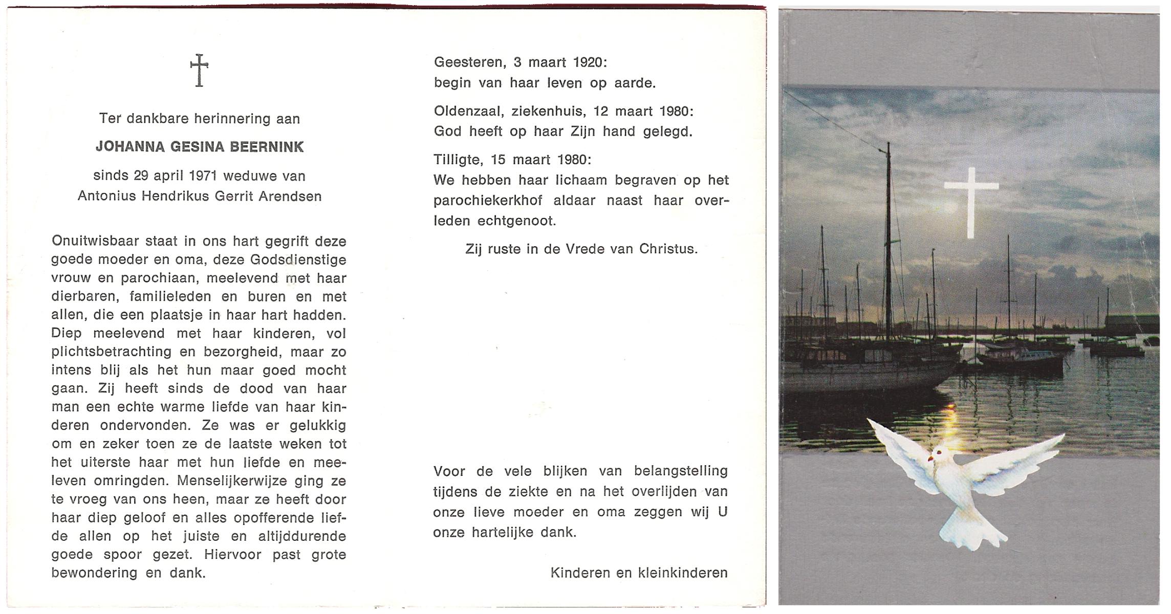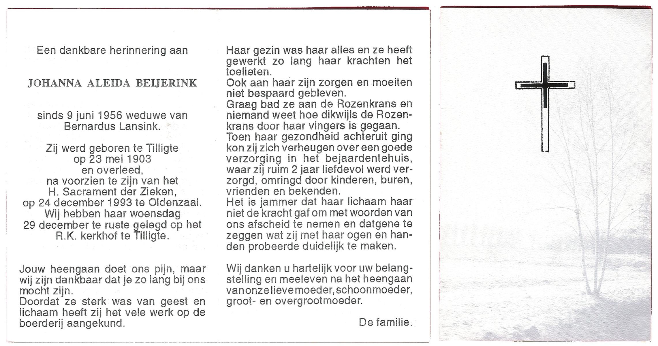 BEIJERINK, Johanna Aleida, geboren op 23-5-1903 te Tilligte, overleden op 24-12-1993 te Tilligte op 90-jarige leeftijd, begraven op 29-12-1993 te Tilligte.