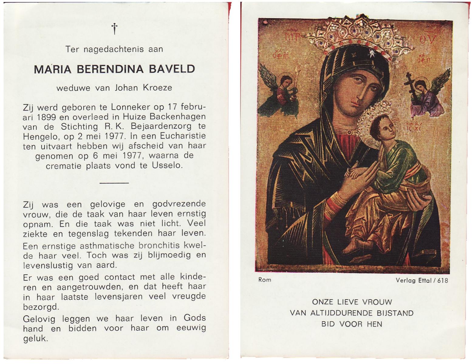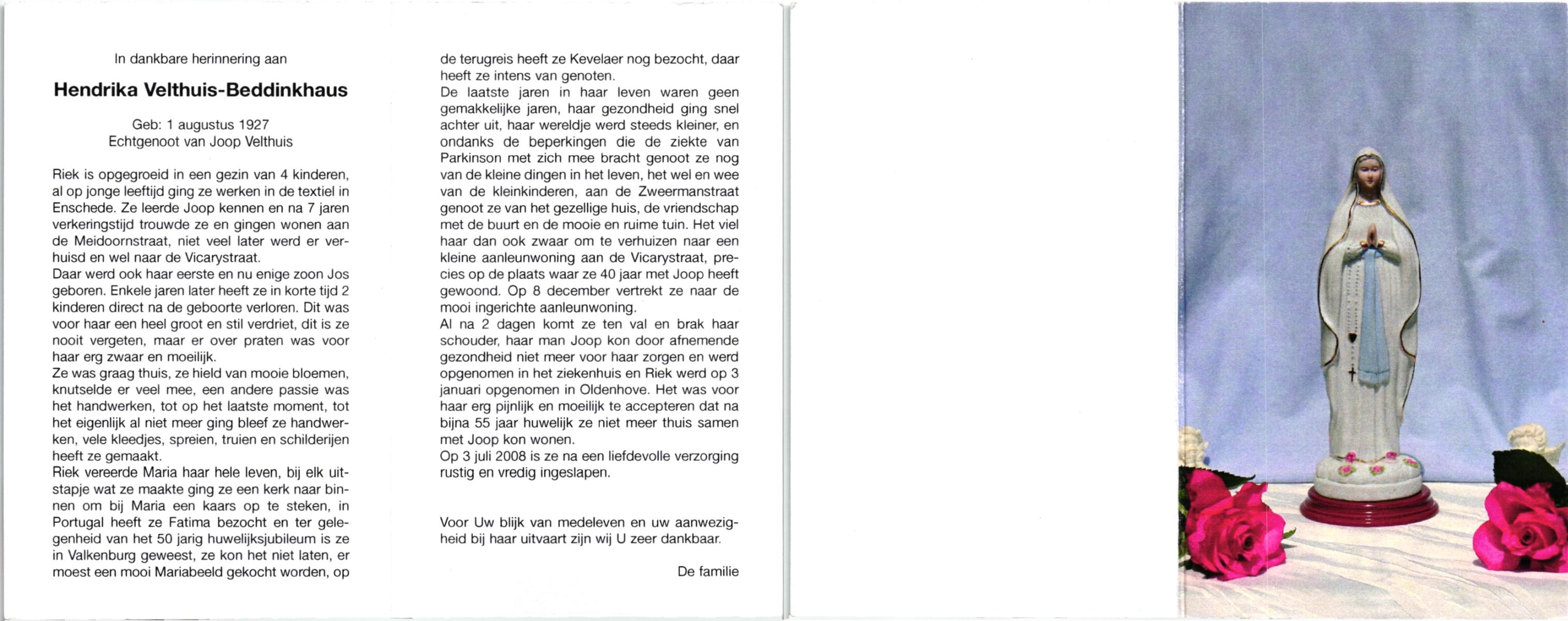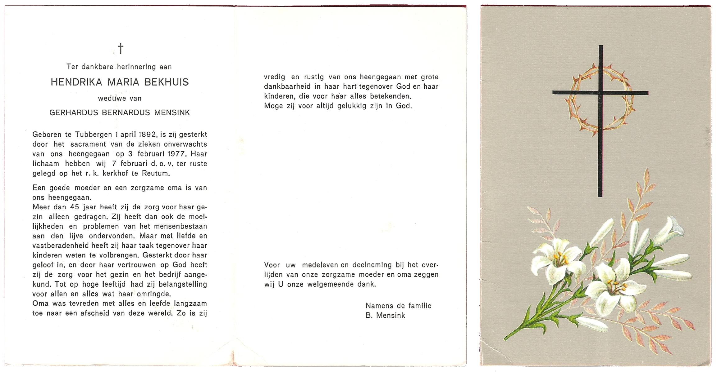 BEKHUIS, Hendrika Maria, geboren op 01-04-1892 te Tubbergen, overleden op 3-2-1977 op 84-jarige leeftijd, begraven op 7-2-1977 te Reutum.