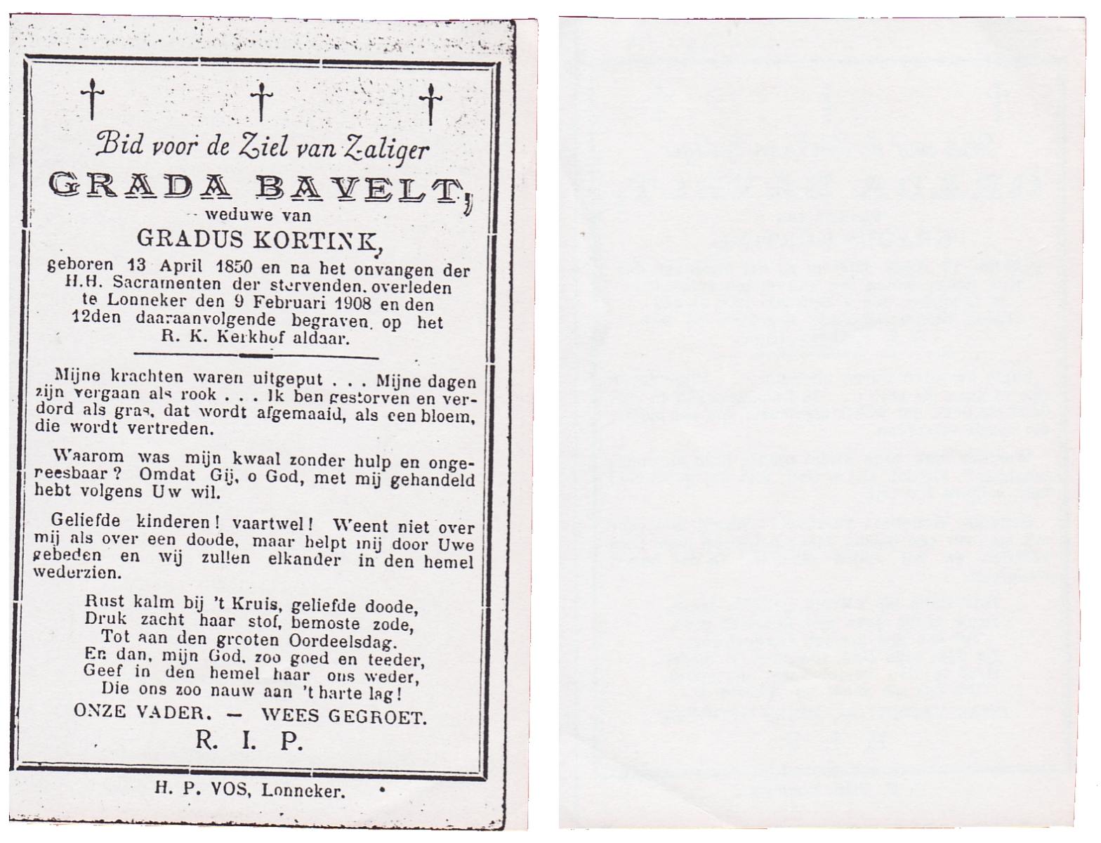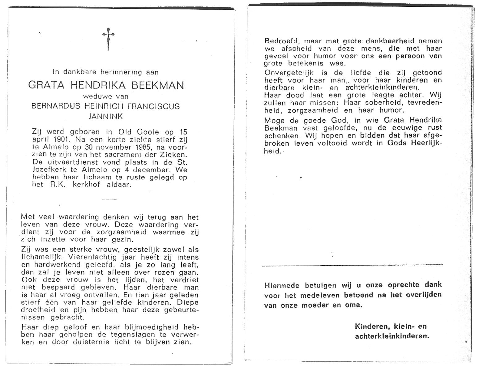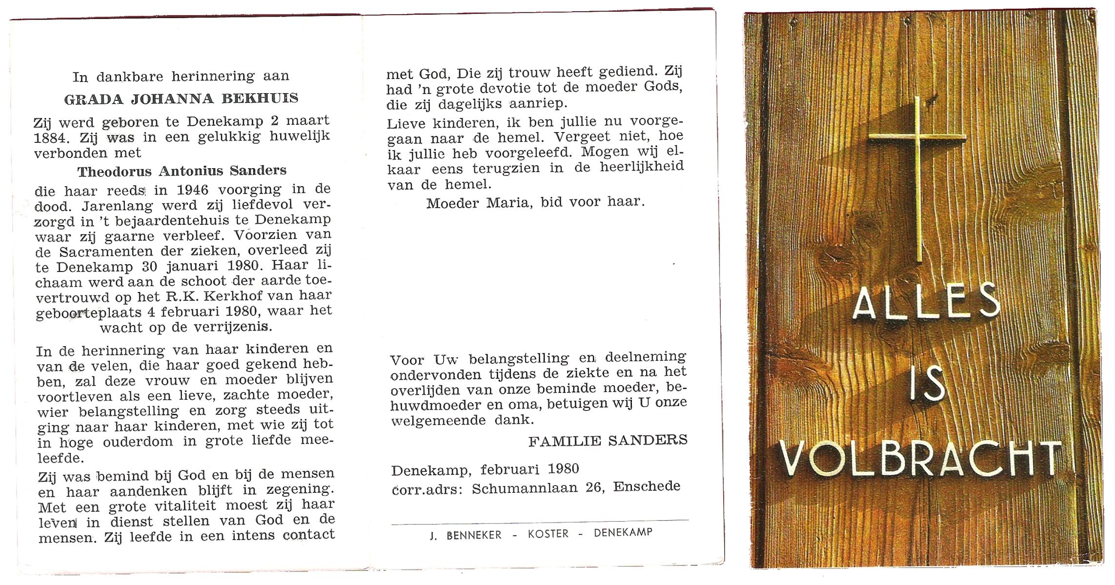 BEKHUIS, Grada Johanna, geboren op 02-03-1884 te Denekamp, overleden op 30-1-1980 te Denekamp op 96-jarige leeftijd, begraven op 4-2-1980 te Denekamp.
