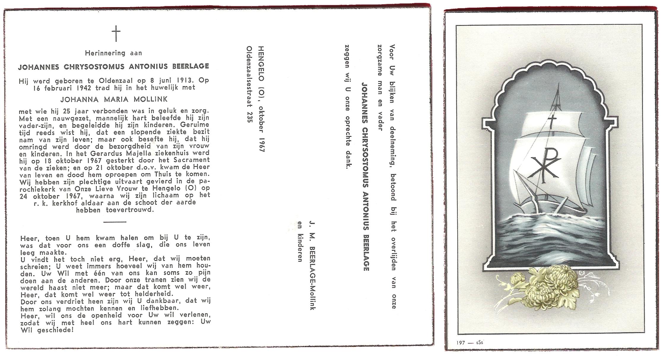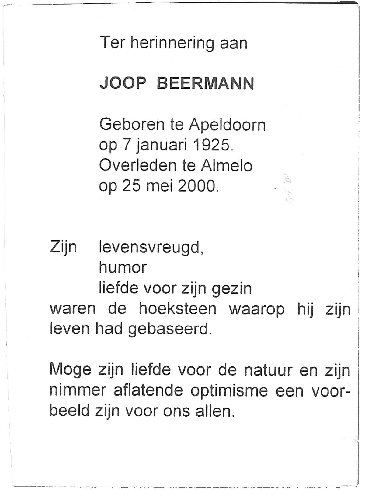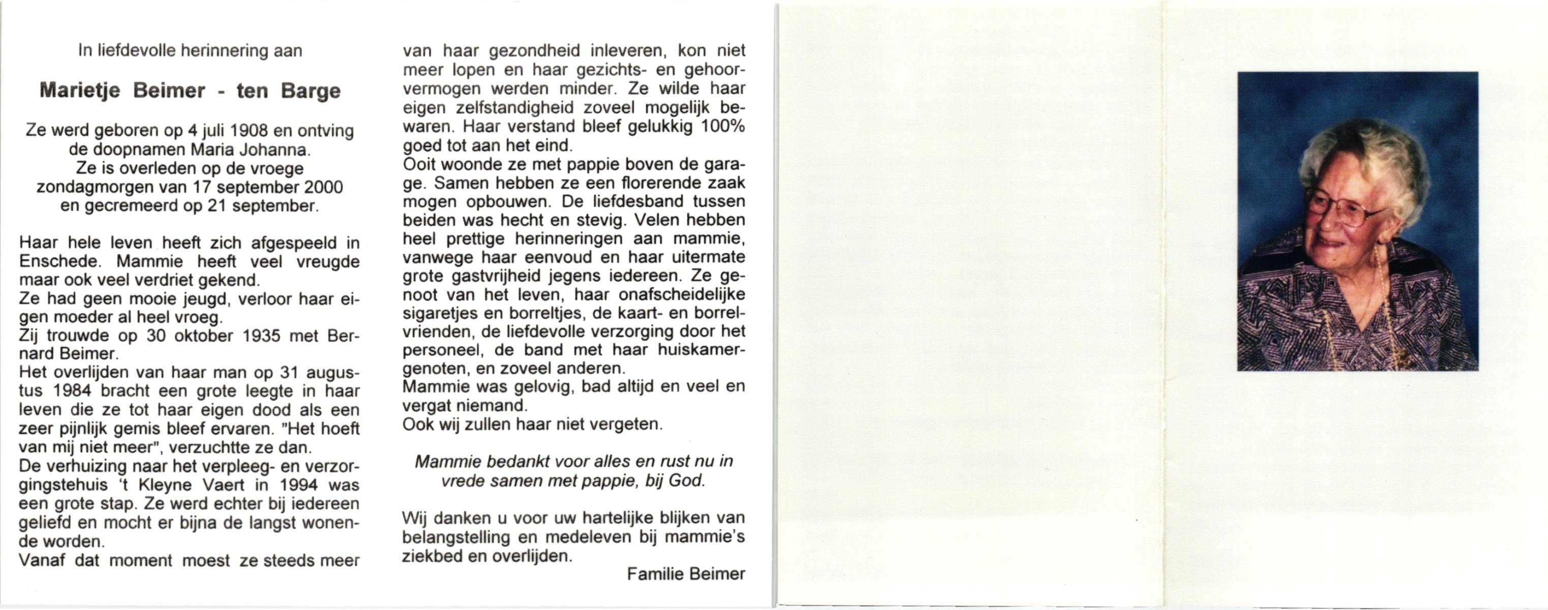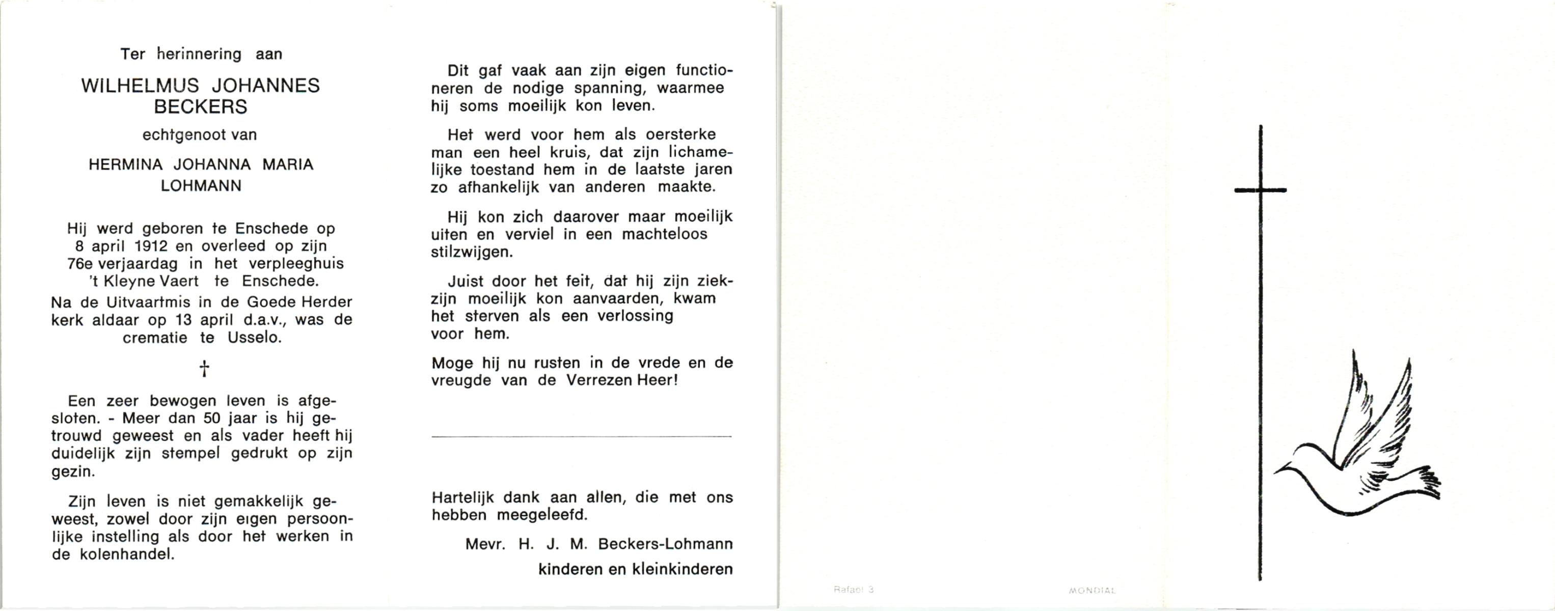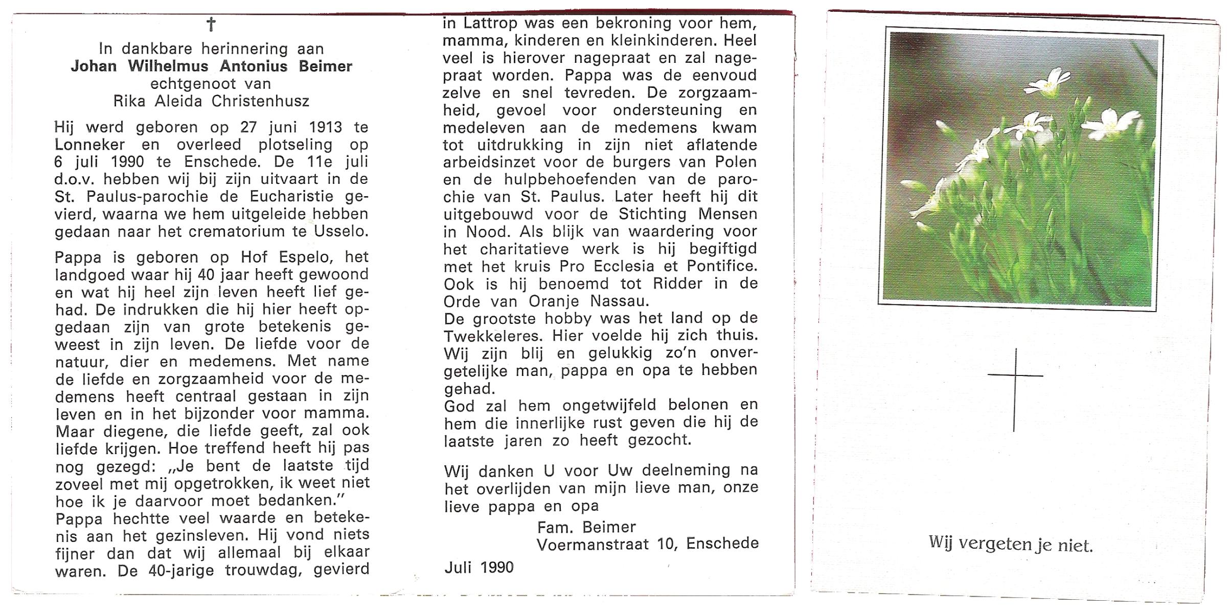 BEIMER, Johan Wilhelmus Antonius, geboren op 27-6-1913 te Lonneker, overleden op 6-7-1990 te Enschede op 77-jarige leeftijd, gecremeerd te Usselo.