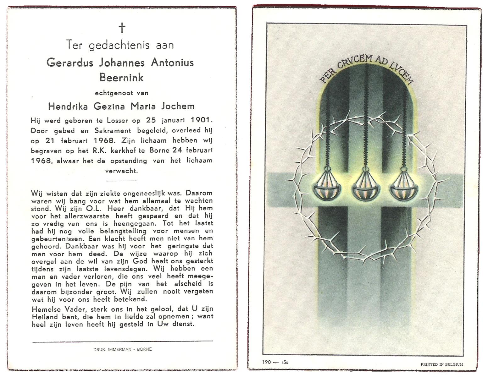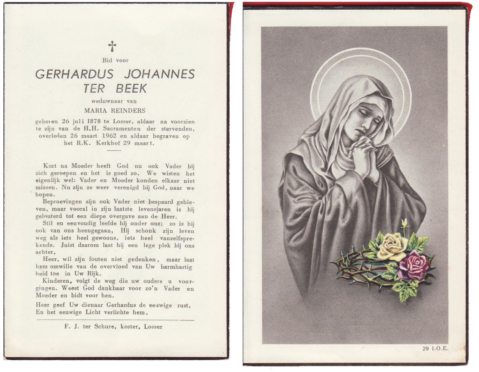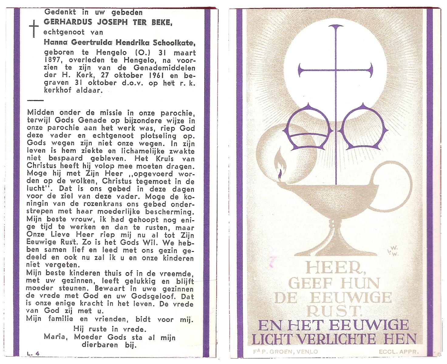 BEKE, ter, Gerhardus Joseph, geboren op 31-03-1897 te Hengelo (O), overleden op 27-10-1961 te Hengelo (Ov.) op 64-jarige leeftijd, begraven op 31-10-1961 te Hengelo (Ov.).