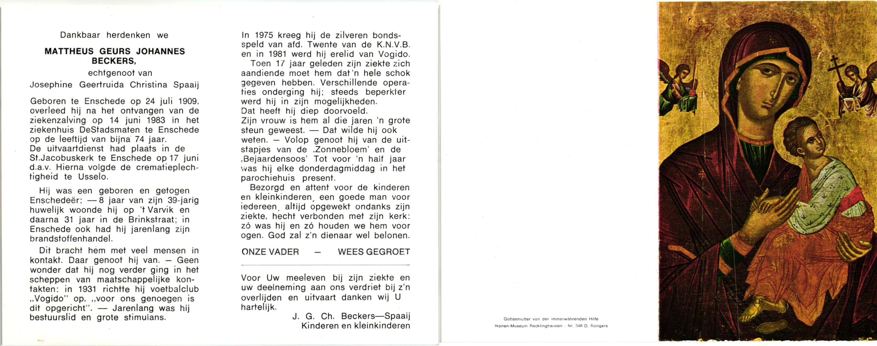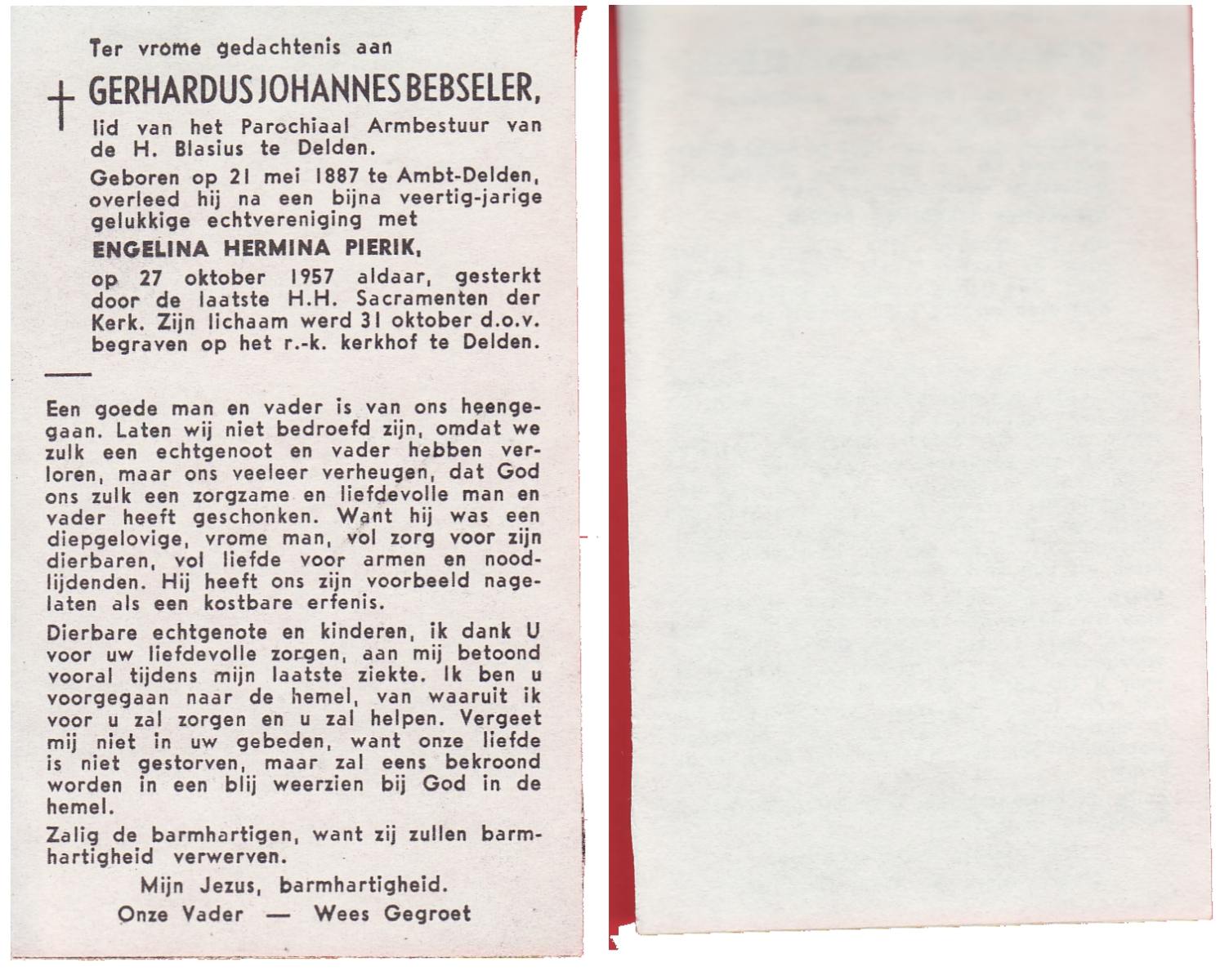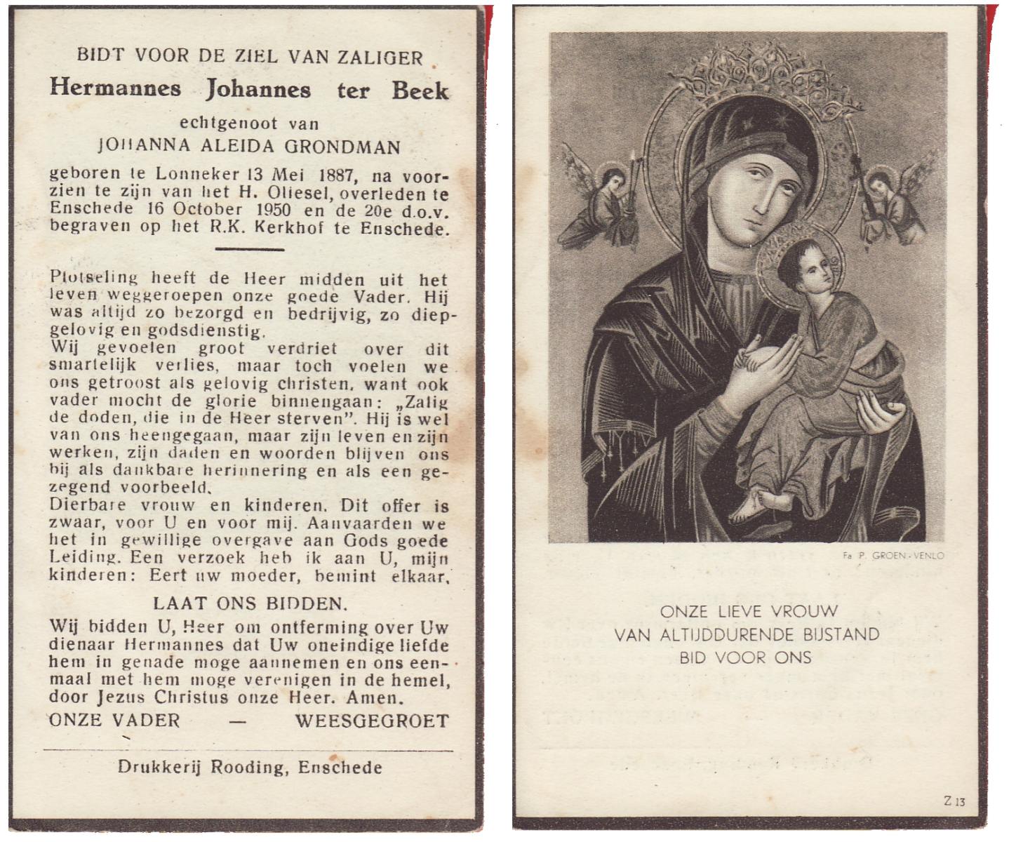 BEKE, ter, Gerhardus Joseph, geboren op 31-03-1897 te Hengelo (O), overleden op 27-10-1961 te Hengelo (Ov.) op 64-jarige leeftijd, begraven op 31-10-1961 te Hengelo (Ov.).