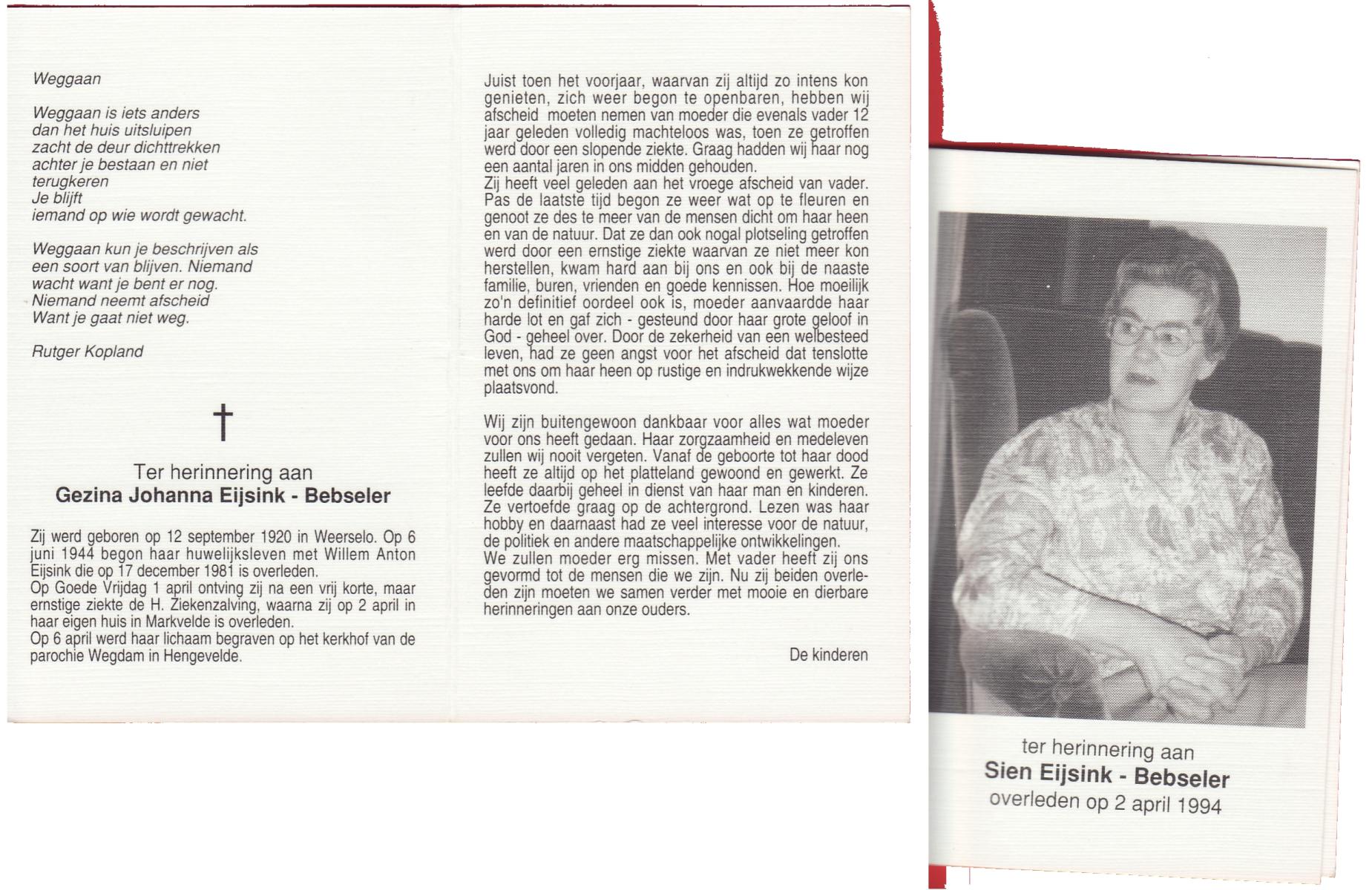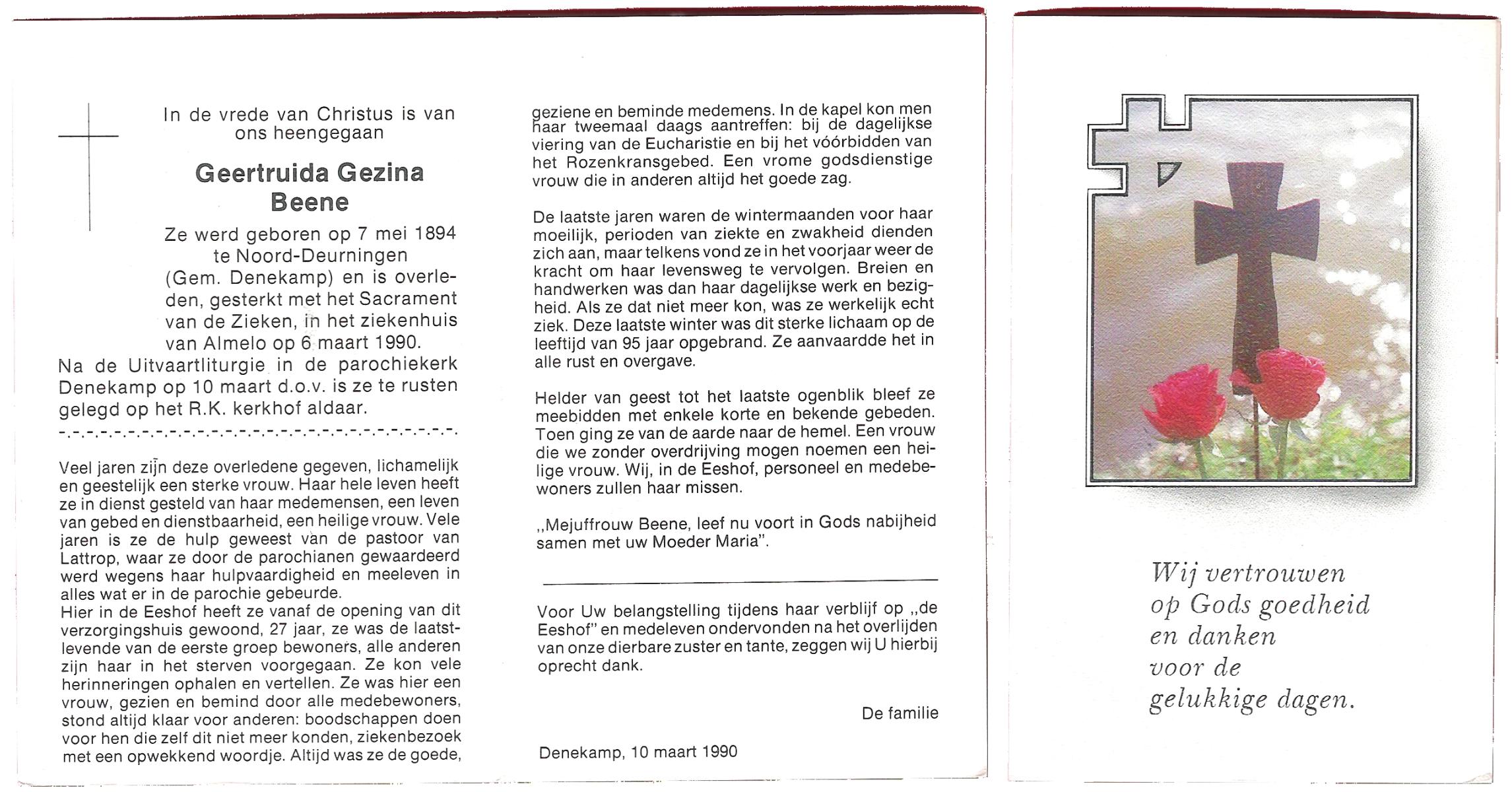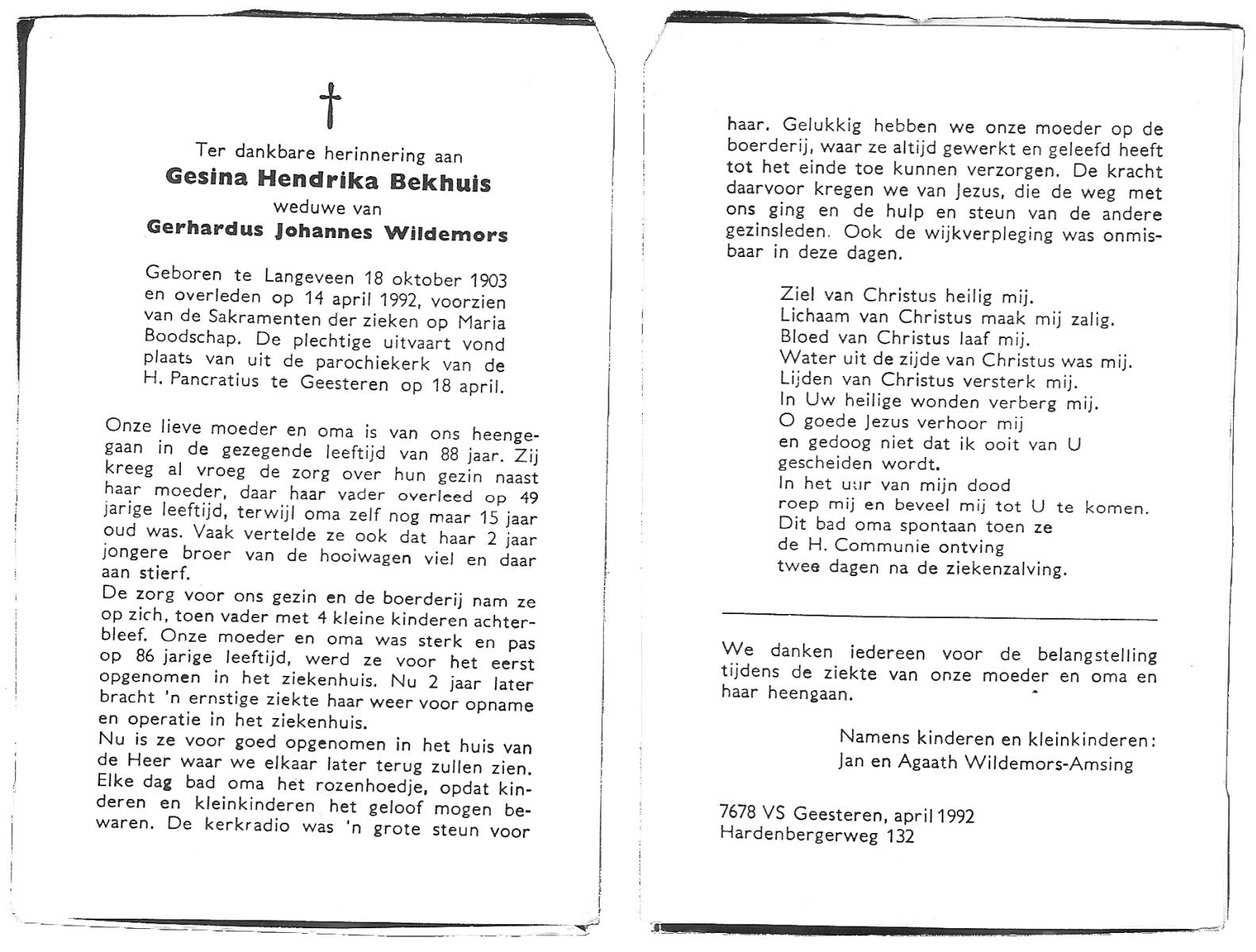 BEKHUIS, Gesina Hendrika, geboren op 18-10-1903 te Langeveen, overleden op 14-4-1992 op 88-jarige leeftijd, begraven op 18-4-1992 te Geesteren R.K.kerkhof.