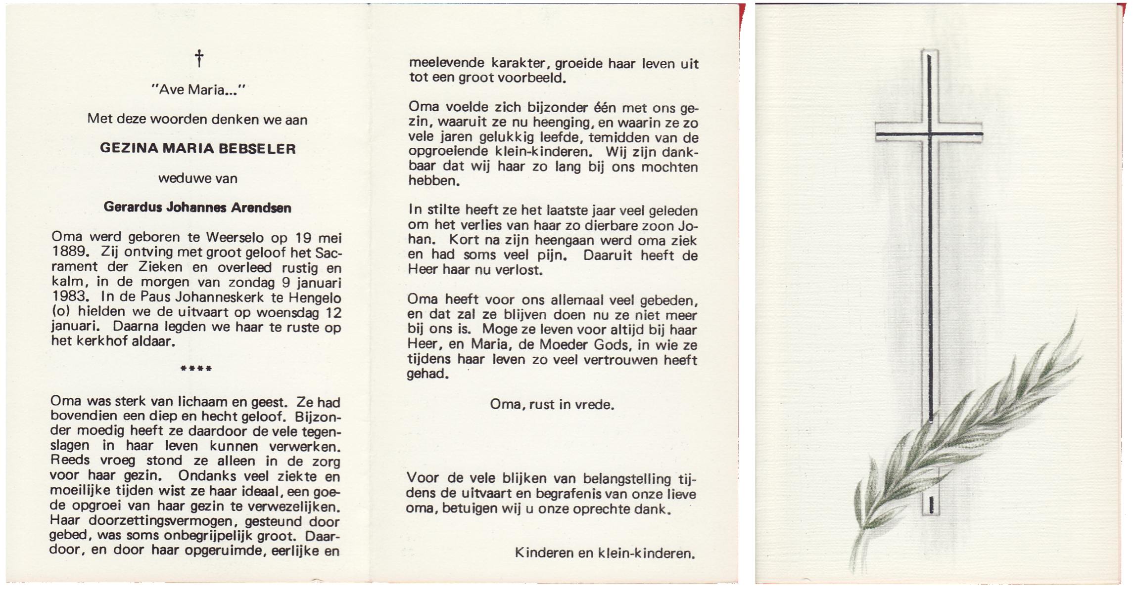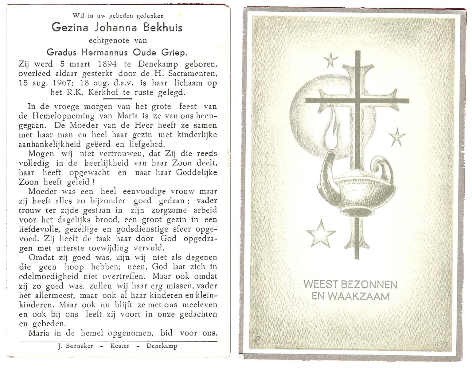 BEKHUIS, Gezina Johanna, geboren op 05-03-1894 te Denekamp, overleden op 15-8-1967 te Denekamp op 73-jarige leeftijd, begraven op 18-8-1967 te Denekamp.