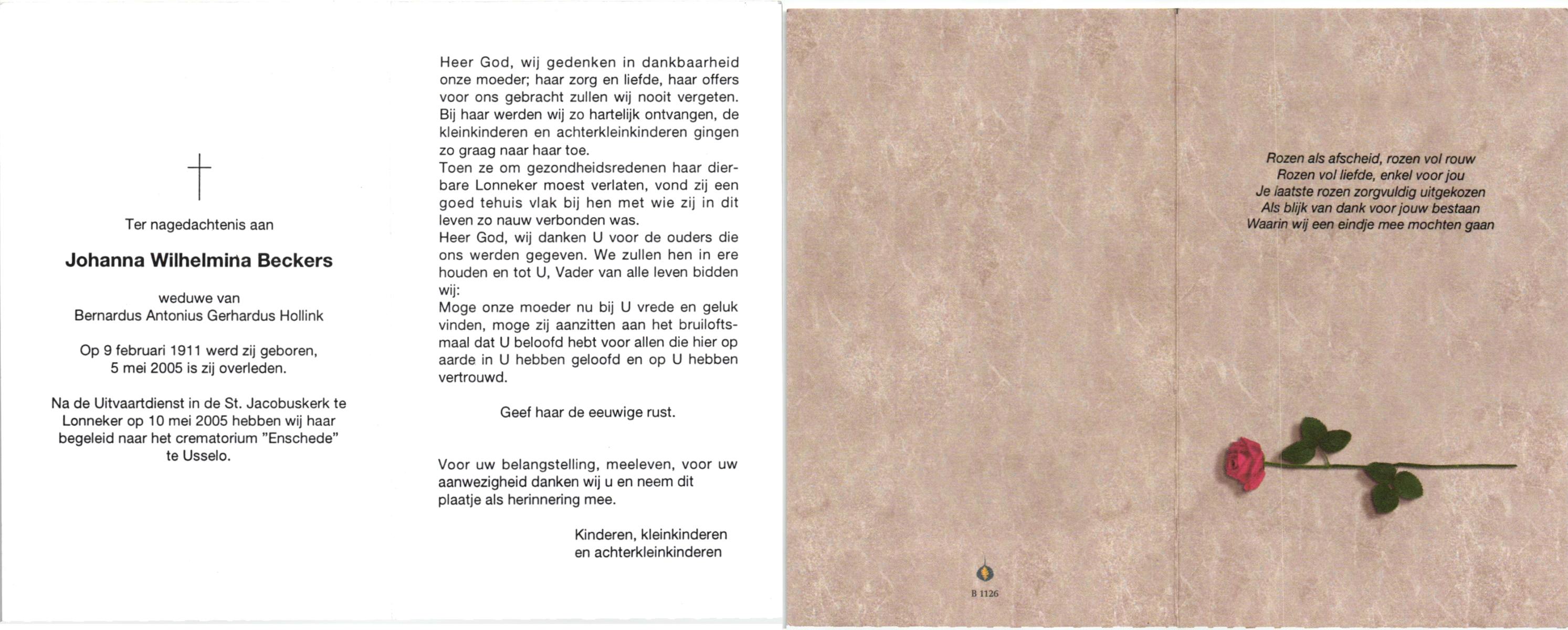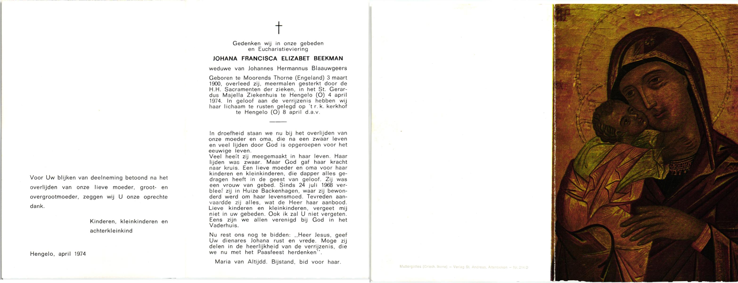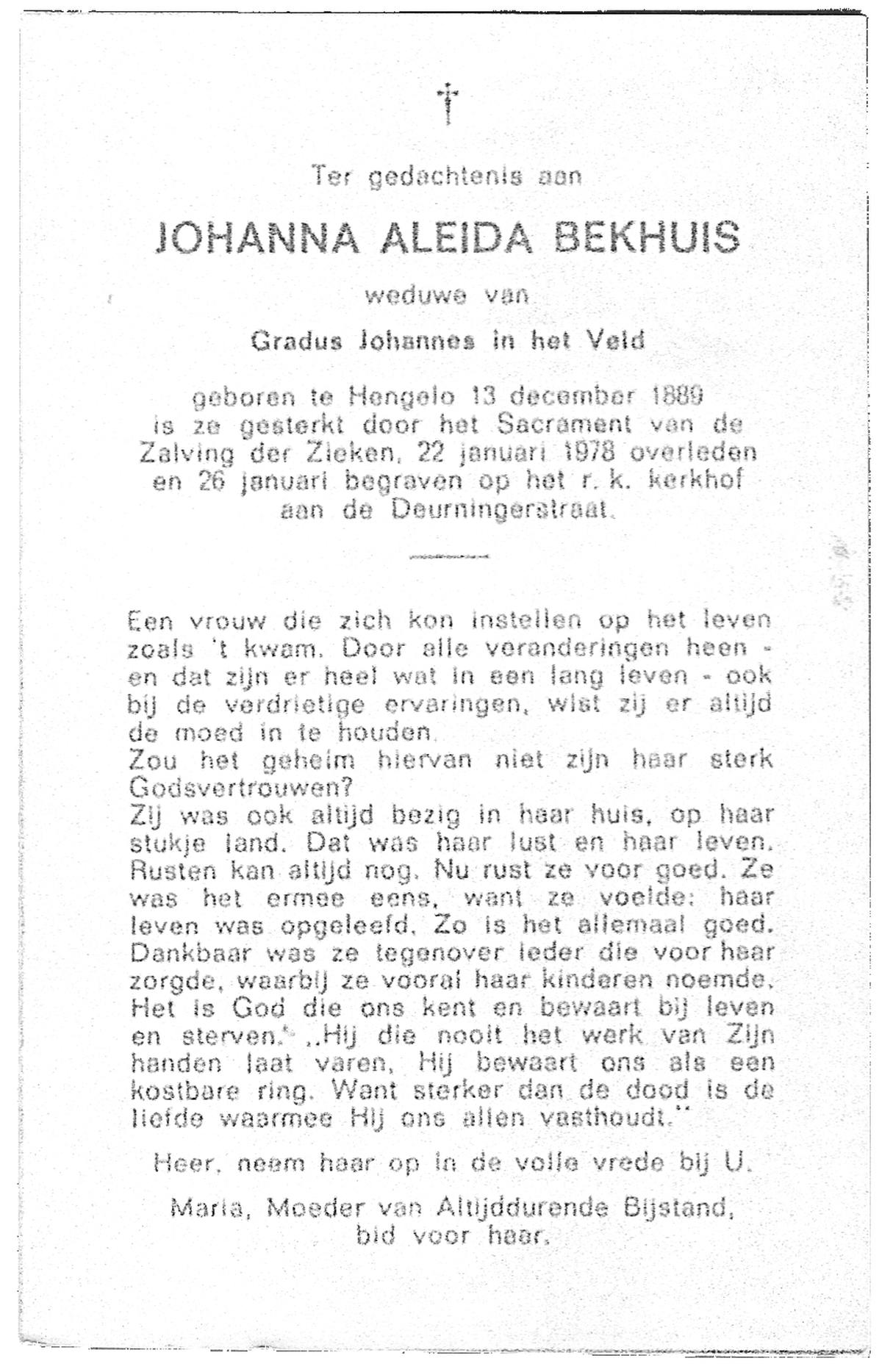 BEKHUIS, Johanna Aleida, geboren op 13-12-1889 te Hengelo (O), overleden op 22-1-1978 op 89-jarige leeftijd, begraven op 26-1-1978 te Hengelo (Ov.).