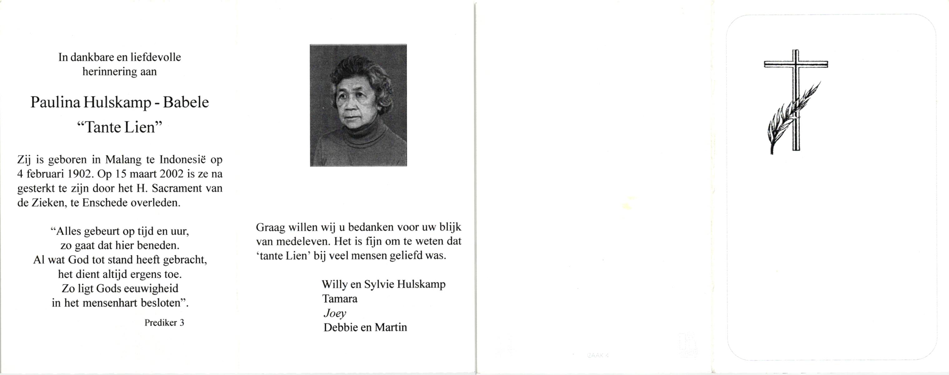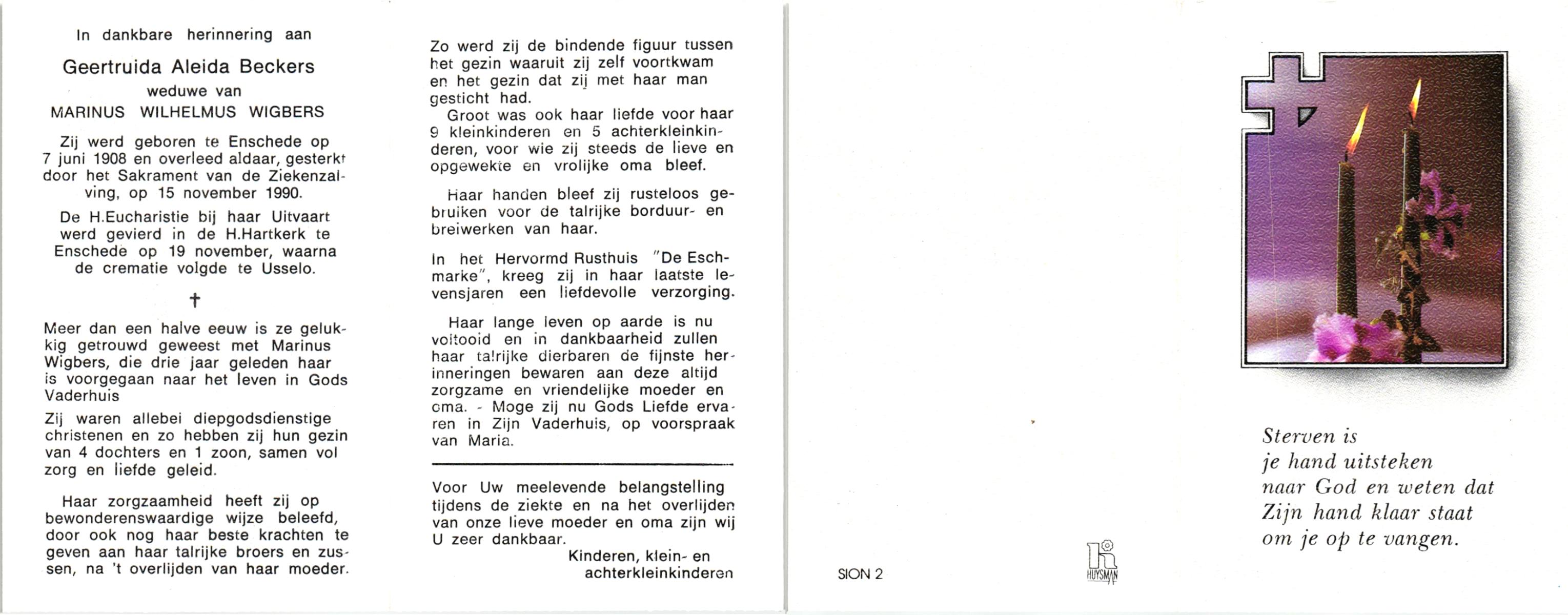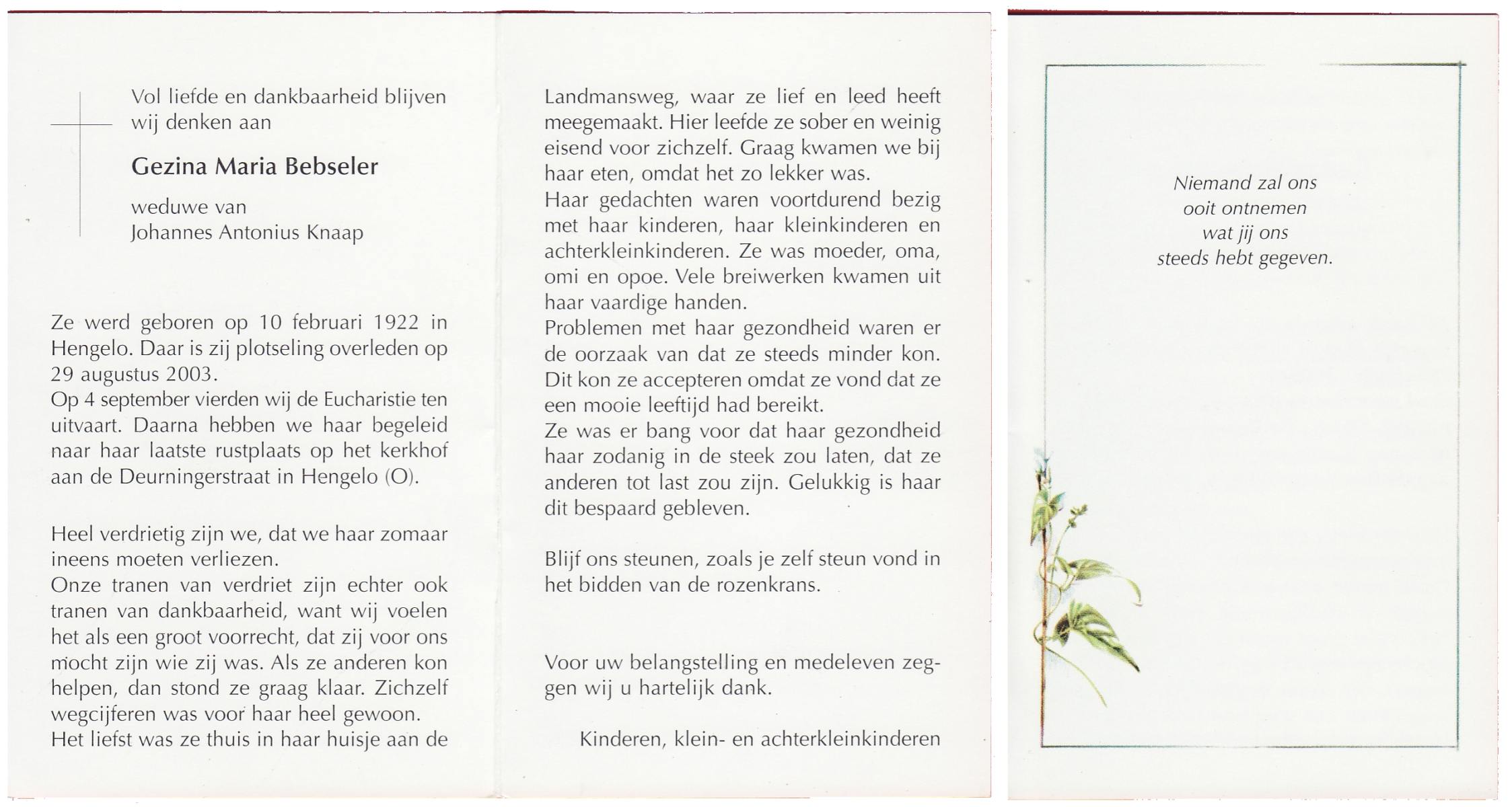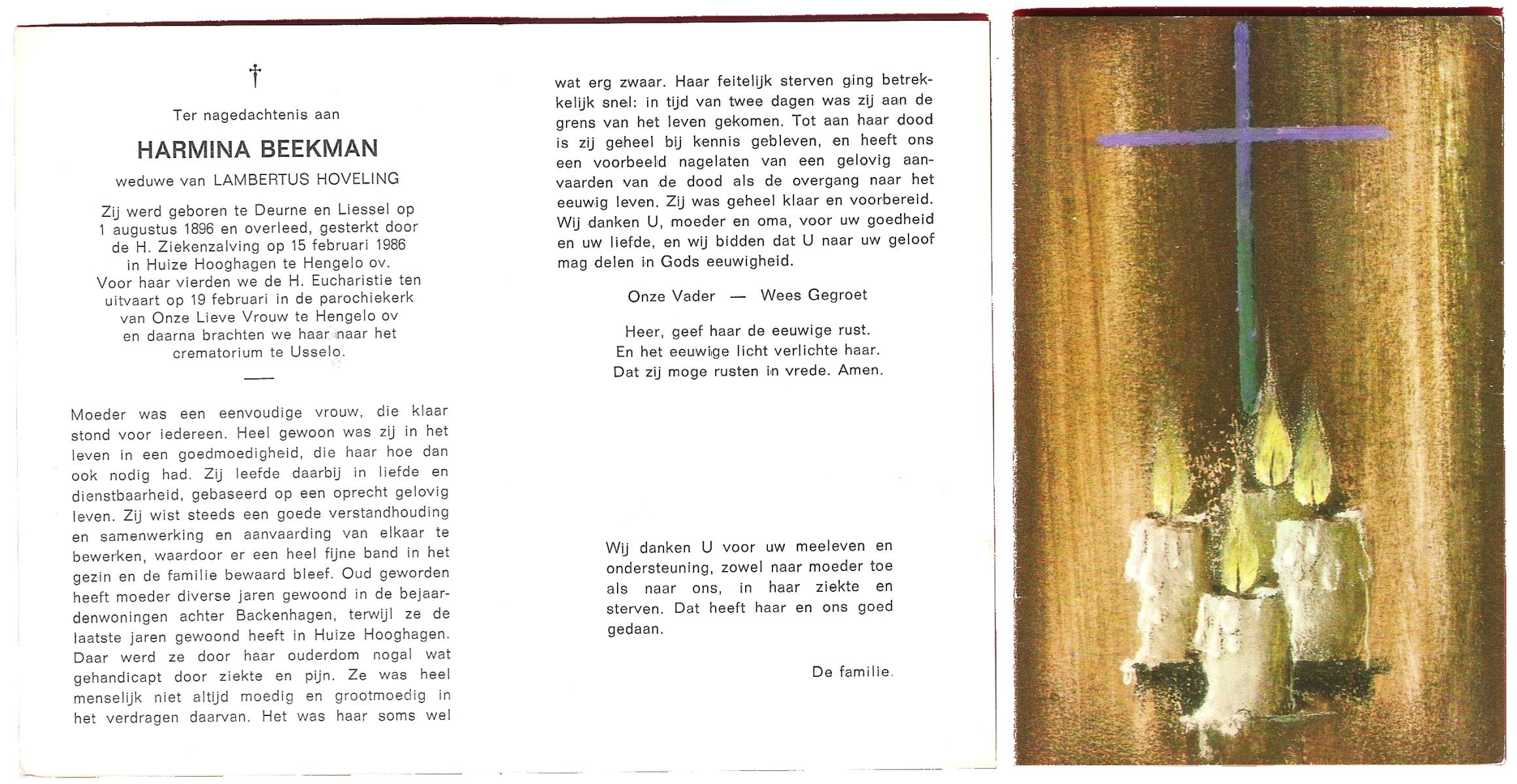 BEKHUIS, Johanna Aleida, geboren op 13-12-1889 te Hengelo (O), overleden op 22-1-1978 op 89-jarige leeftijd, begraven op 26-1-1978 te Hengelo (Ov.).