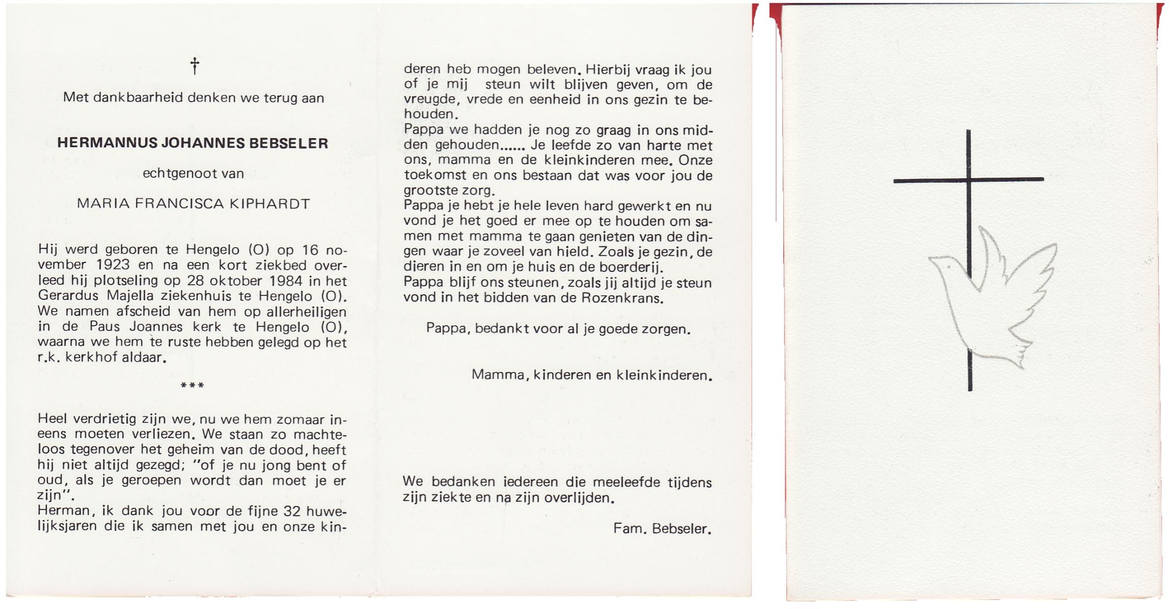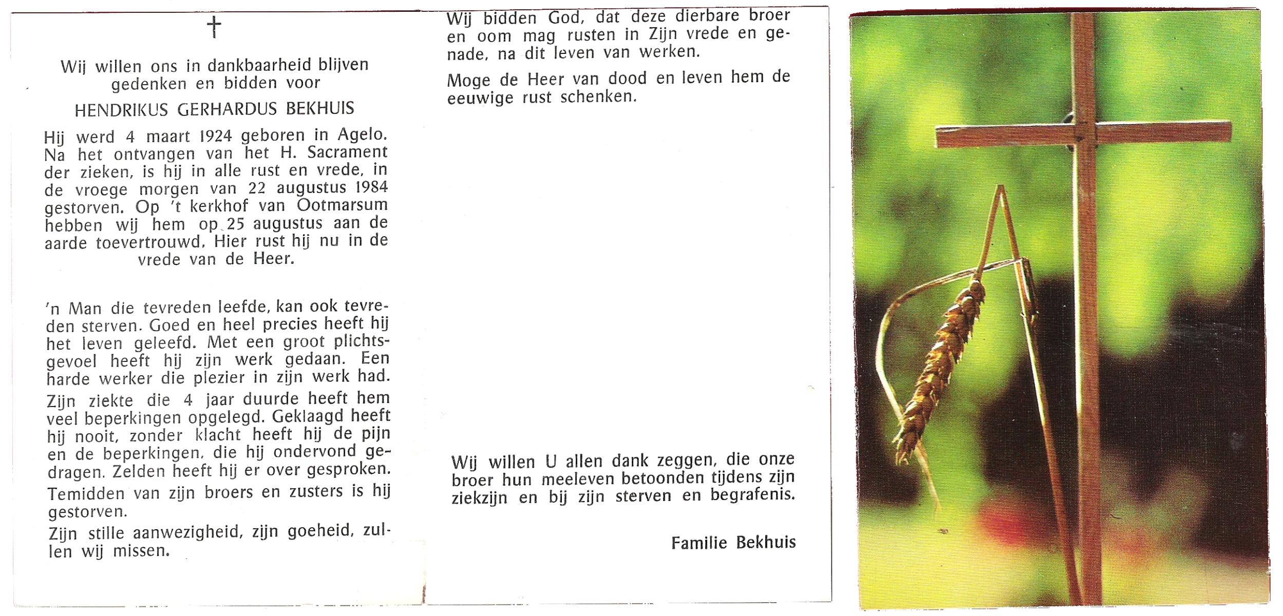 BEKHUIS, Hendrikus Gerhardus, geboren op 4-3-1924 te Agelo, overleden op 22-8-1984 op 60-jarige leeftijd, begraven op 25-8-1984 te Ootmarsum.