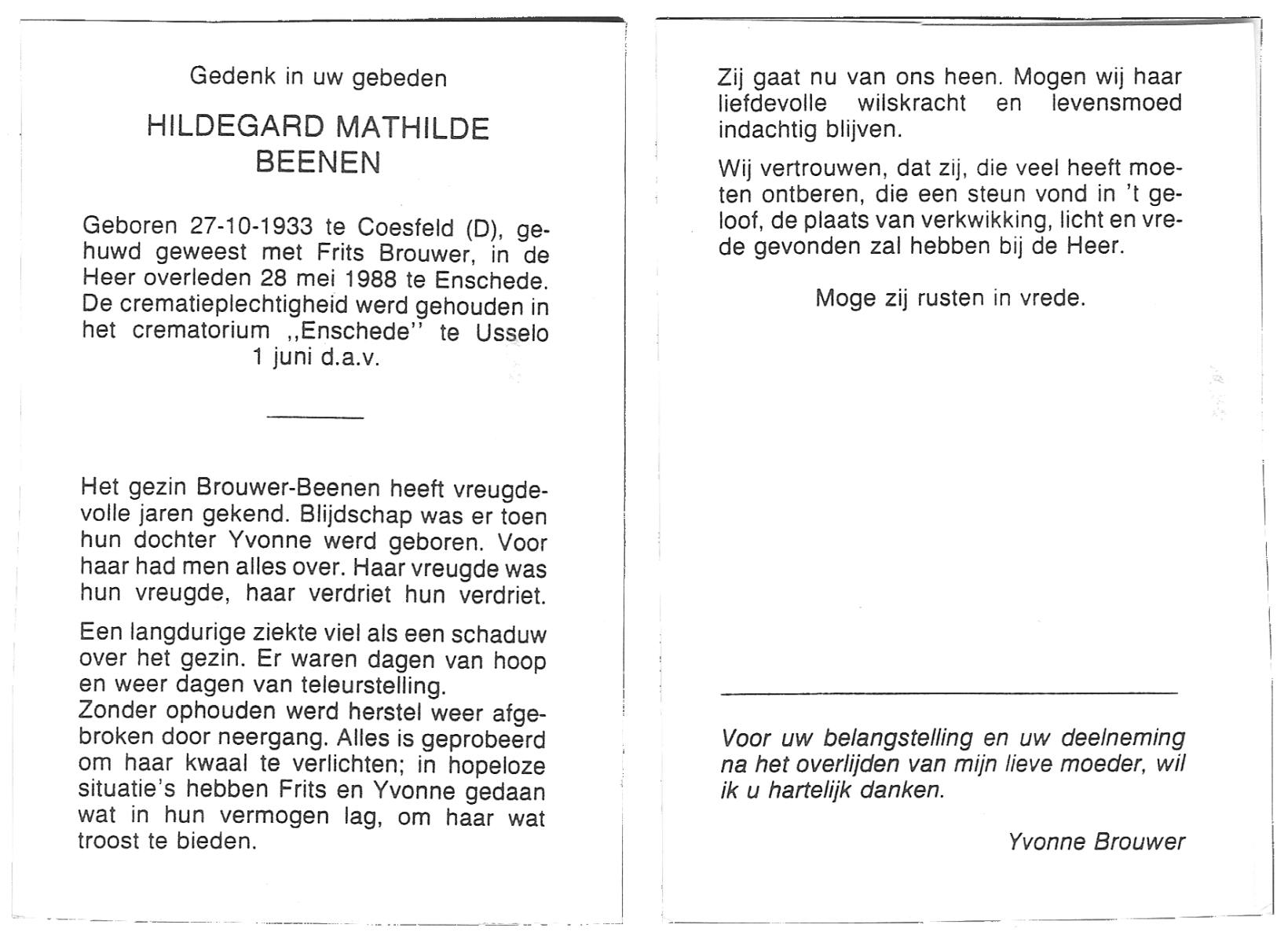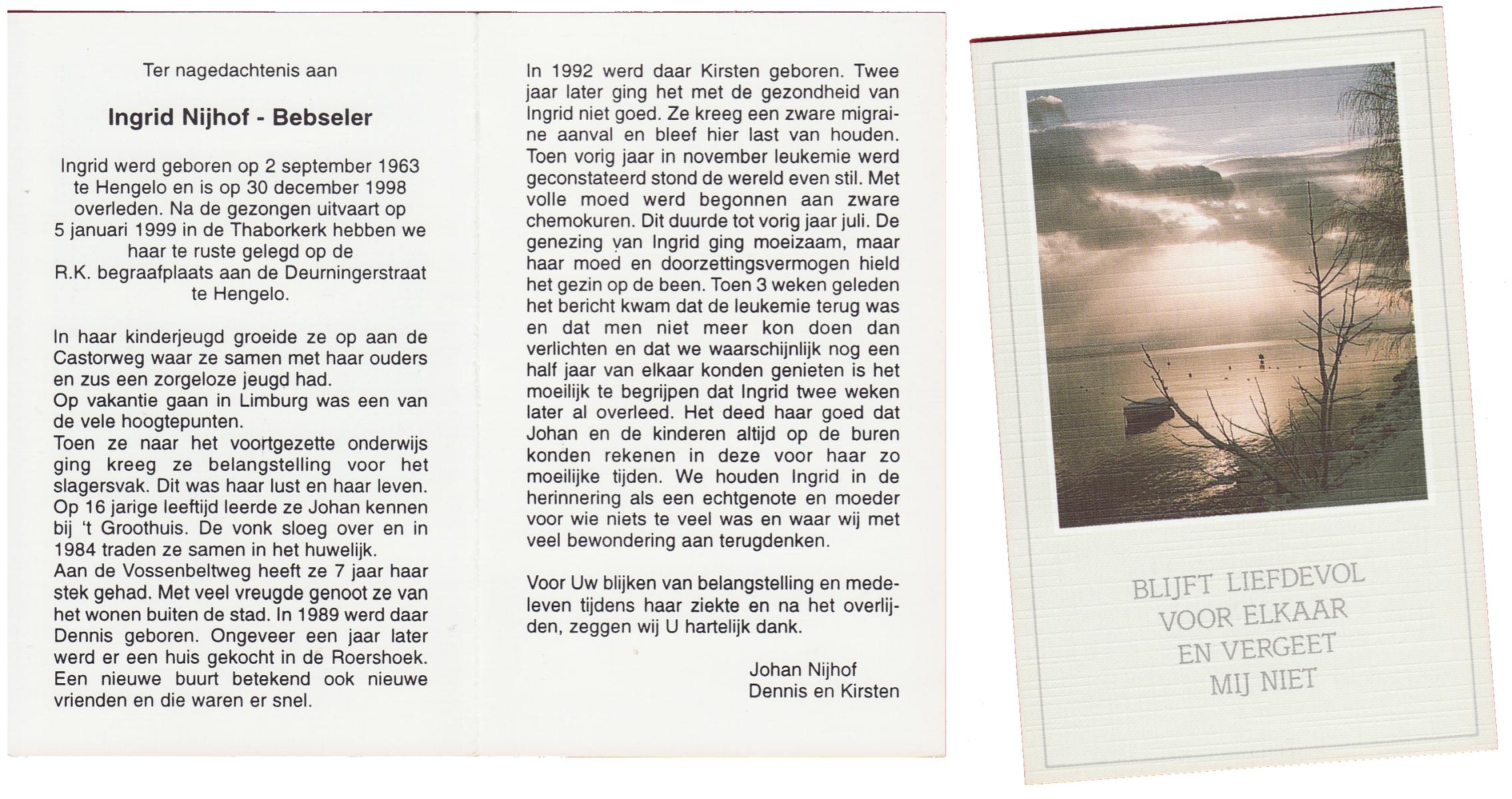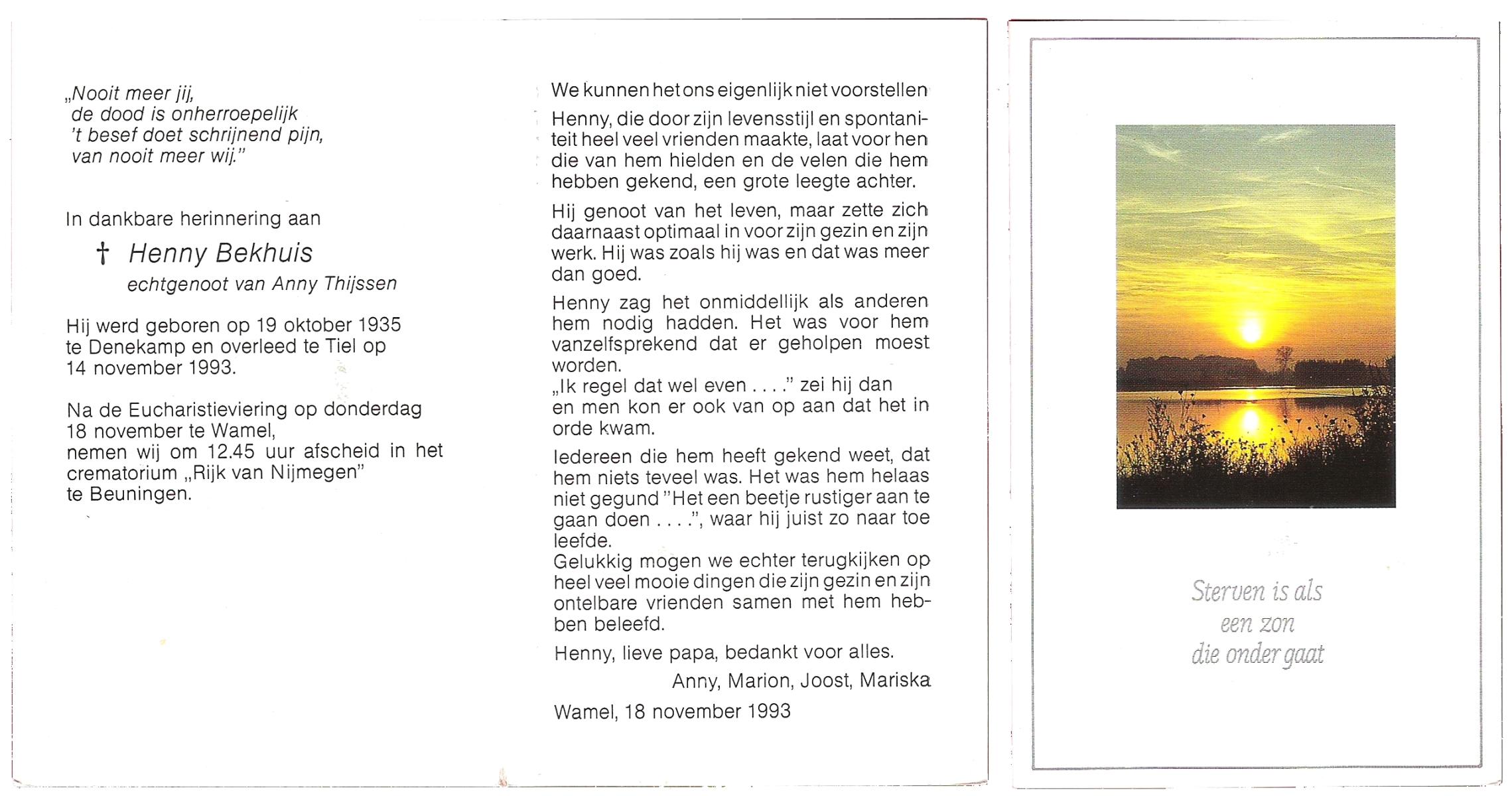 BEKHUIS, Henny, geboren op 19-10-1935 te Denekamp, overleden op 14-11-1993 te Tiel op 58-jarige leeftijd, gecremeerd op 18-11-1993 te Beuningen(GE).