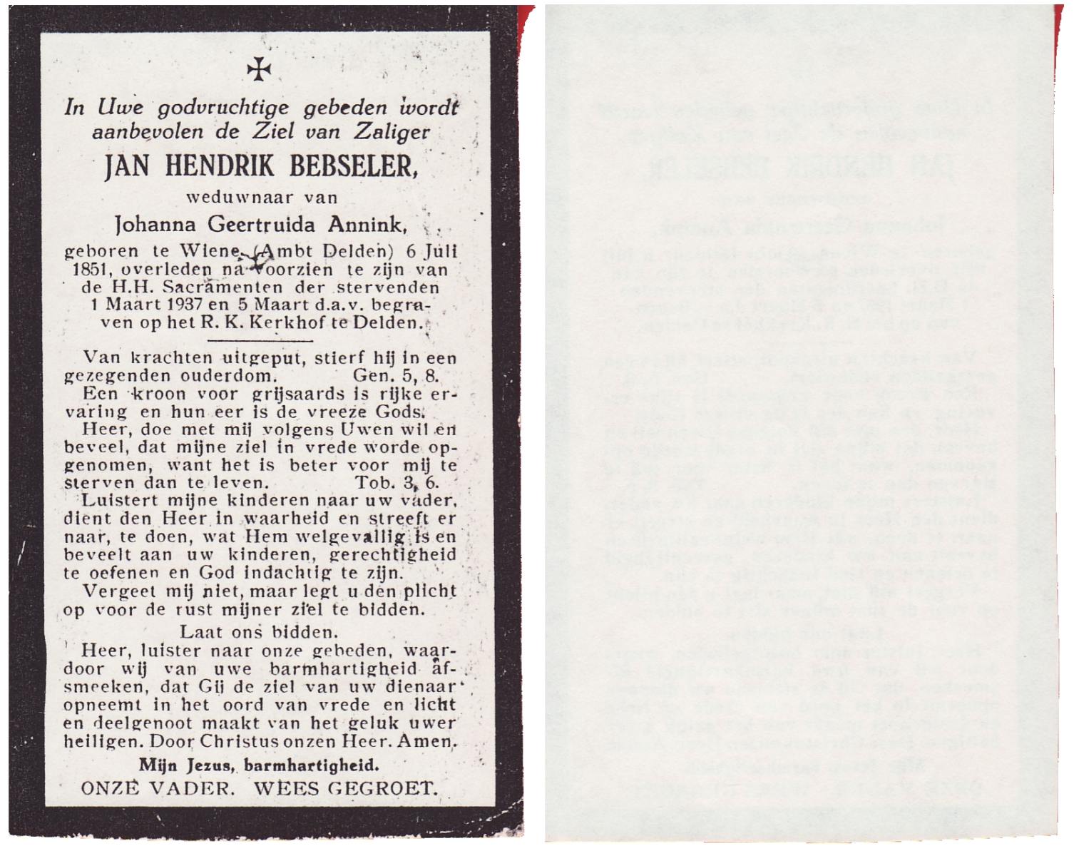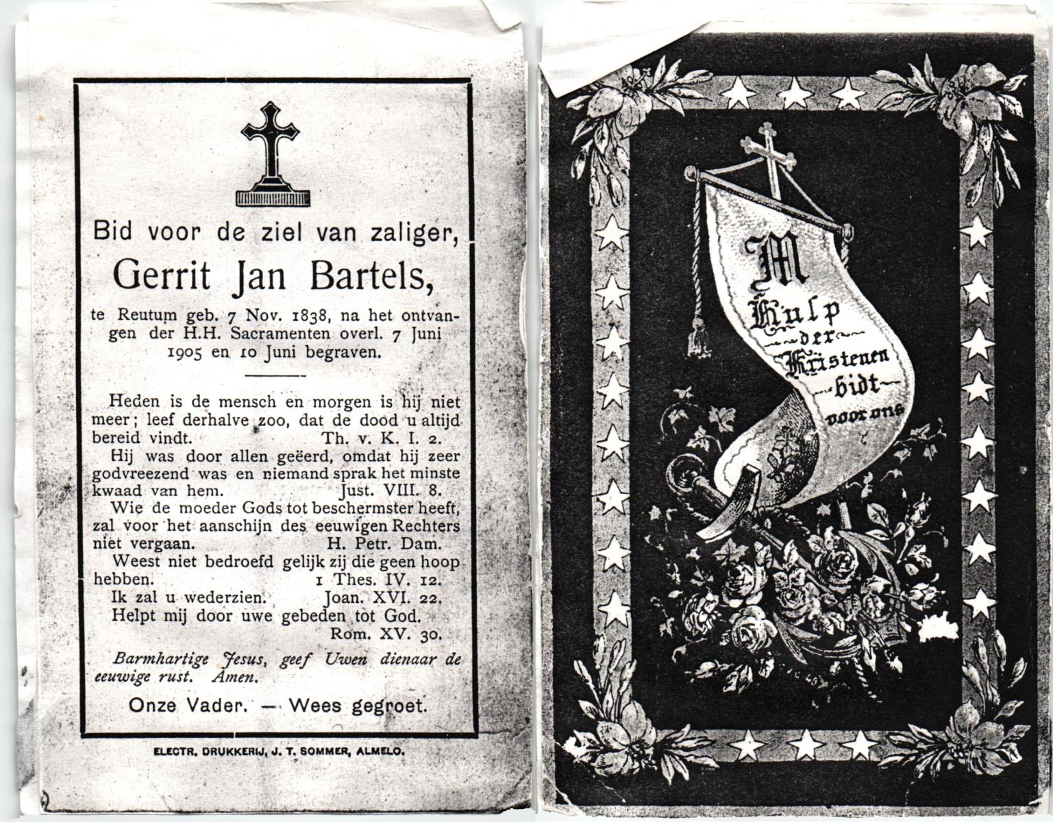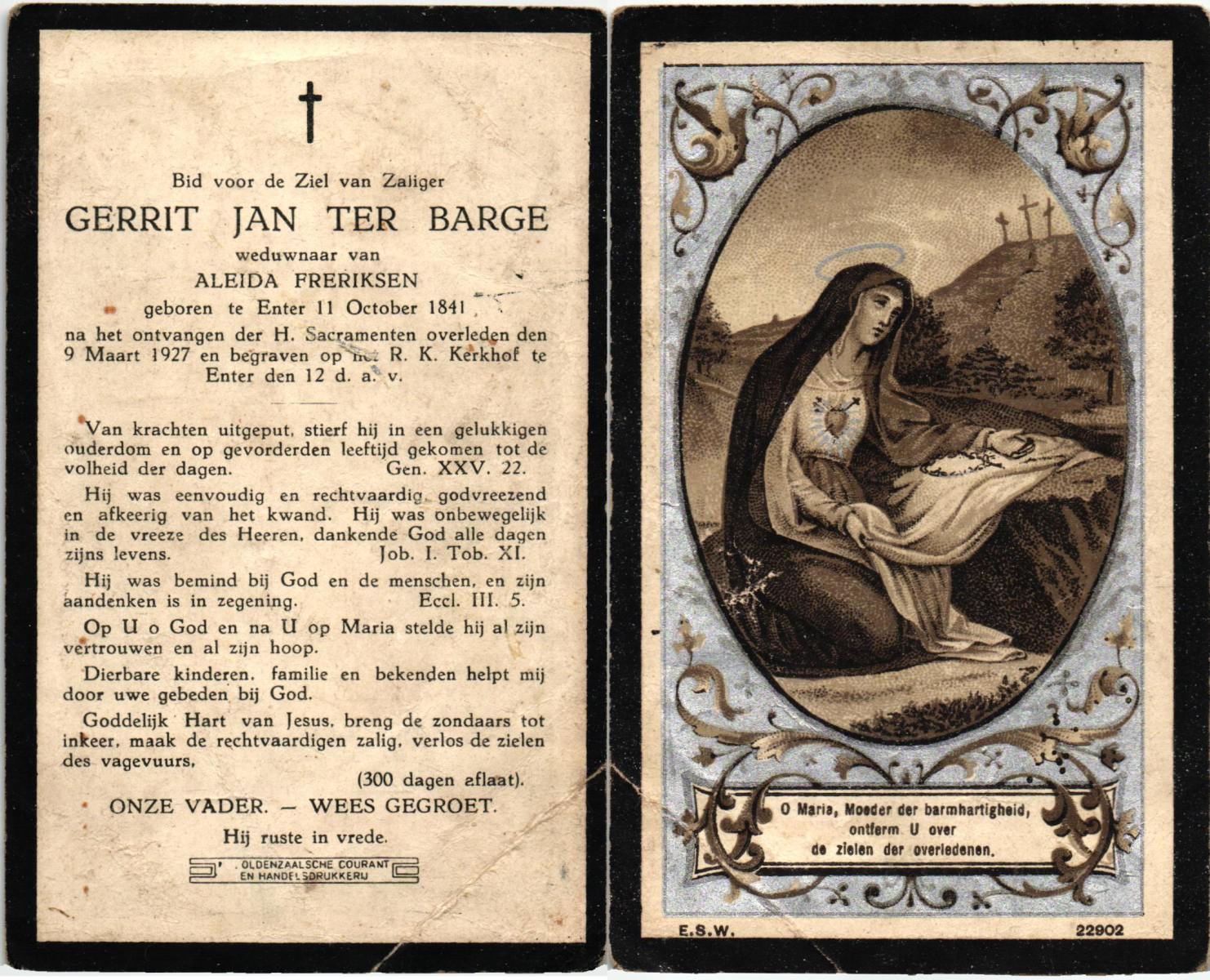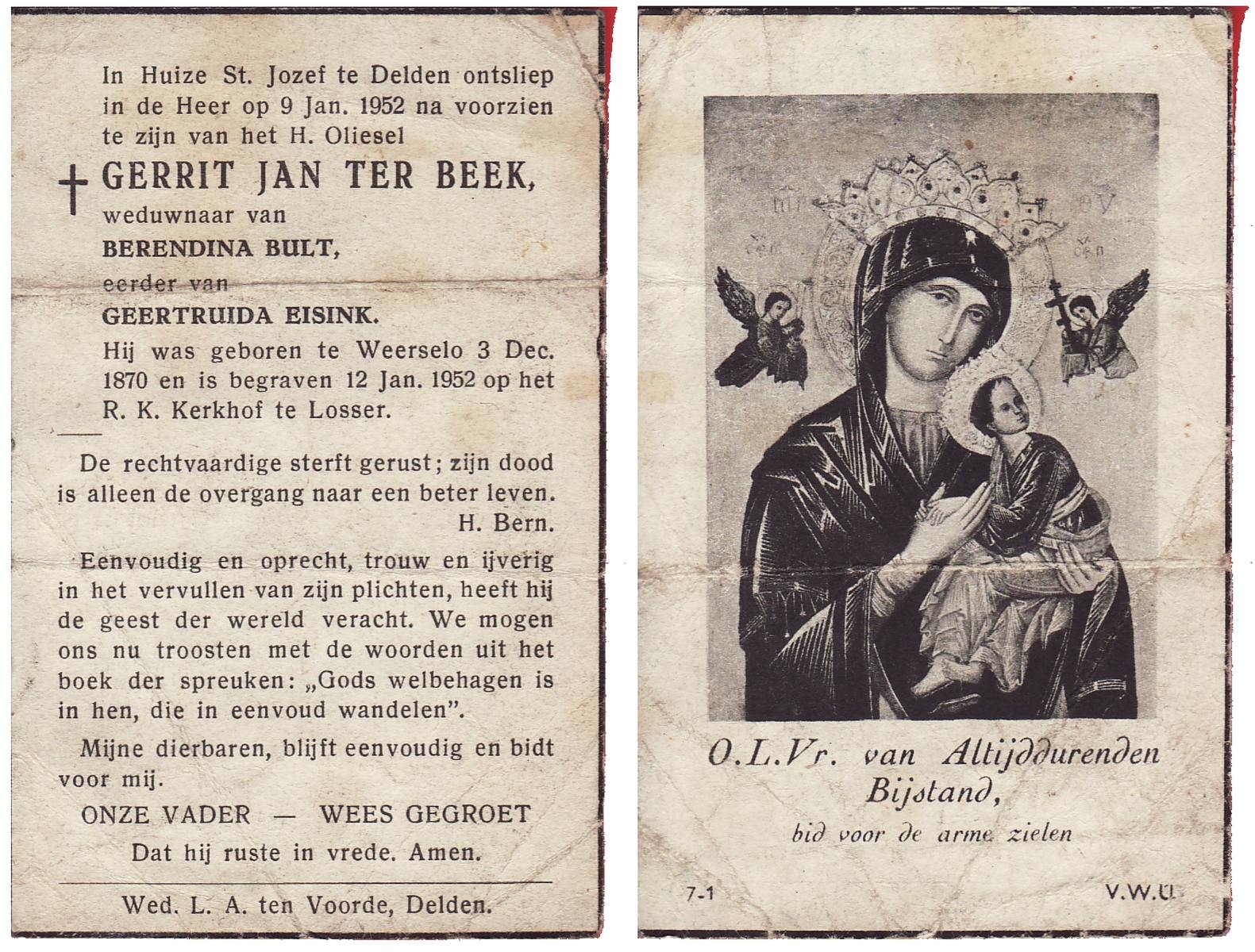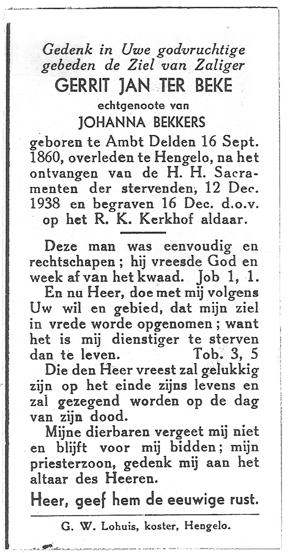 BEKE, ter, Gerrit Jan, geboren op 16-09-1860 te Delden, Ambt, overleden op 12-12-1938 te Hengelo (Ov.) op 78-jarige leeftijd, begraven op 16-12-1938 te Hengelo (Ov.).