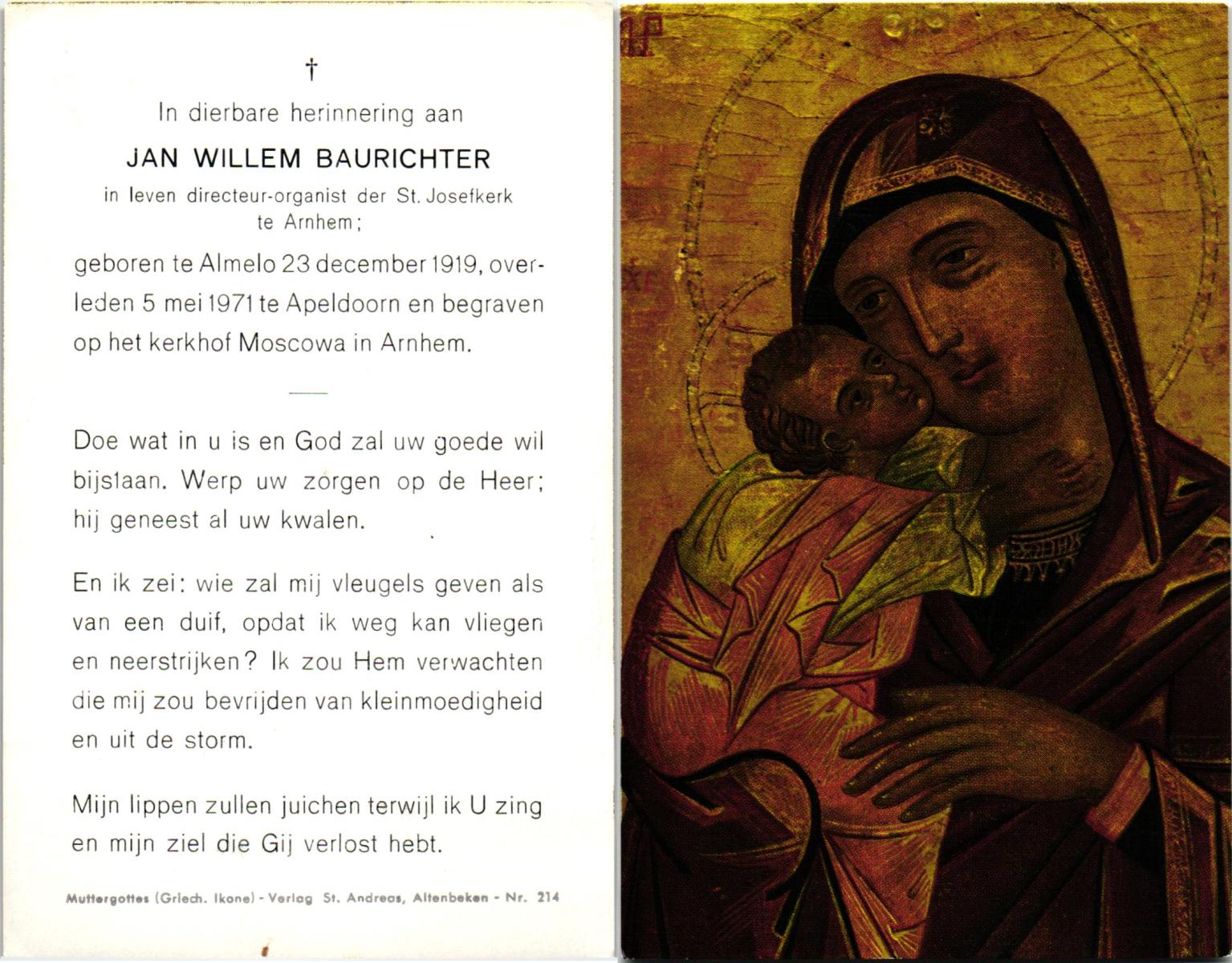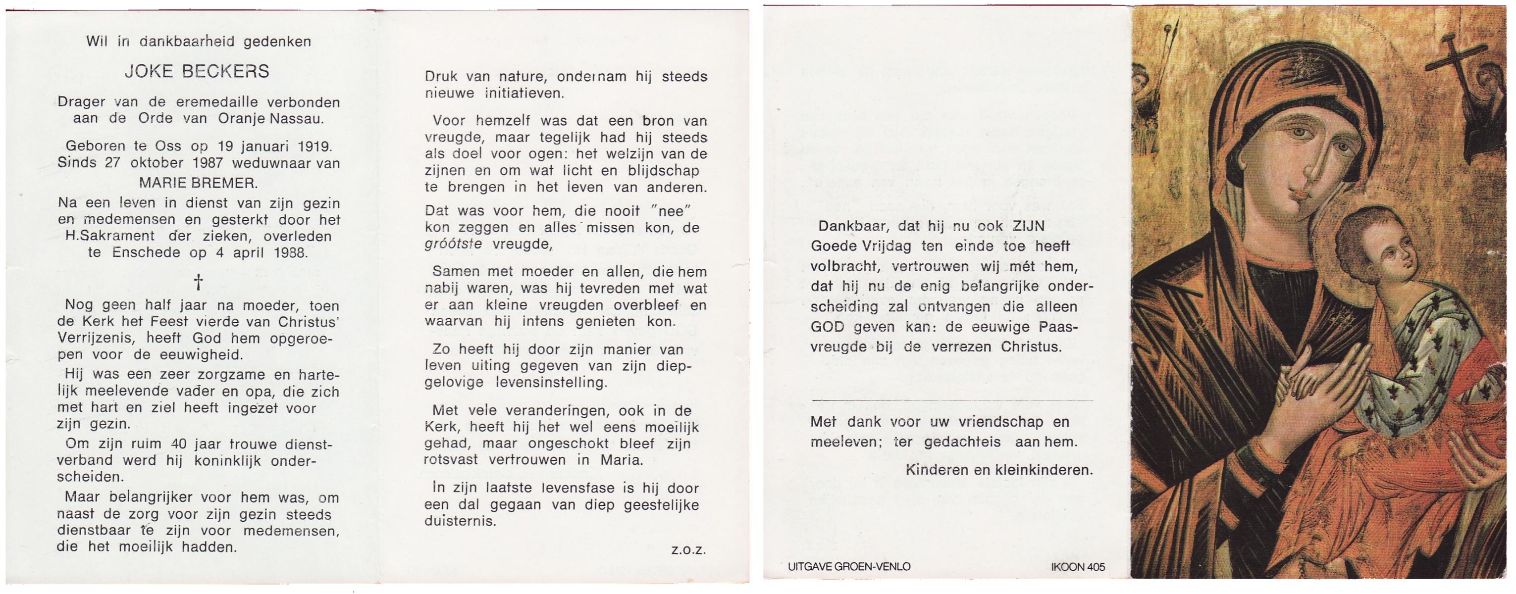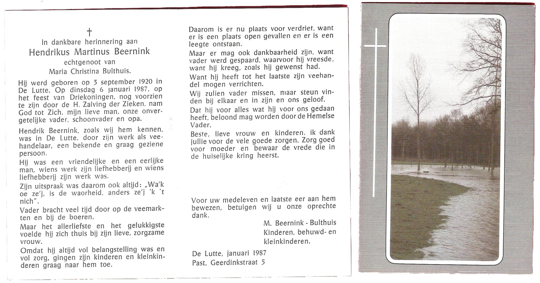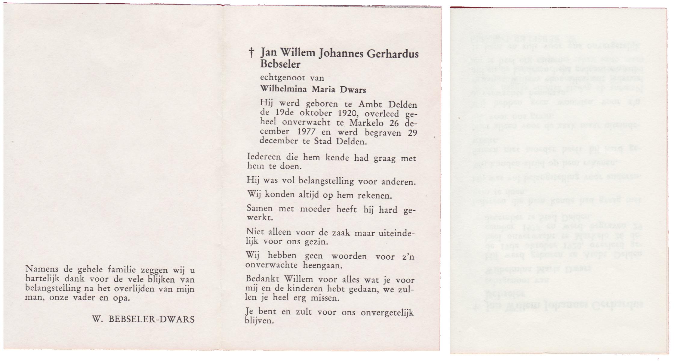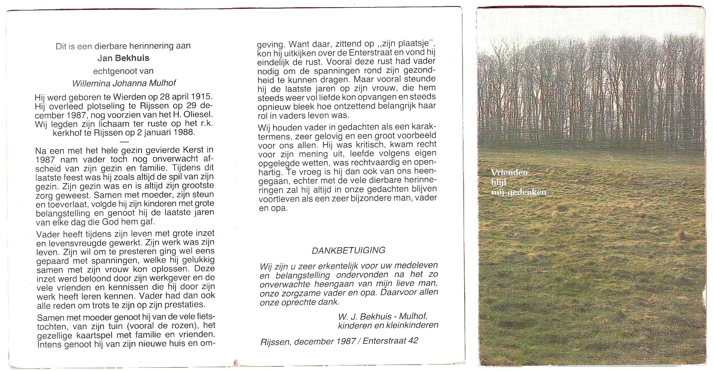 BEKHUIS, Jan, geboren op 28-4-1915 te Wierden, overleden op 29-12-1987 te Rijssen op 72-jarige leeftijd, begraven op 2-1-1988 te Rijssen.
