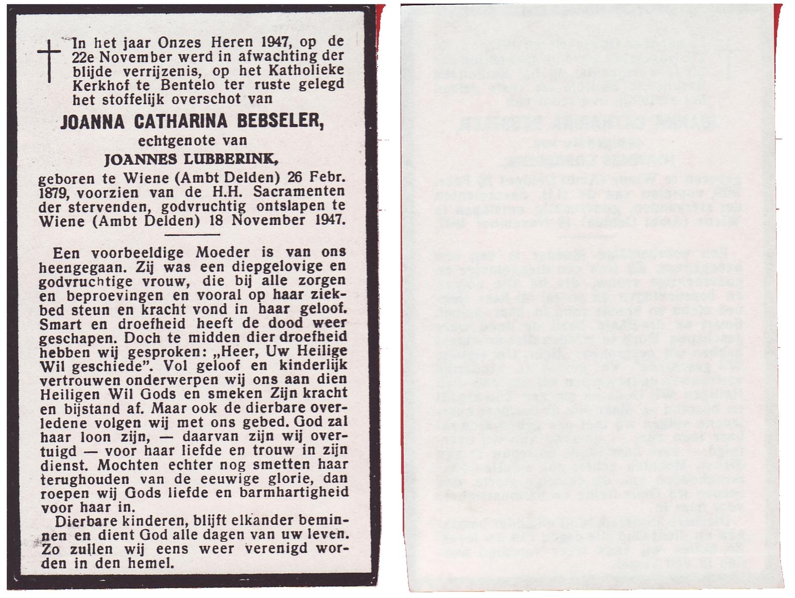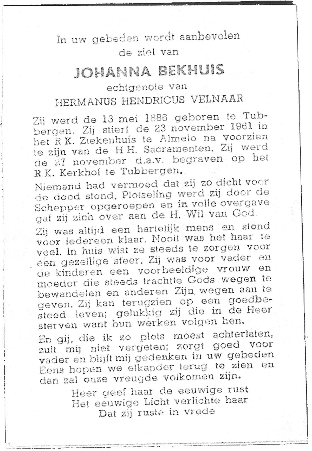 BEKHUIS, Johanna, geboren op 13-05-1886 te Tubbergen, overleden op 23-11-1961 te Almelo op 75-jarige leeftijd, begraven op 27-11-1961 te Tubbergen.