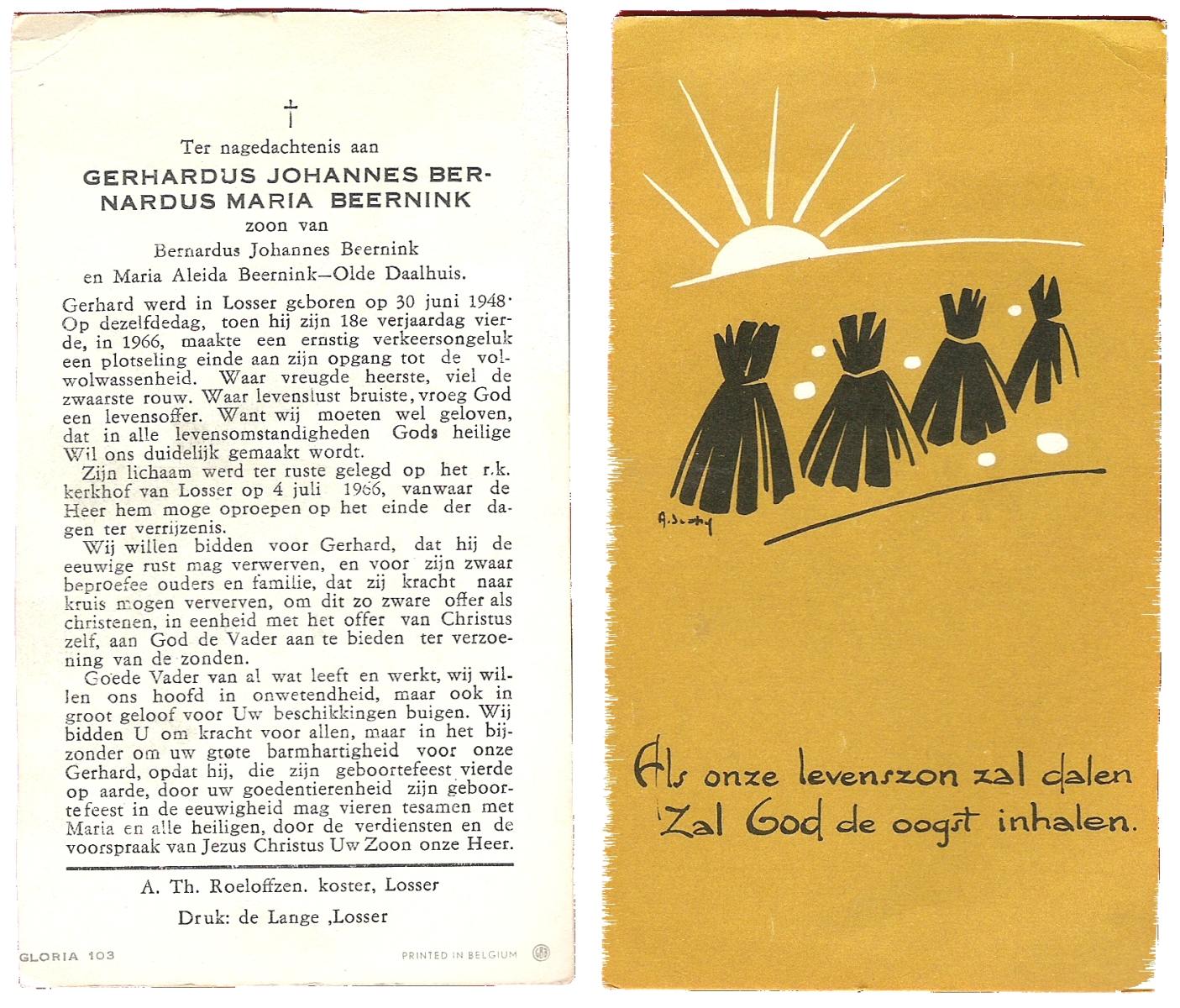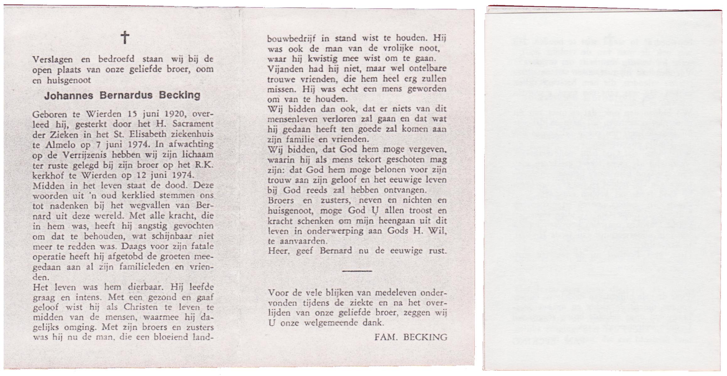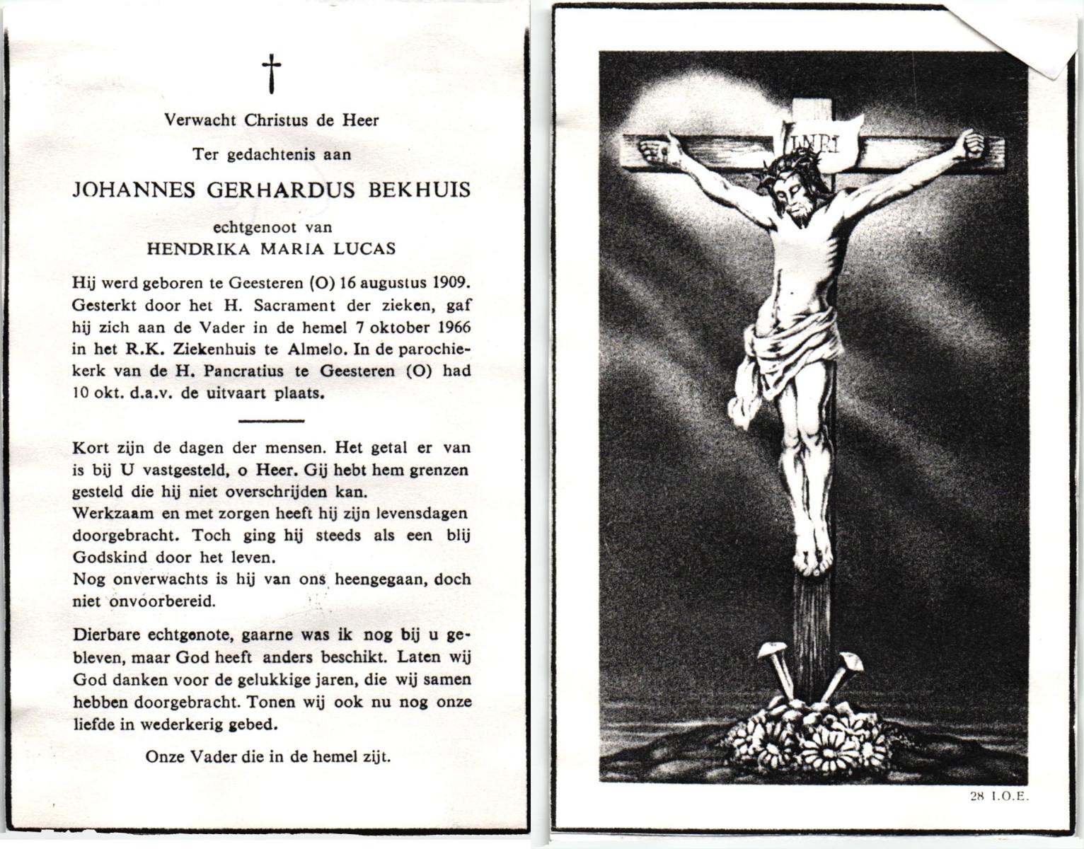 BEKHUIS, Johannes Gerhardus, geboren op 16-8-1909 te Geesteren, overleden op 7-10-1966 te Almelo, ziekenhuis op 57-jarige leeftijd, begraven op 10-10-1966 te Geesteren.