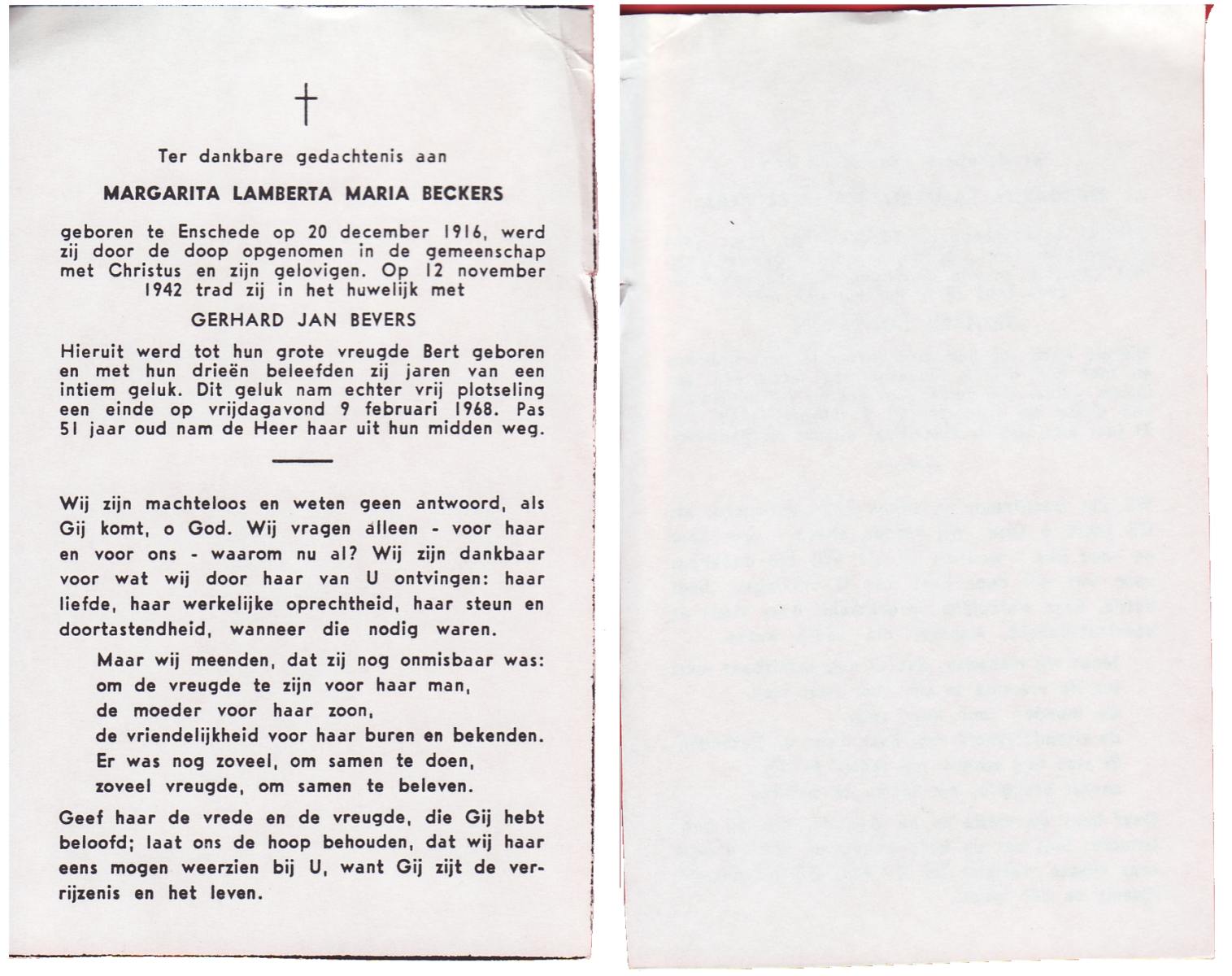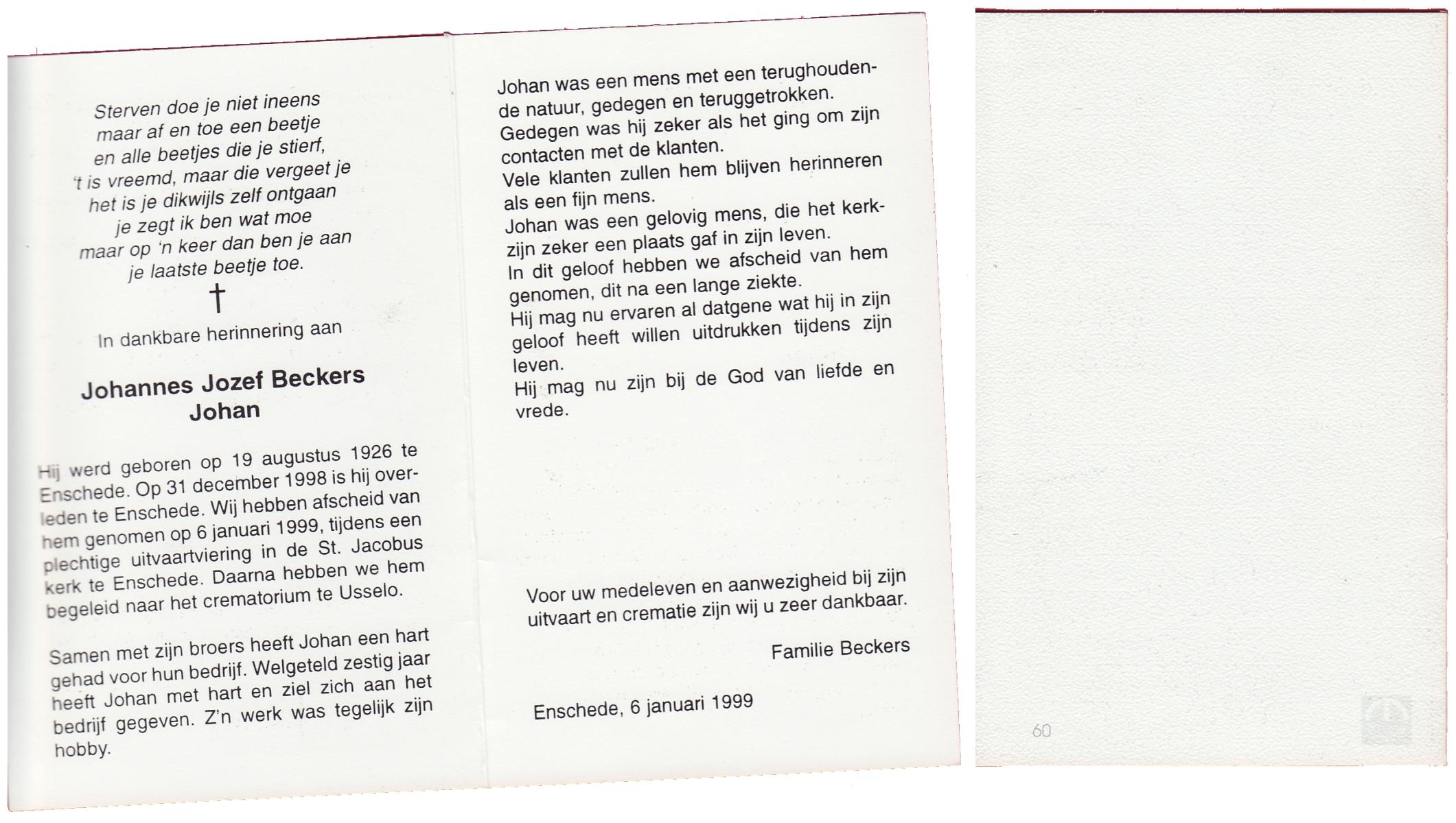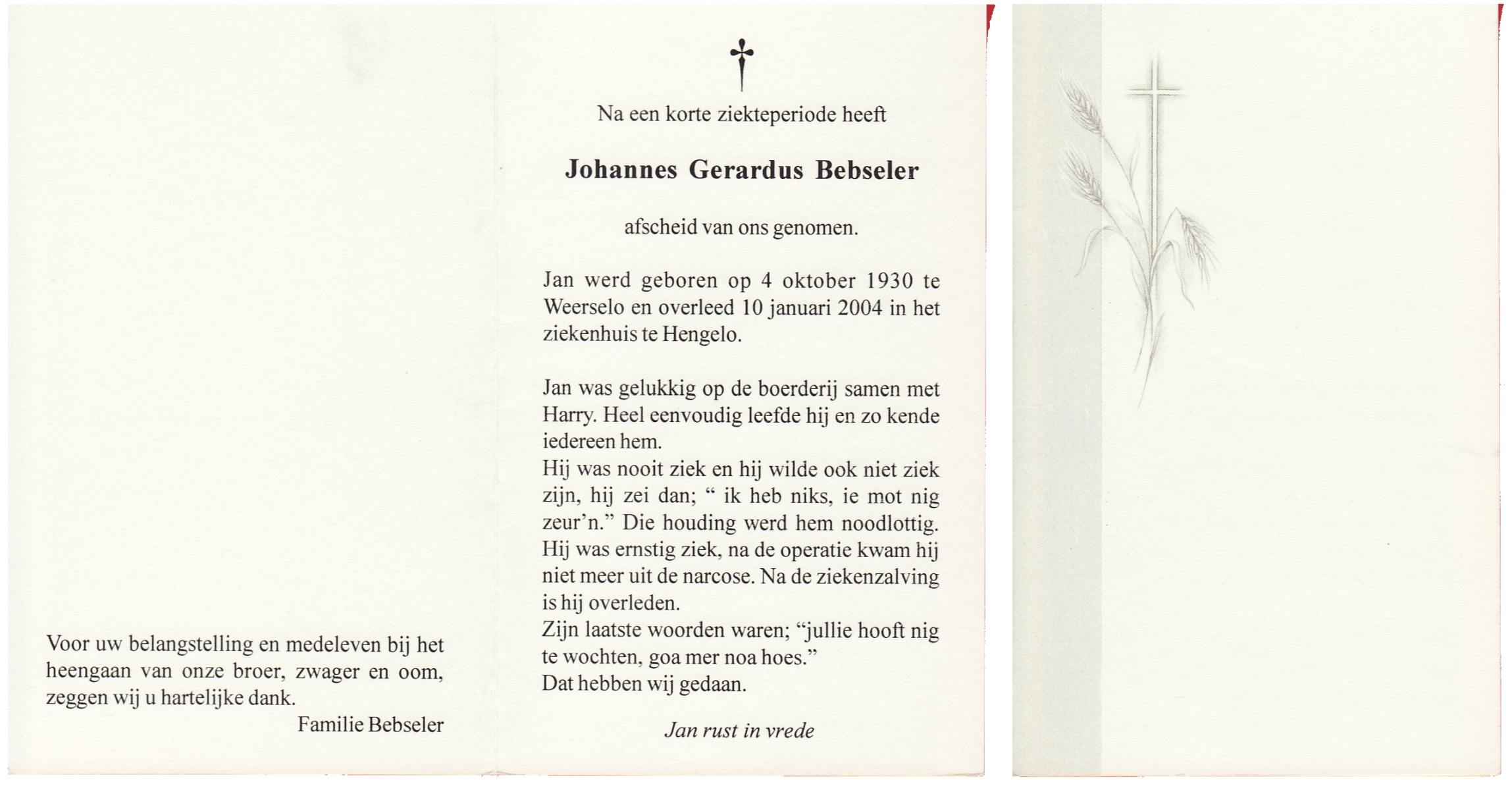 BEKHUIS, Johannes Gerhardus, geboren op 16-8-1909 te Geesteren, overleden op 7-10-1966 te Almelo, ziekenhuis op 57-jarige leeftijd, begraven op 10-10-1966 te Geesteren.