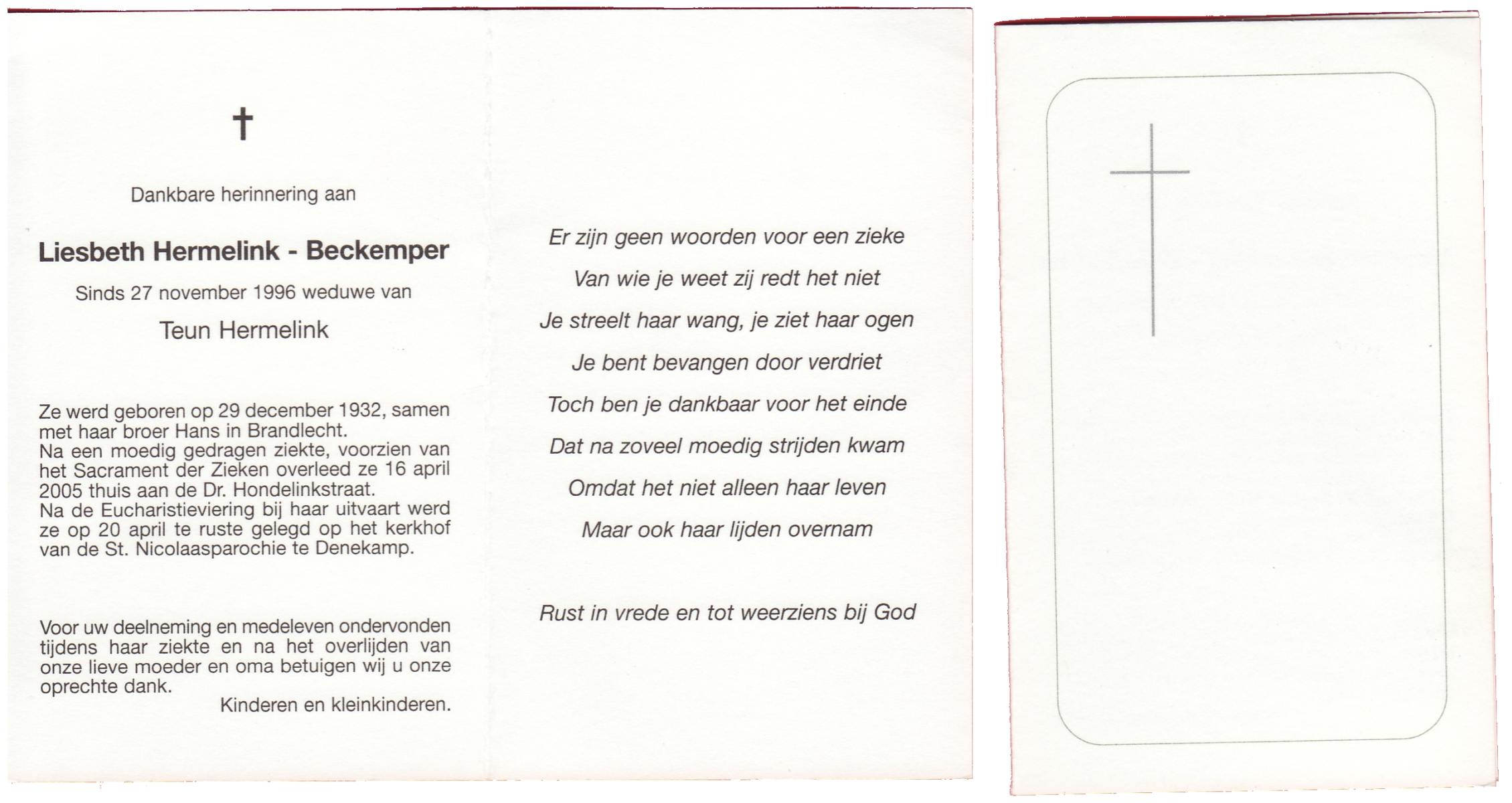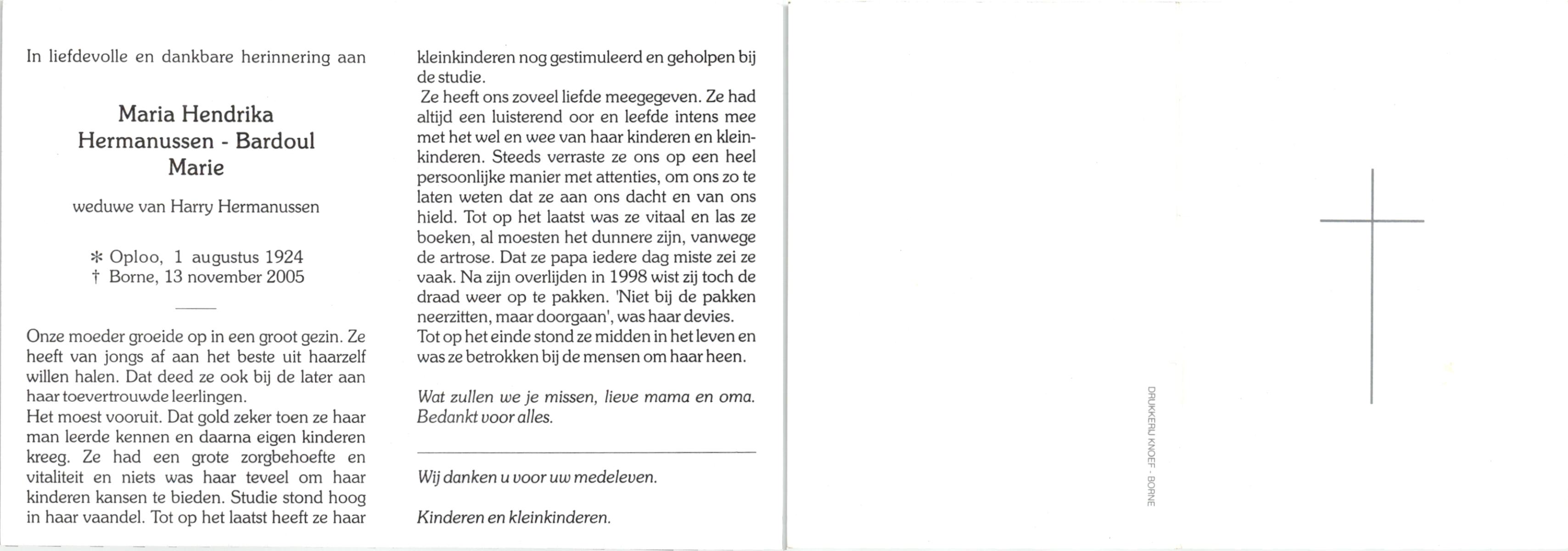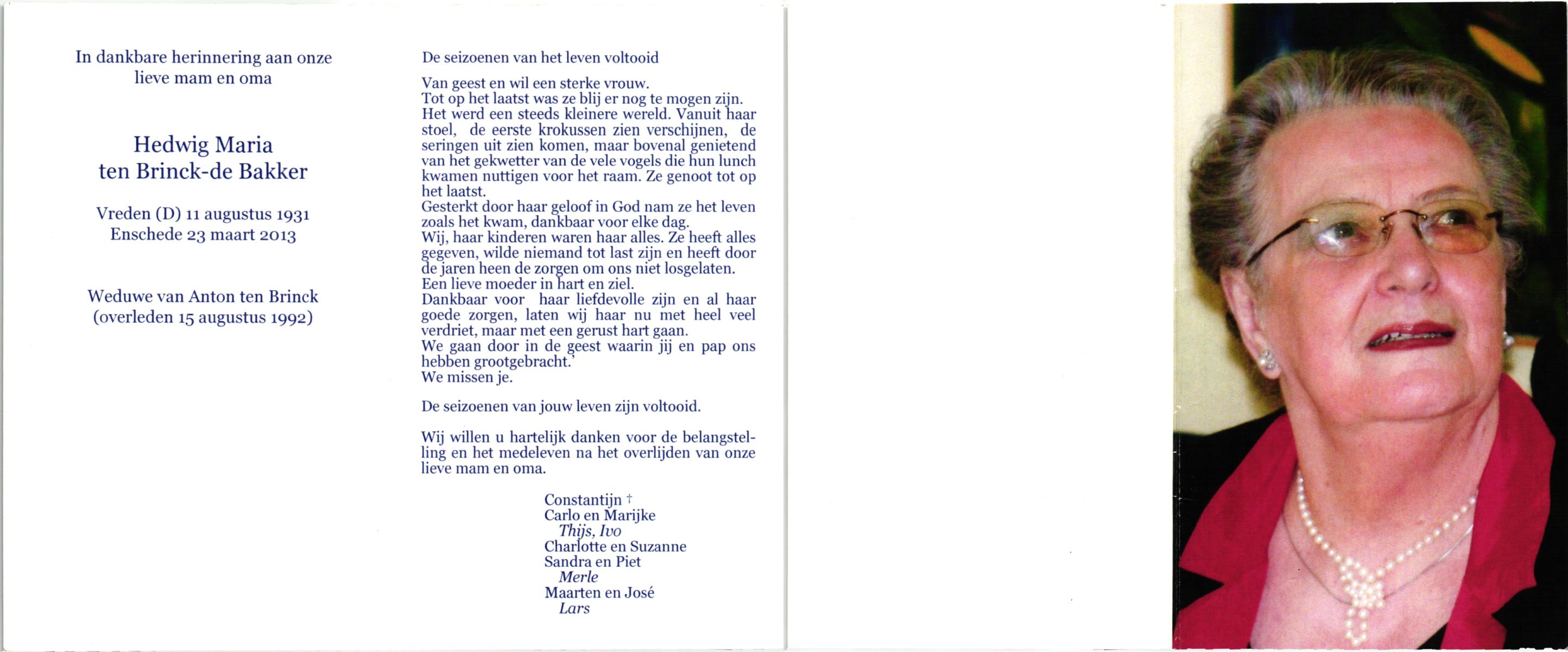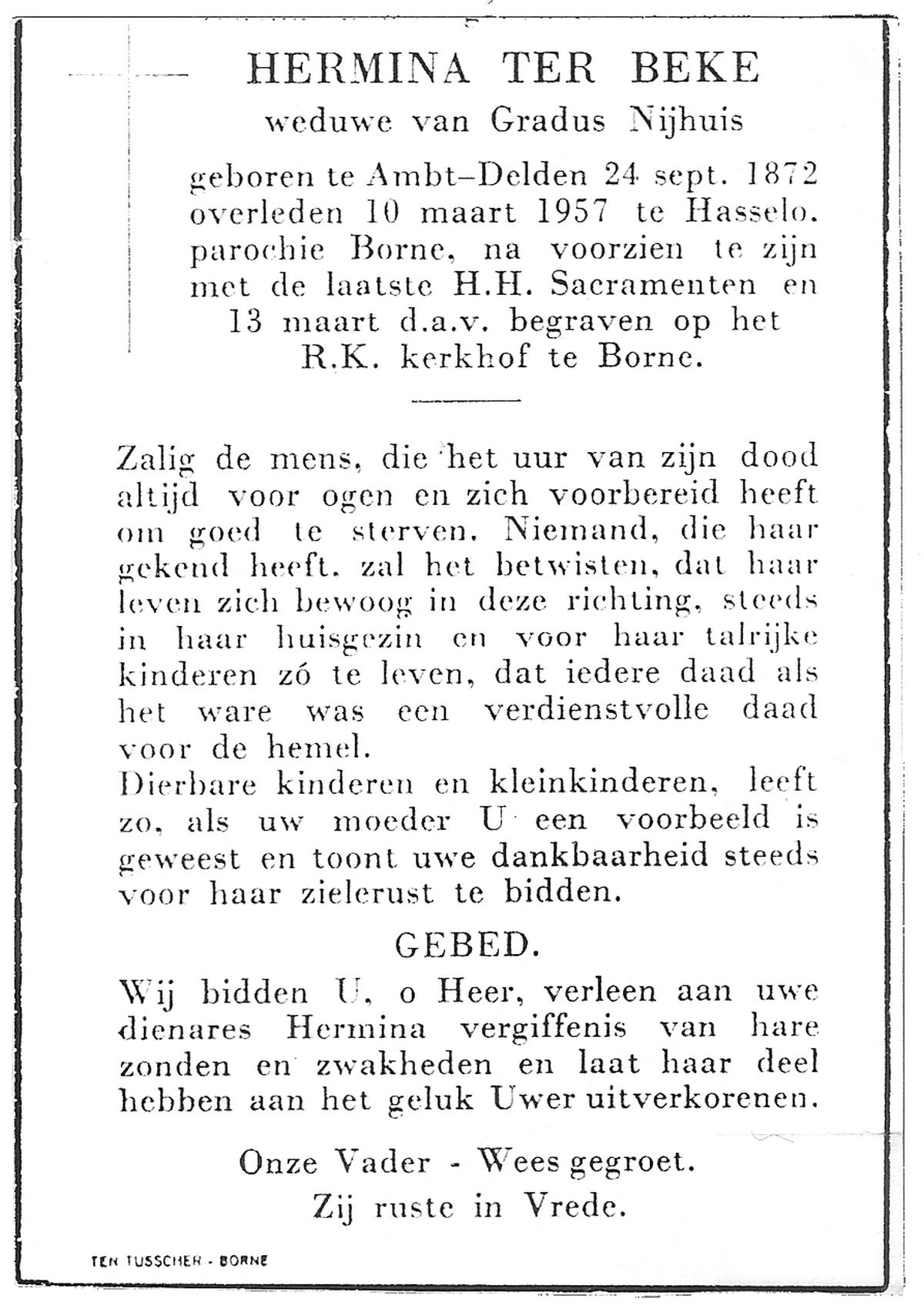 BEKE, ter, Hermina, geboren op 24-09-1872 te Delden, Ambt, overleden op 10-3-1957 te Hasselo op 85-jarige leeftijd, begraven op 13-3-1957 te Borne.