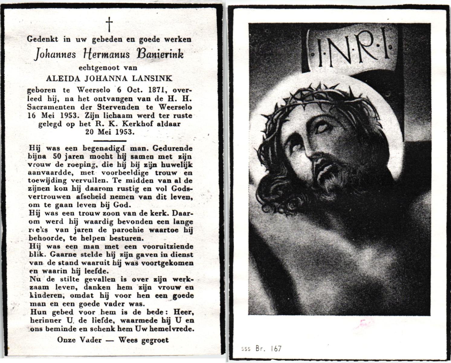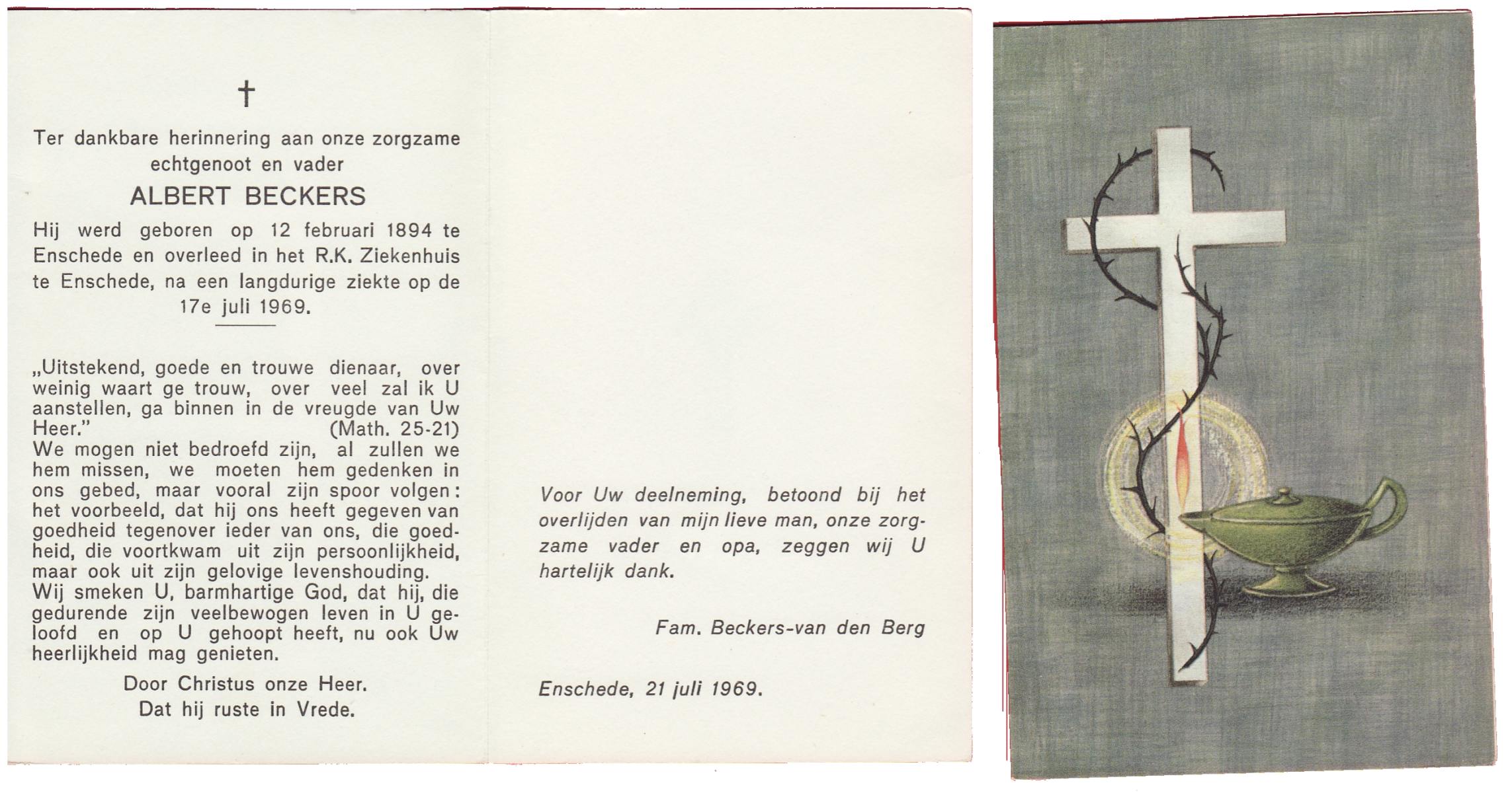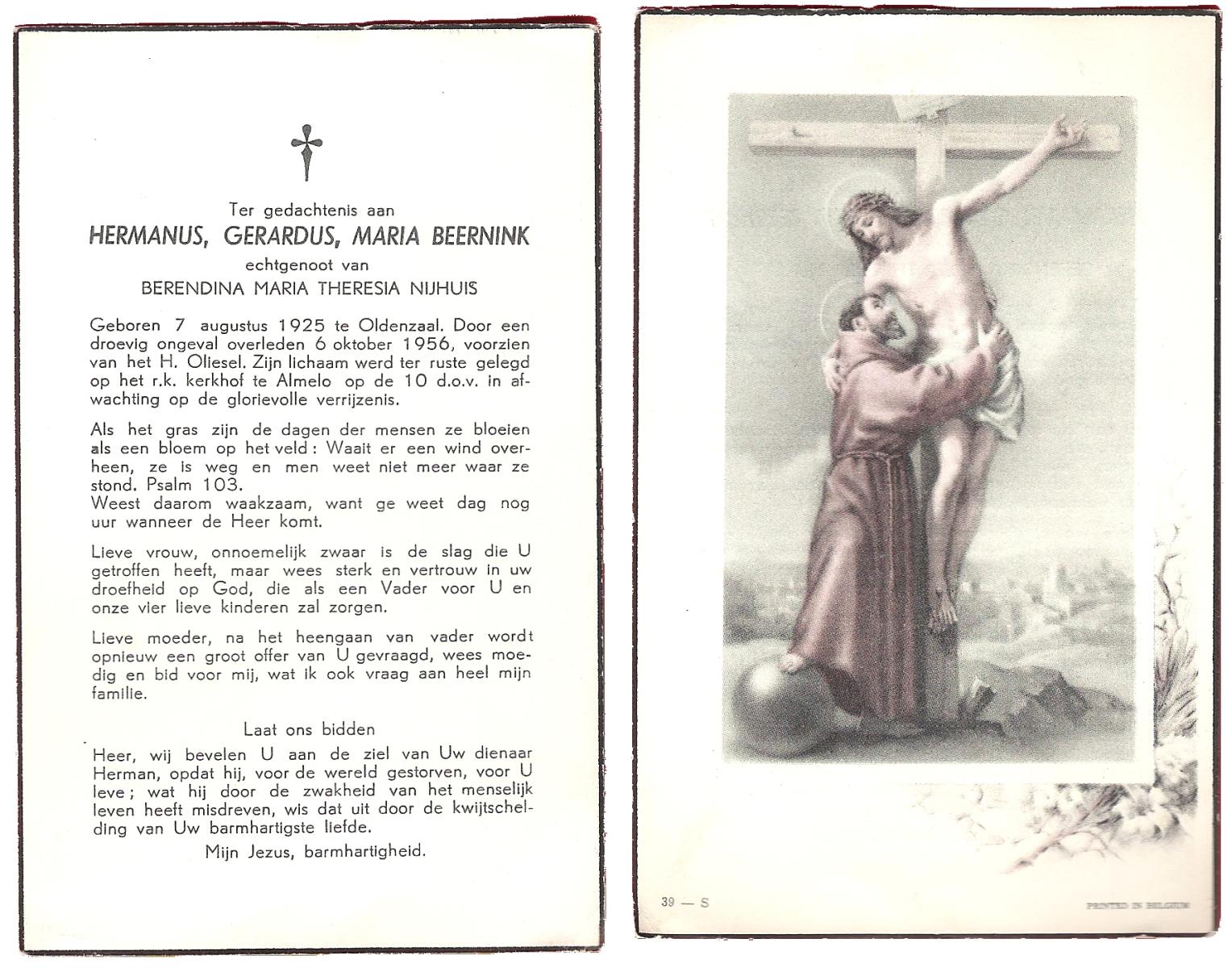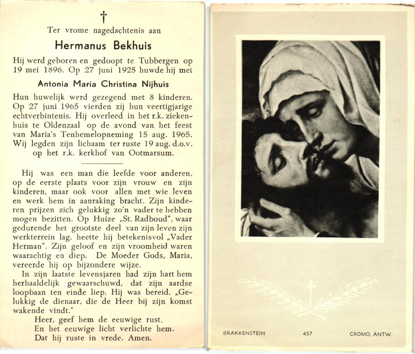BEKHUIS, Hermanus, geboren op 19-05-1896 te Tubbergen, overleden op 15-8-1965 te Oldenzaal, ziekenhuis op 69-jarige leeftijd, begraven op 19-8-1965 te Ootmarsum.