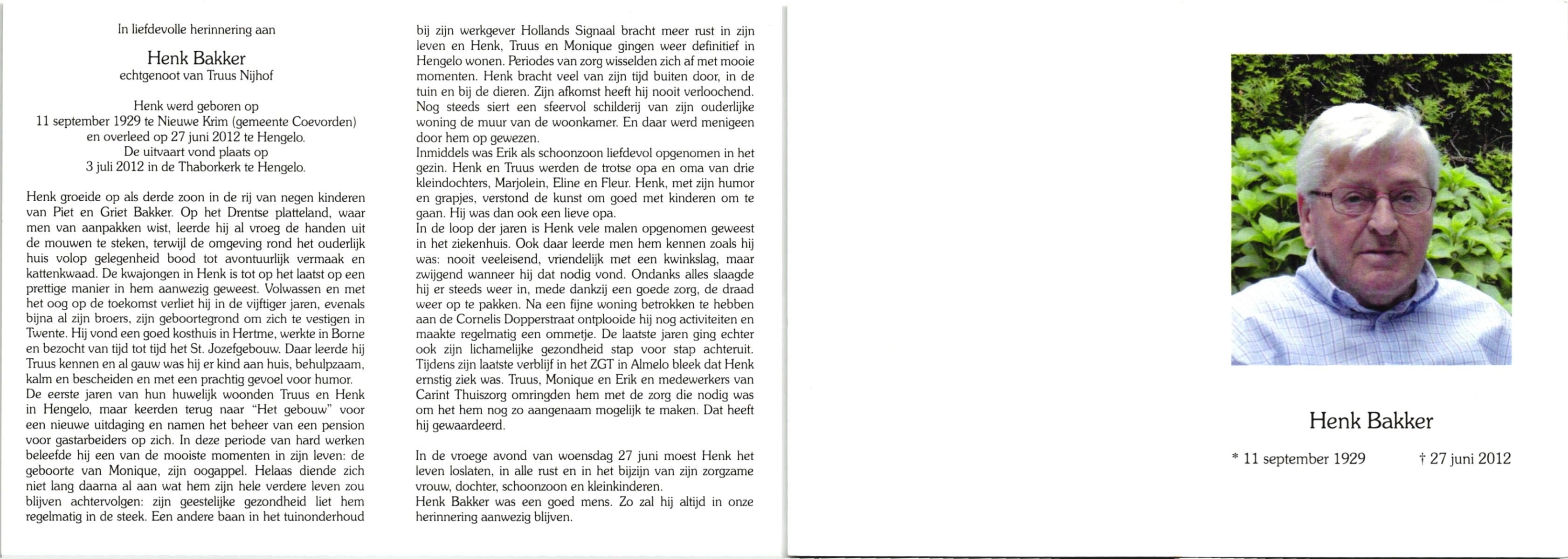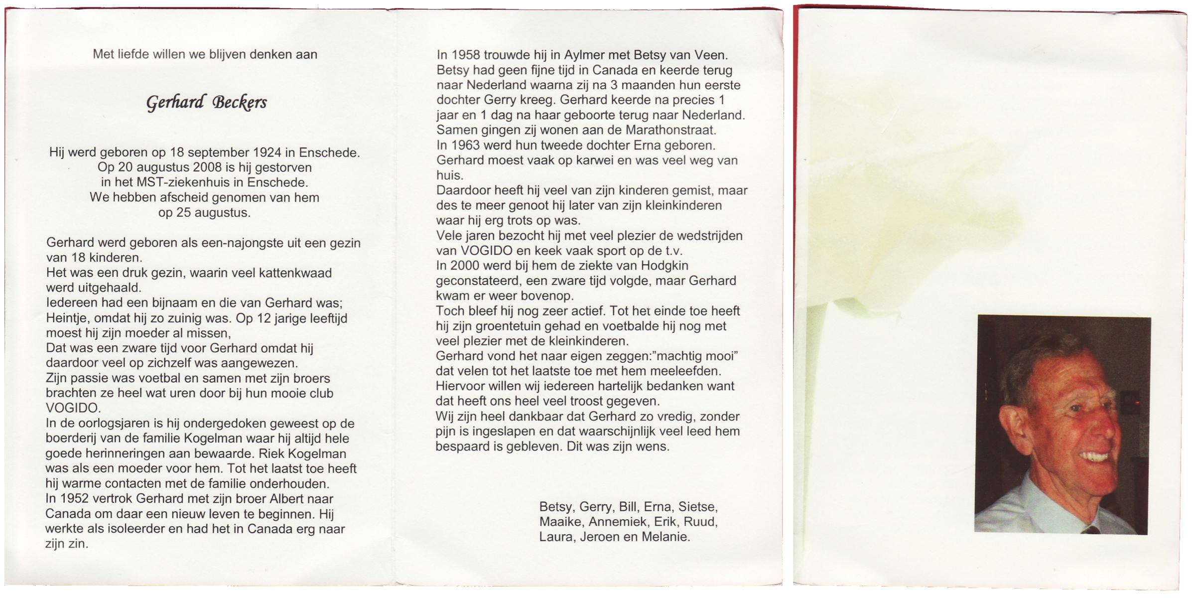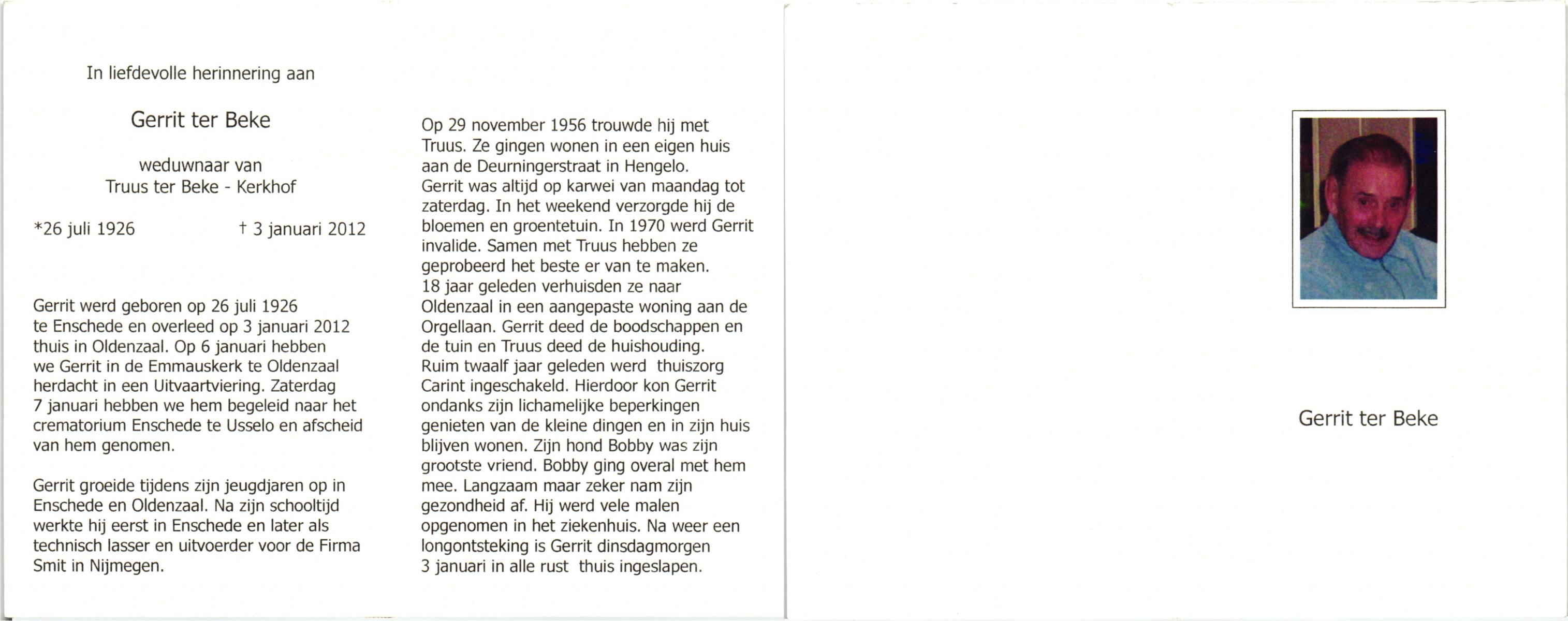 BEKE, ter, Gerrit, geboren op 26-7-1926 te Enschede, overleden op 3-1-2012 te Oldenzaal op 85-jarige leeftijd, gecremeerd op 7-1-2012 te Usselo.