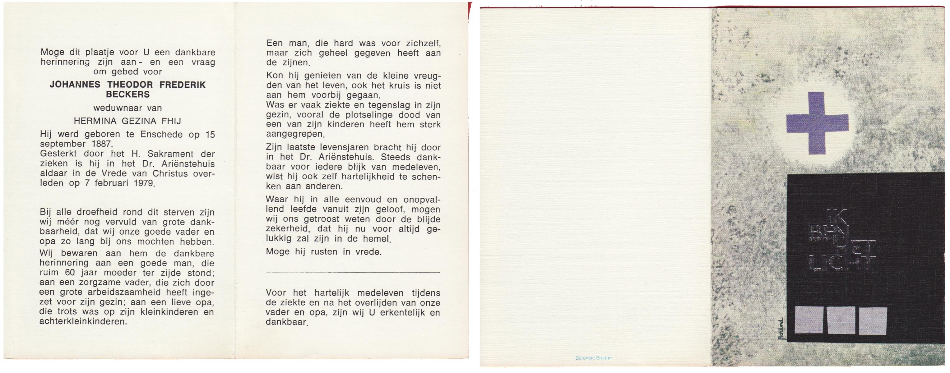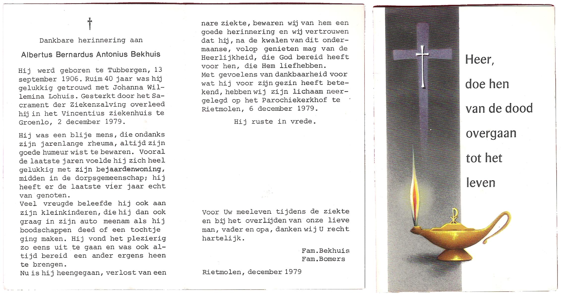 BEKHUIS, Albertus Bernardus Antonius, geboren op 13-9-1906 te Tubbergen, overleden op 2-12-1979 te Groenlo op 73-jarige leeftijd, begraven op 6-12-1979 te Rietmolen.