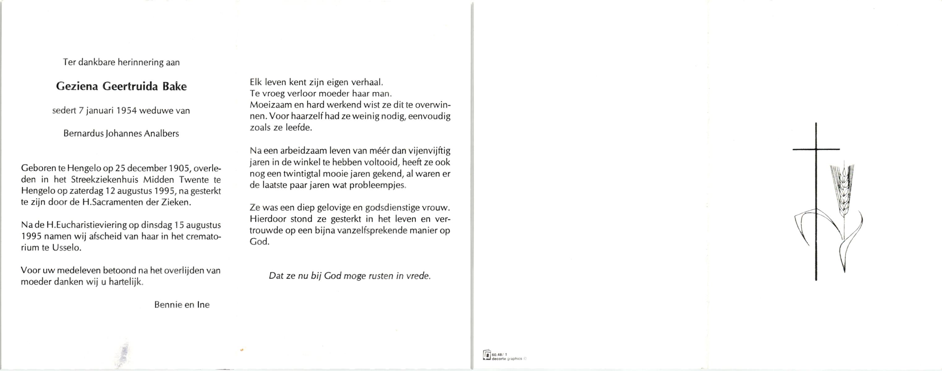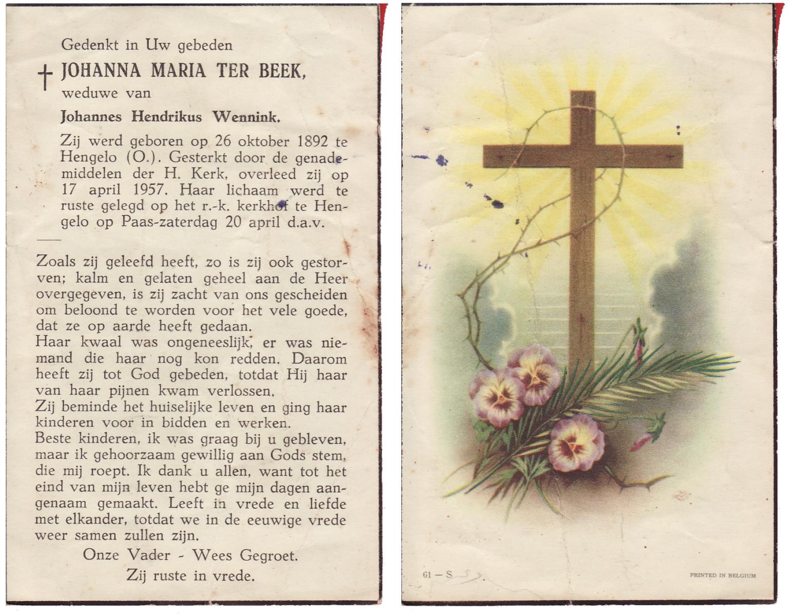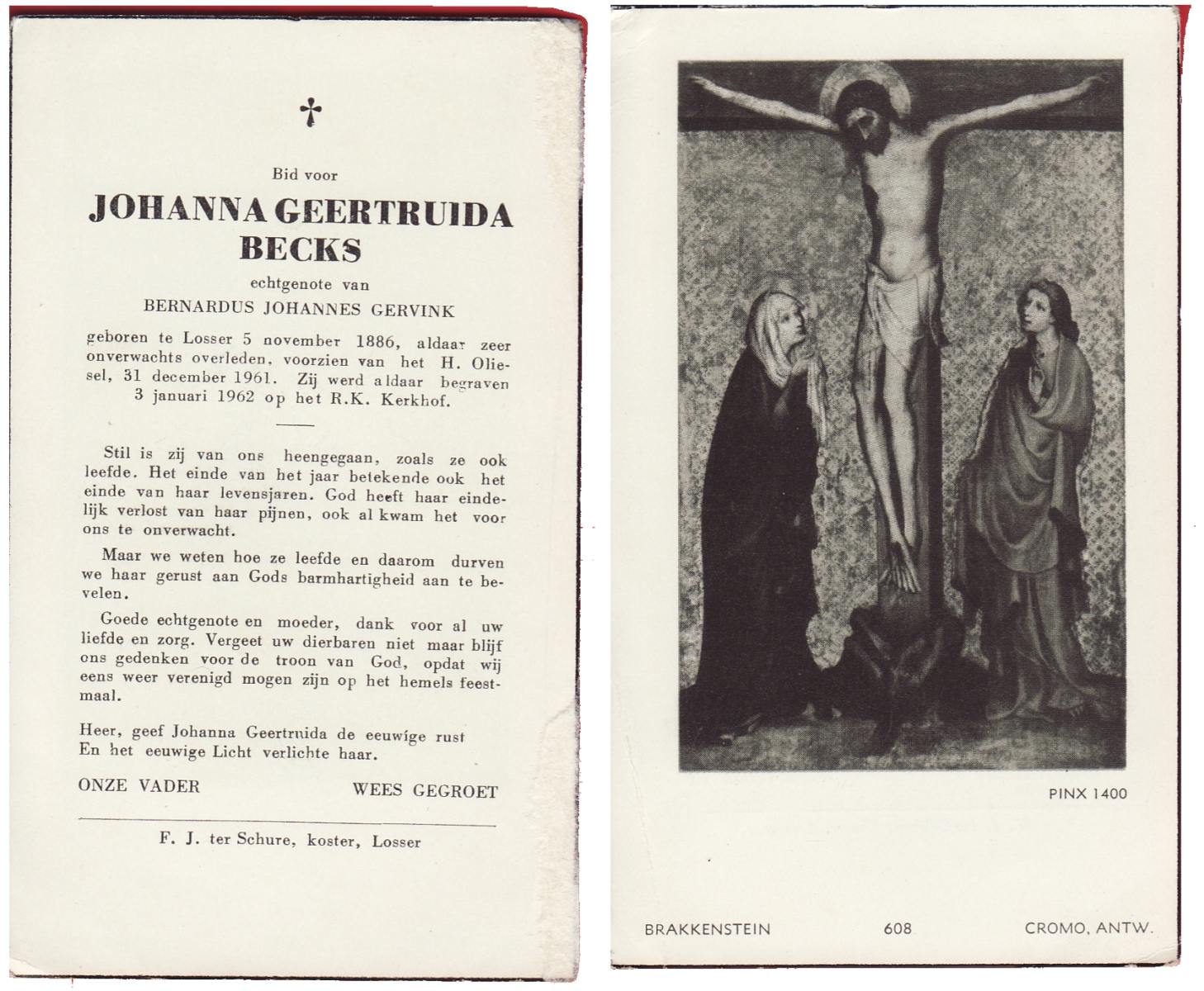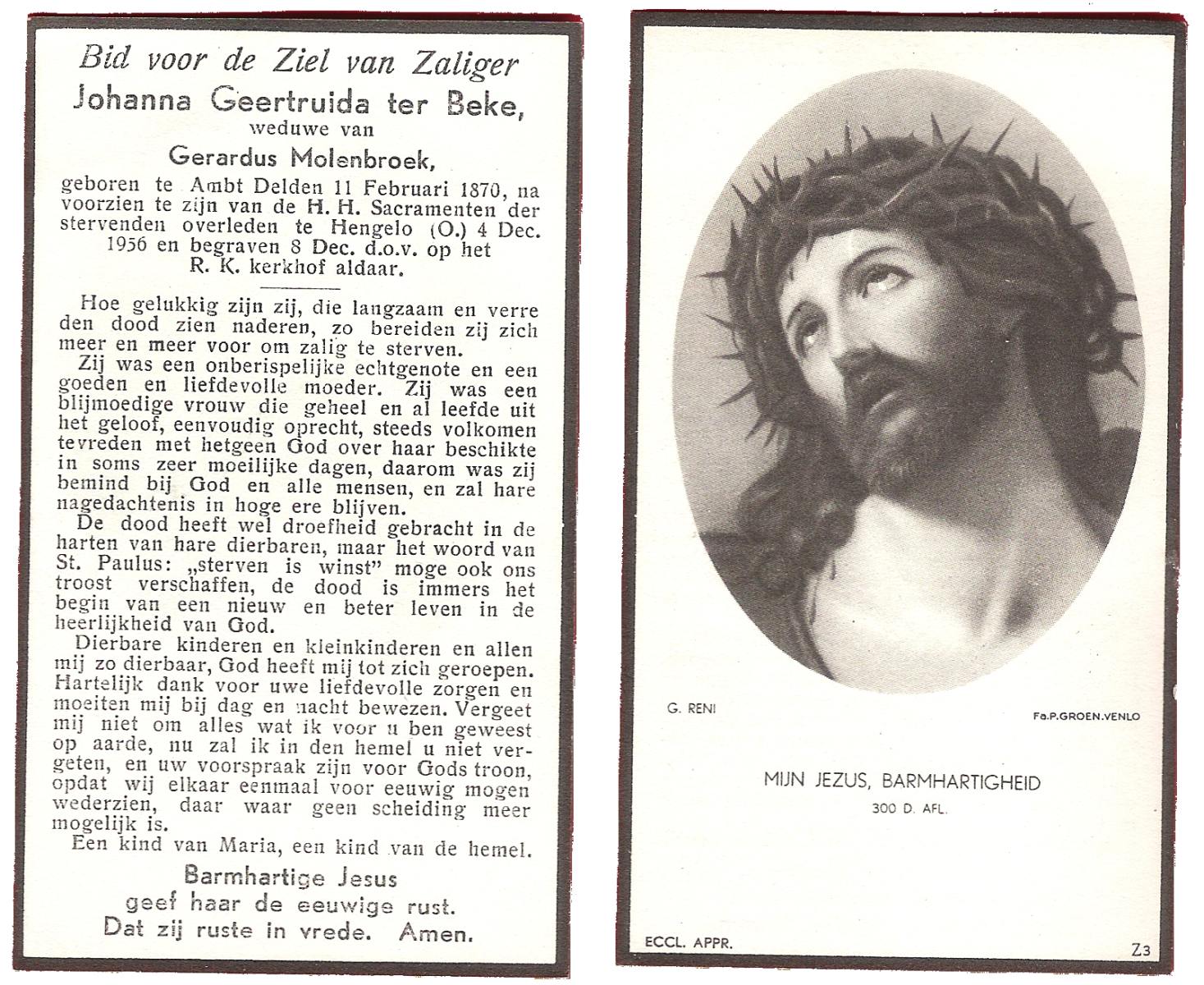 BEKE, ter, Johanna Geertruida, geboren op 11-02-1870, overleden op 4-12-1956 te Hengelo (Ov.) op 85-jarige leeftijd, begraven op 8-12-1956 te Hengelo (Ov.).