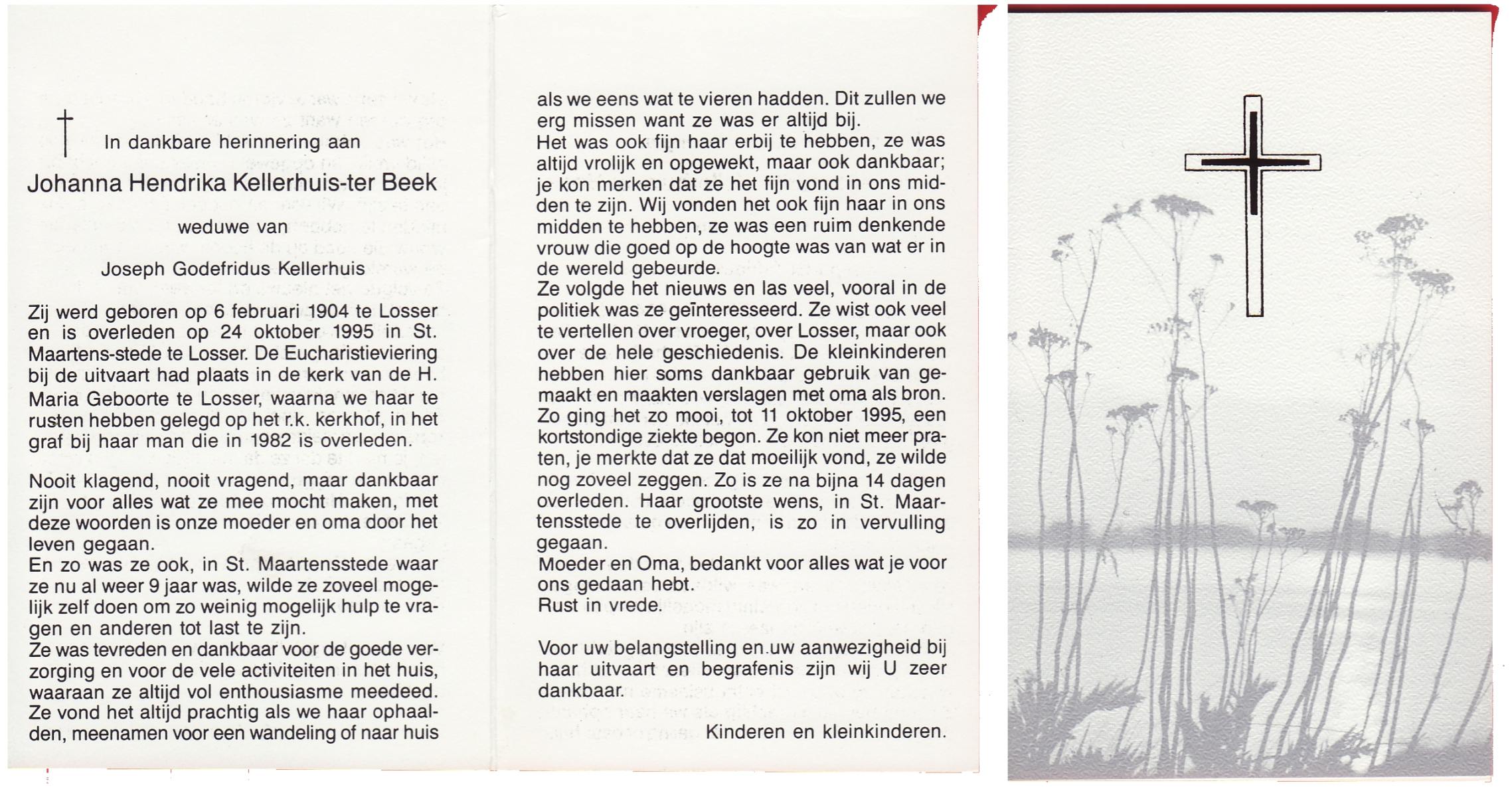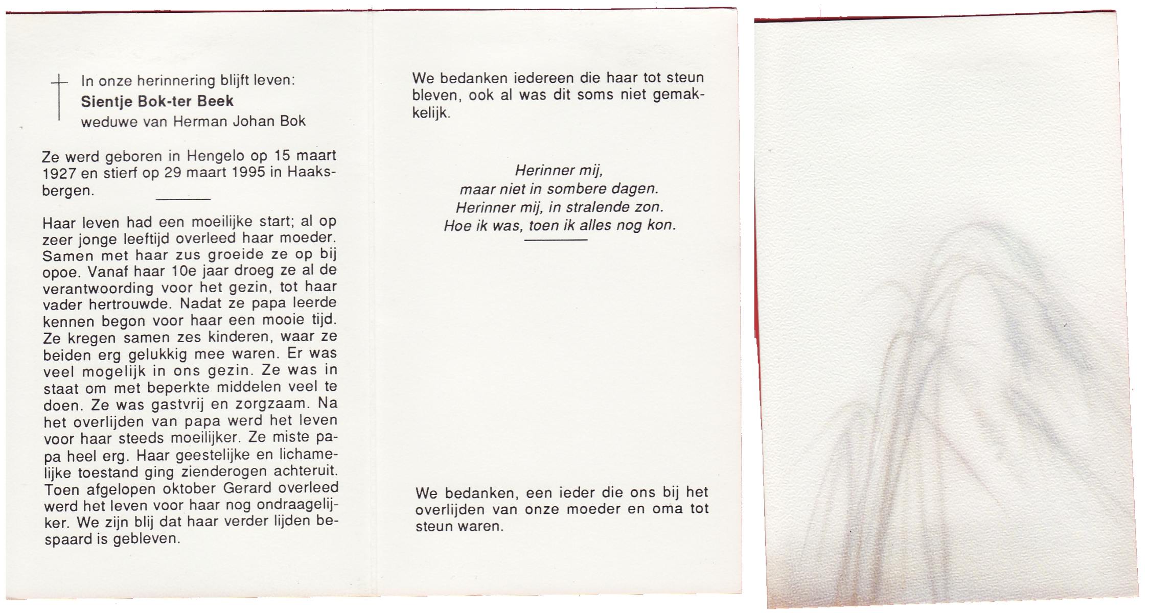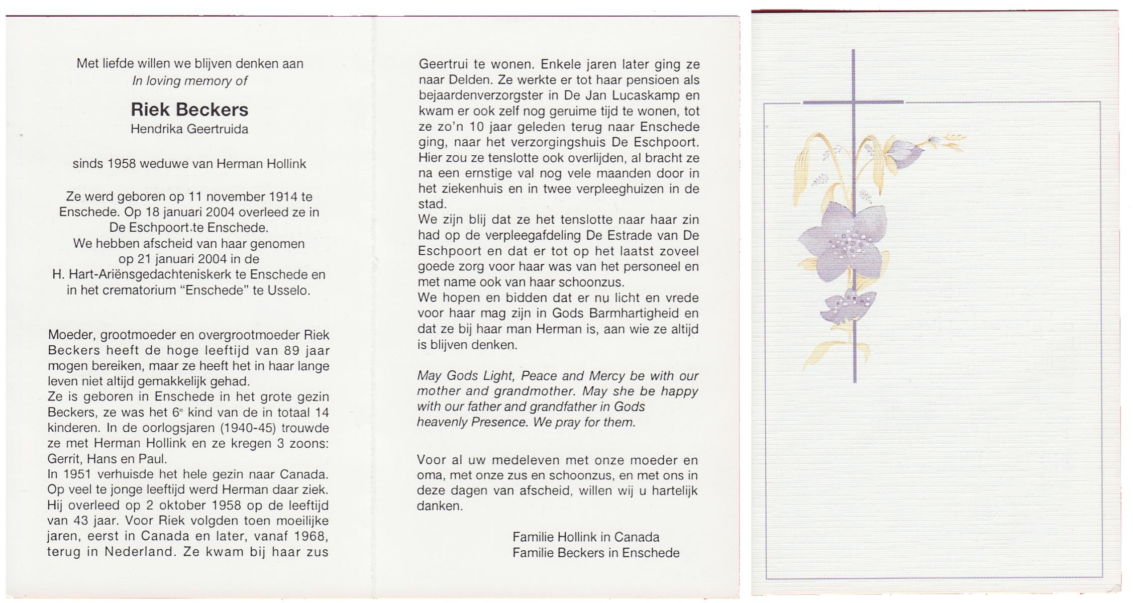 BEKE, ter, Johanna Geertruida, geboren op 11-02-1870, overleden op 4-12-1956 te Hengelo (Ov.) op 85-jarige leeftijd, begraven op 8-12-1956 te Hengelo (Ov.).
