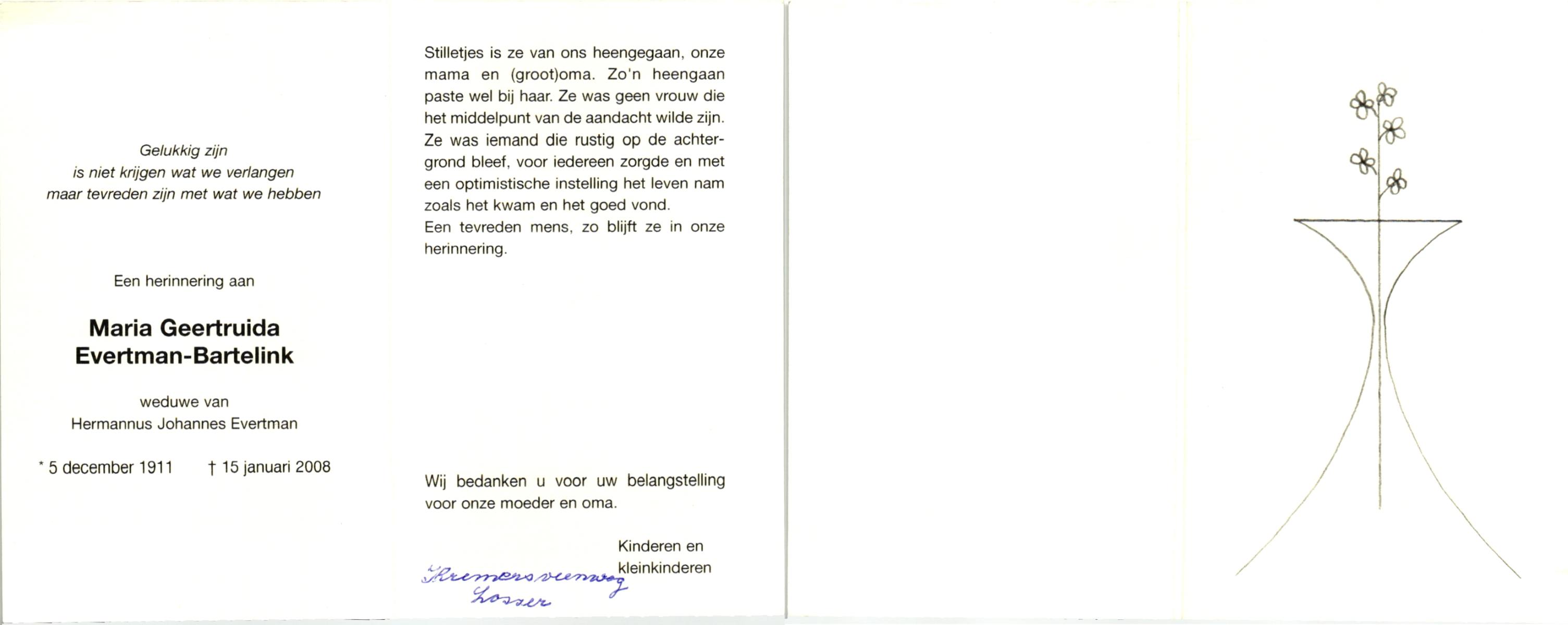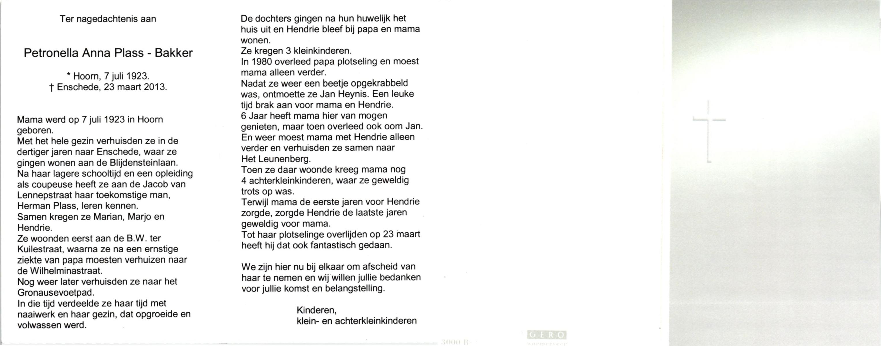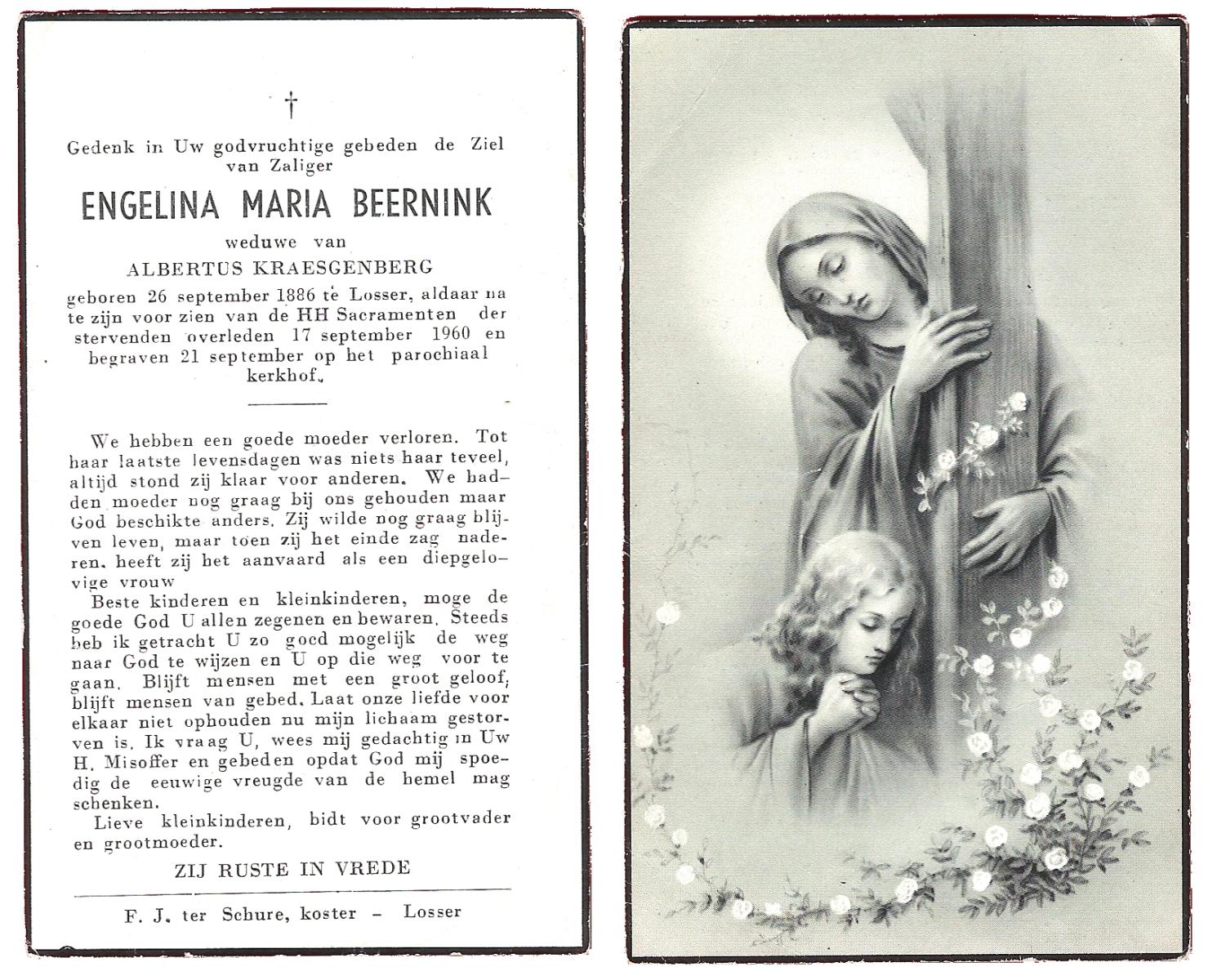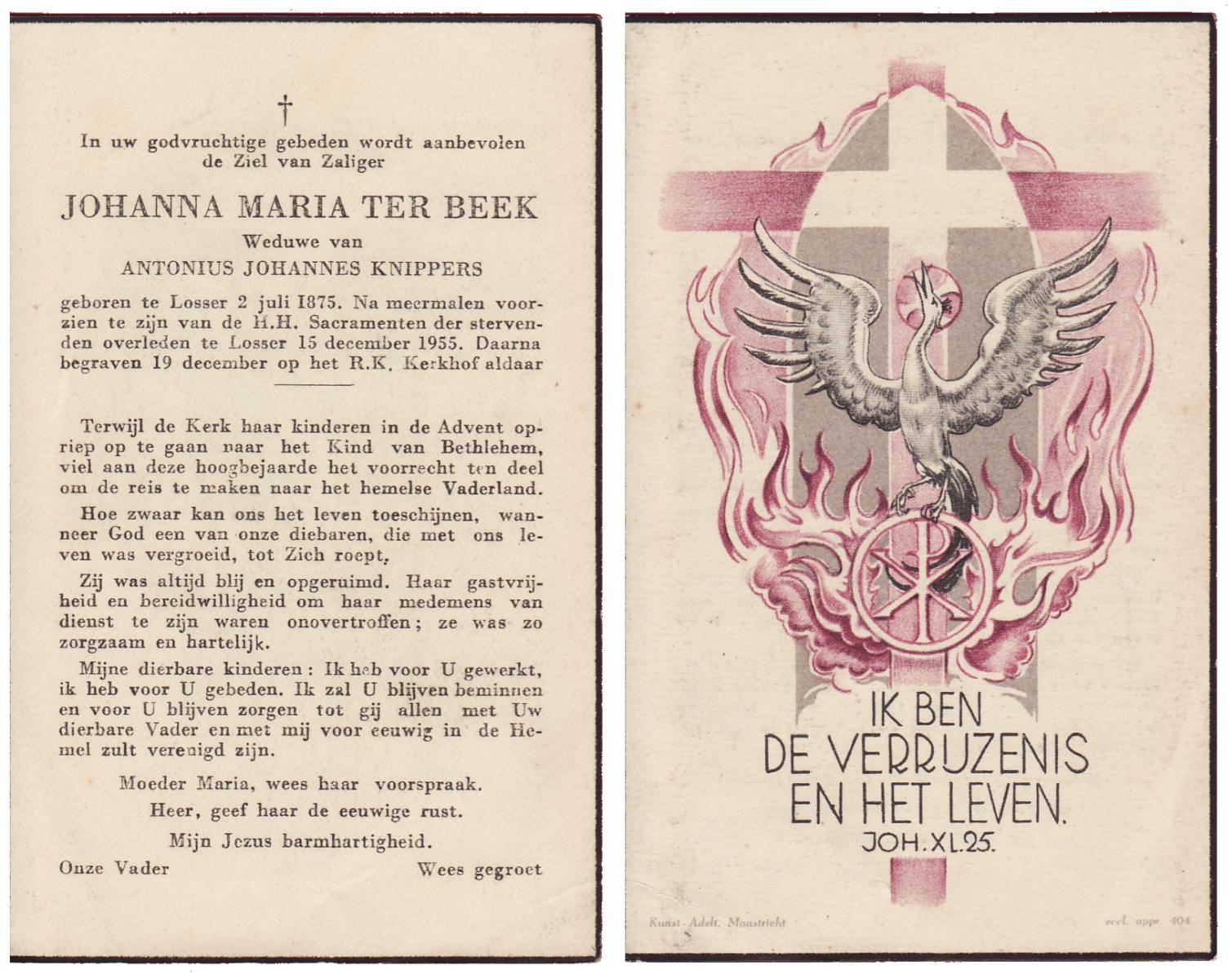 BEKE, ter, Johanna Geertruida, geboren op 11-02-1870, overleden op 4-12-1956 te Hengelo (Ov.) op 85-jarige leeftijd, begraven op 8-12-1956 te Hengelo (Ov.).