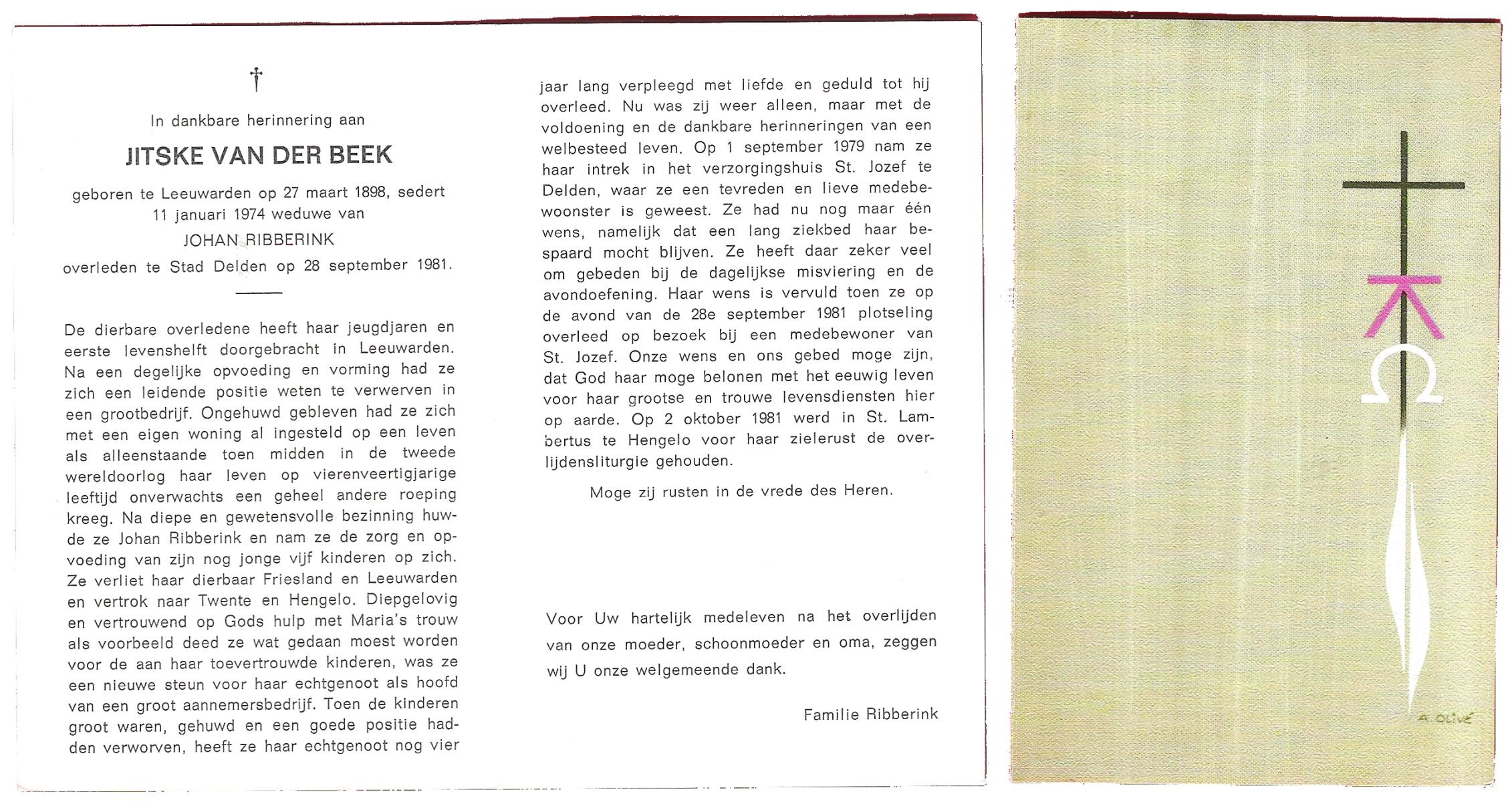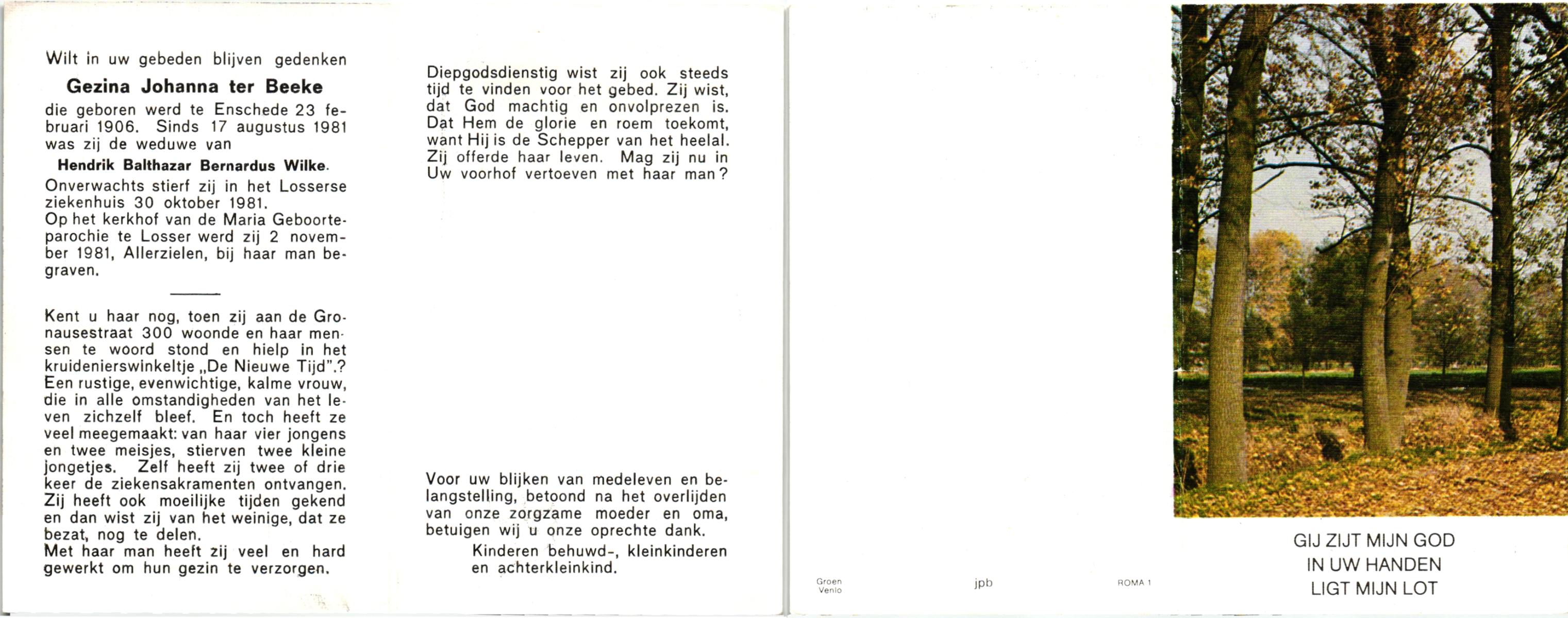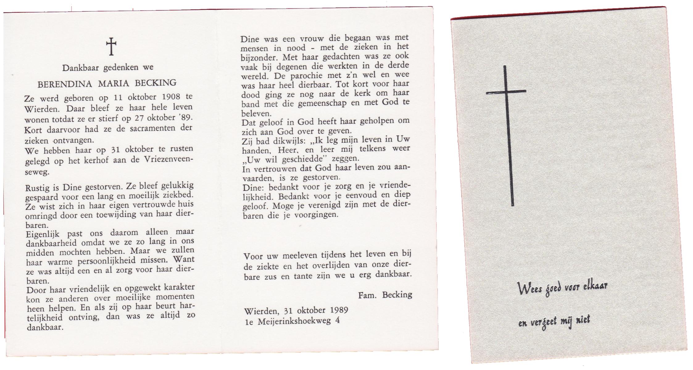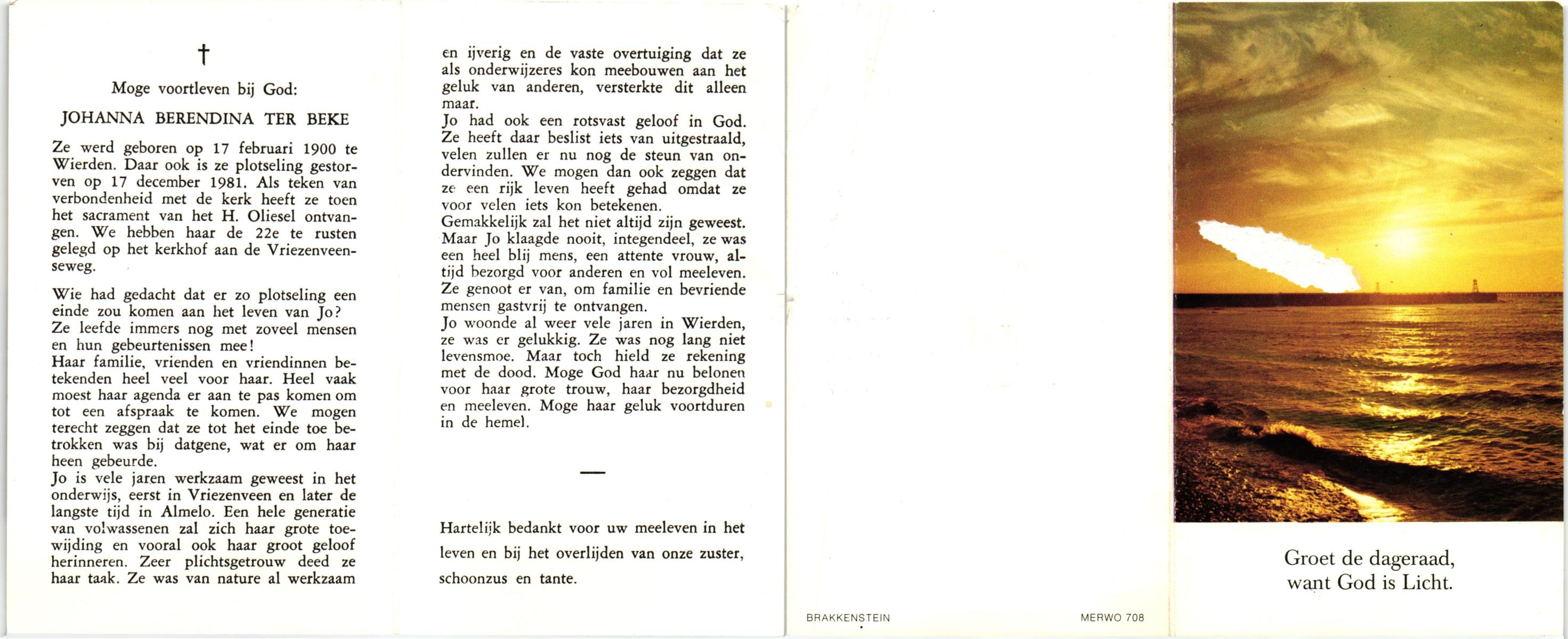 BEKE, ter, Johanna Berendina, geboren op 17-2-1900 te Wierden, overleden op 17-12-1981 te Wierden op 81-jarige leeftijd, begraven op 22-12-1981 te Wierden.