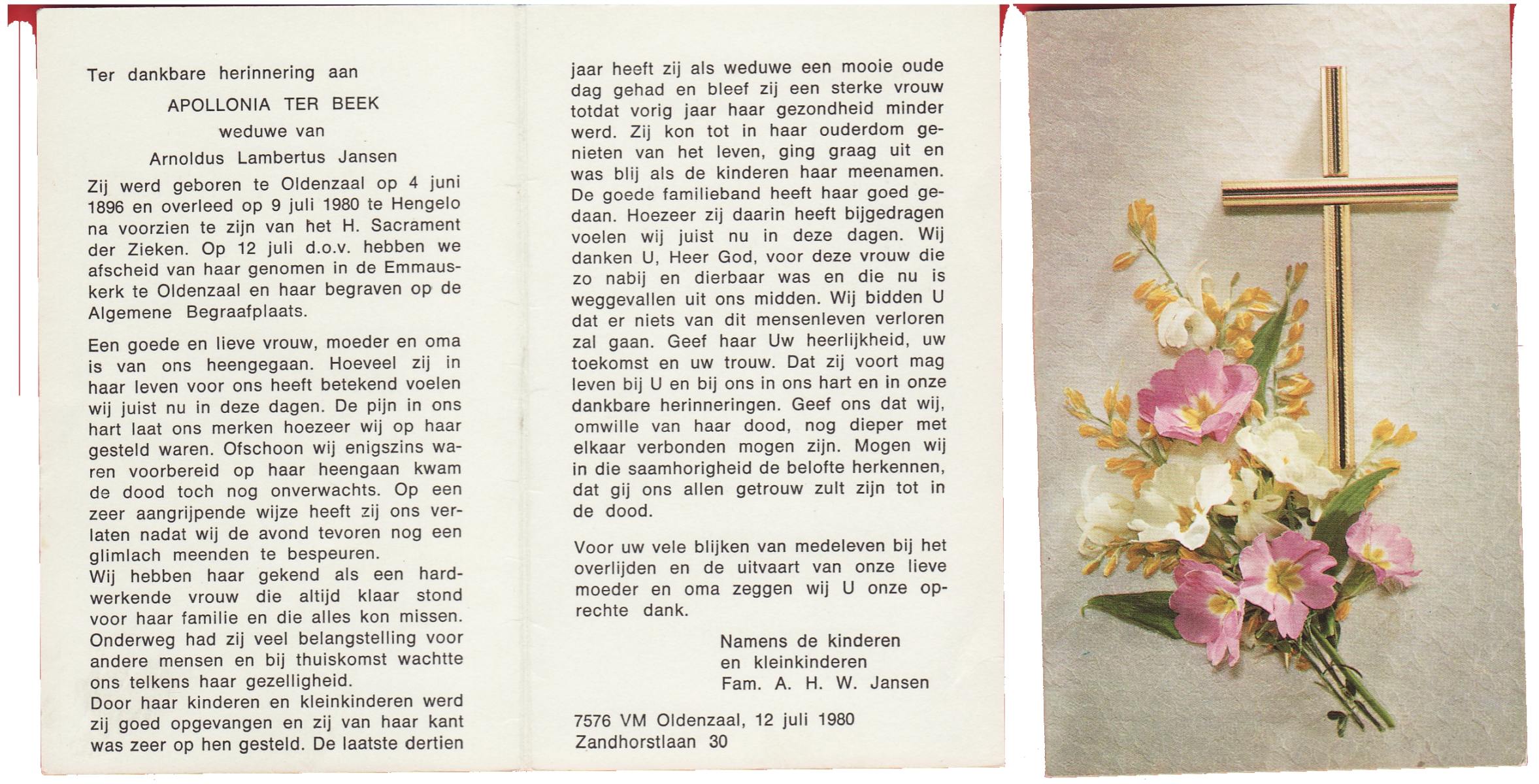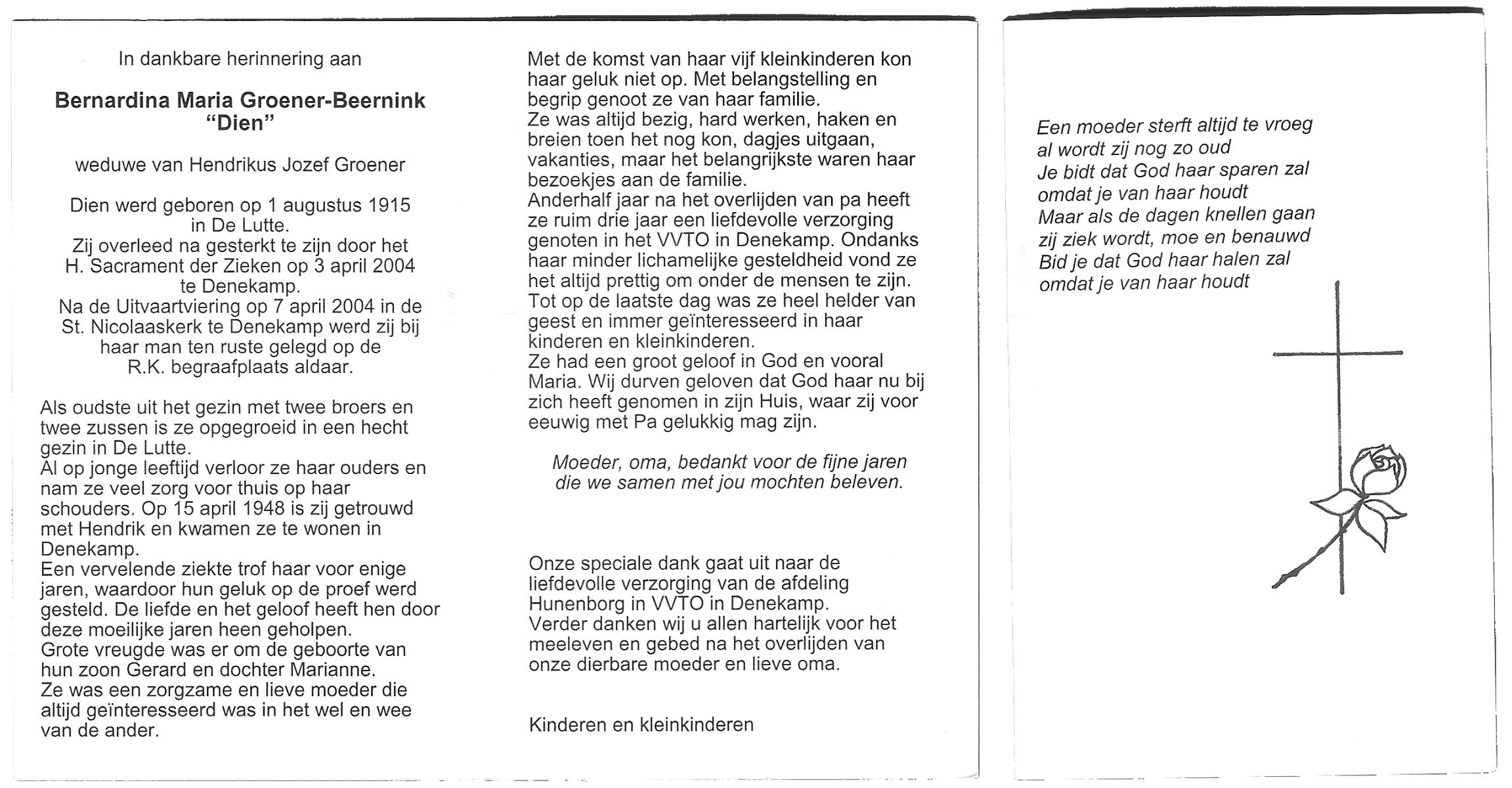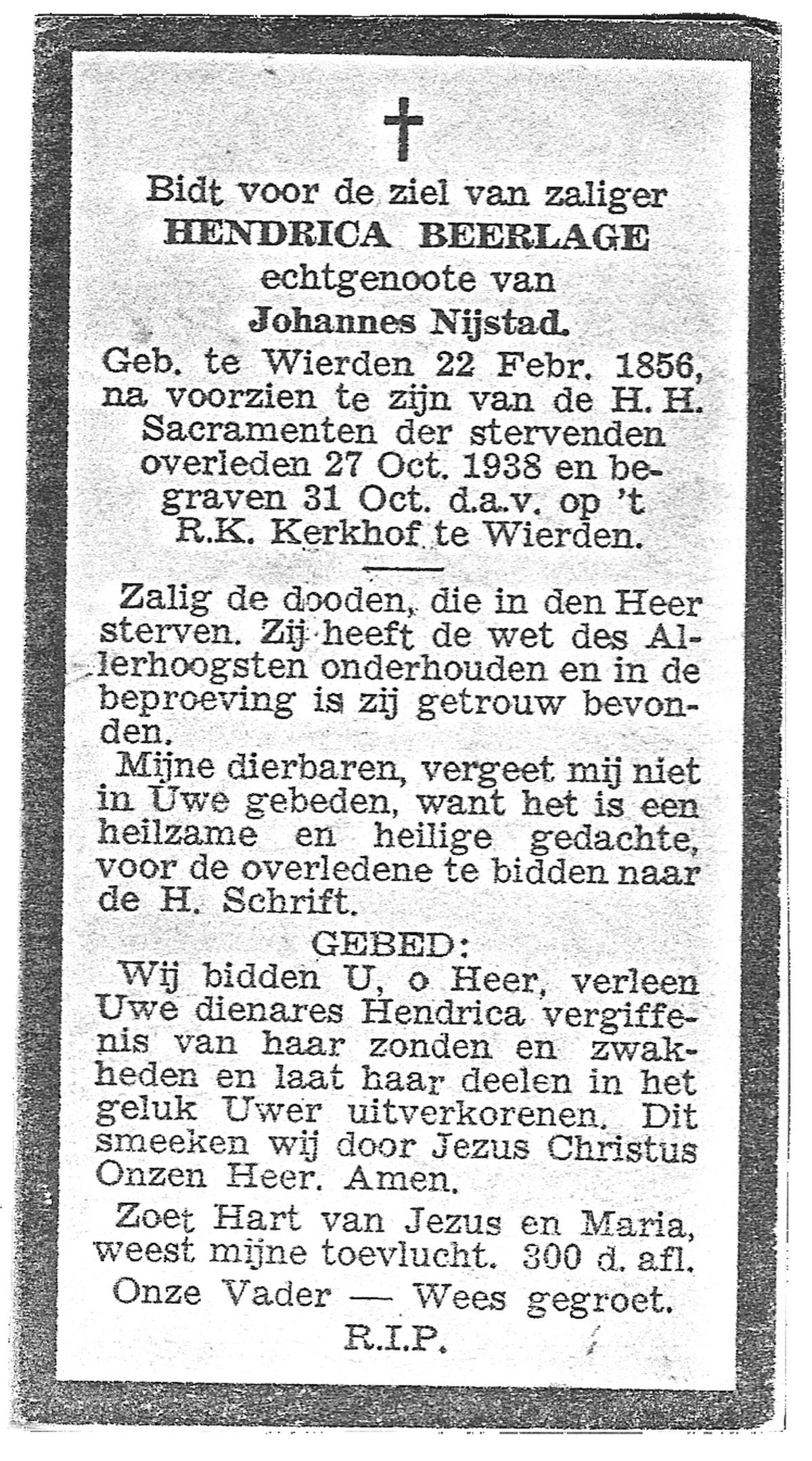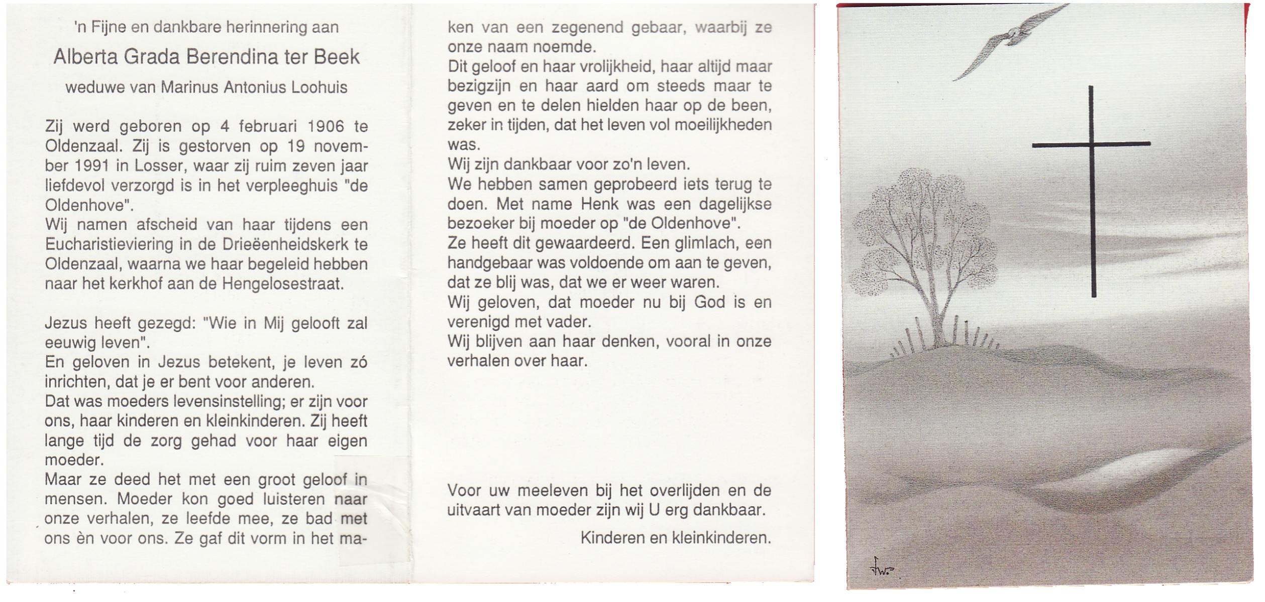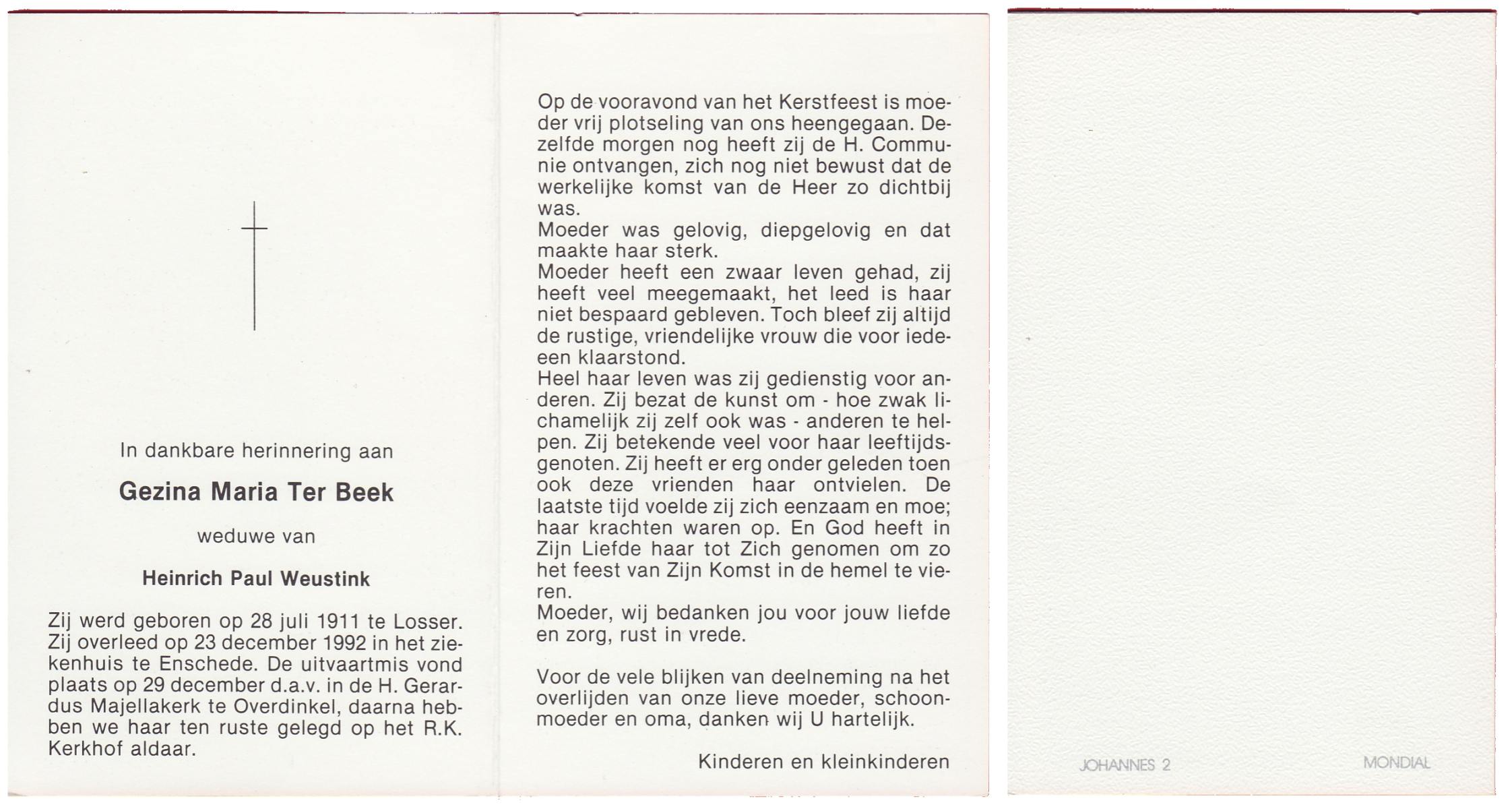 BEKE, ter, Johanna Berendina, geboren op 17-2-1900 te Wierden, overleden op 17-12-1981 te Wierden op 81-jarige leeftijd, begraven op 22-12-1981 te Wierden.