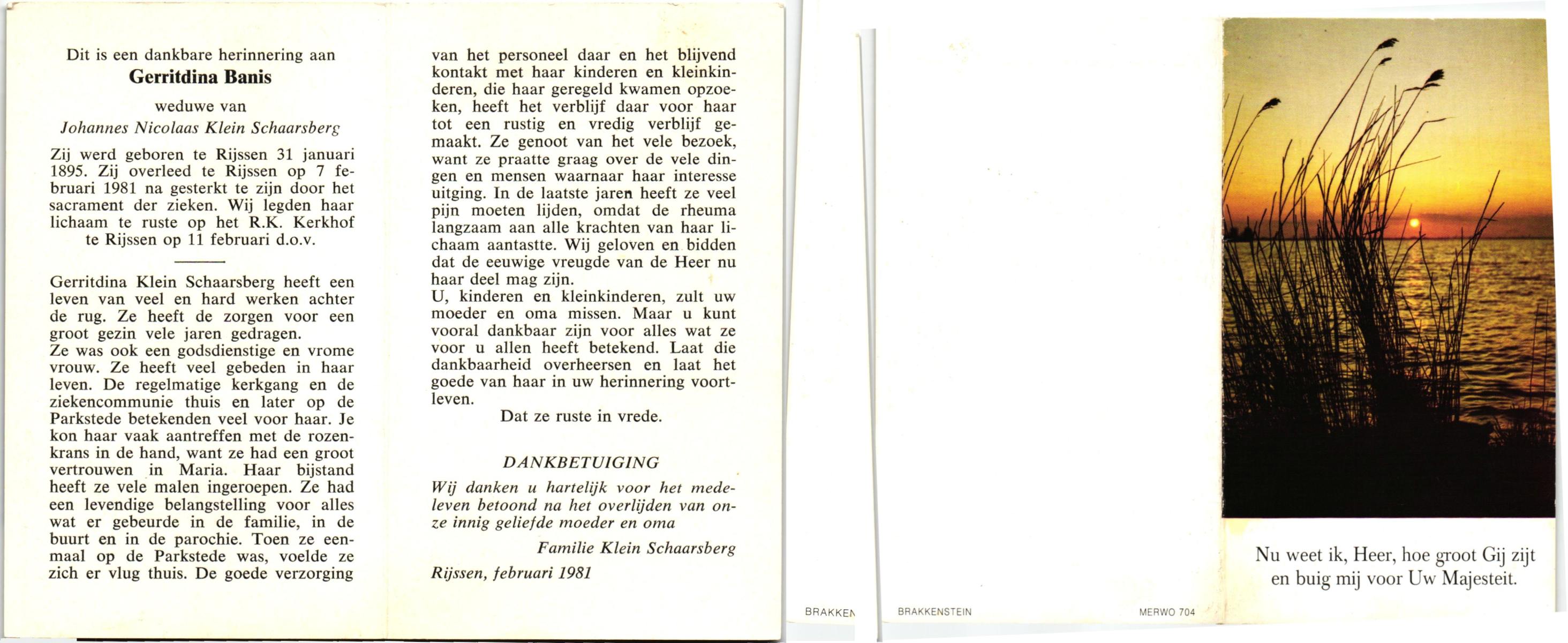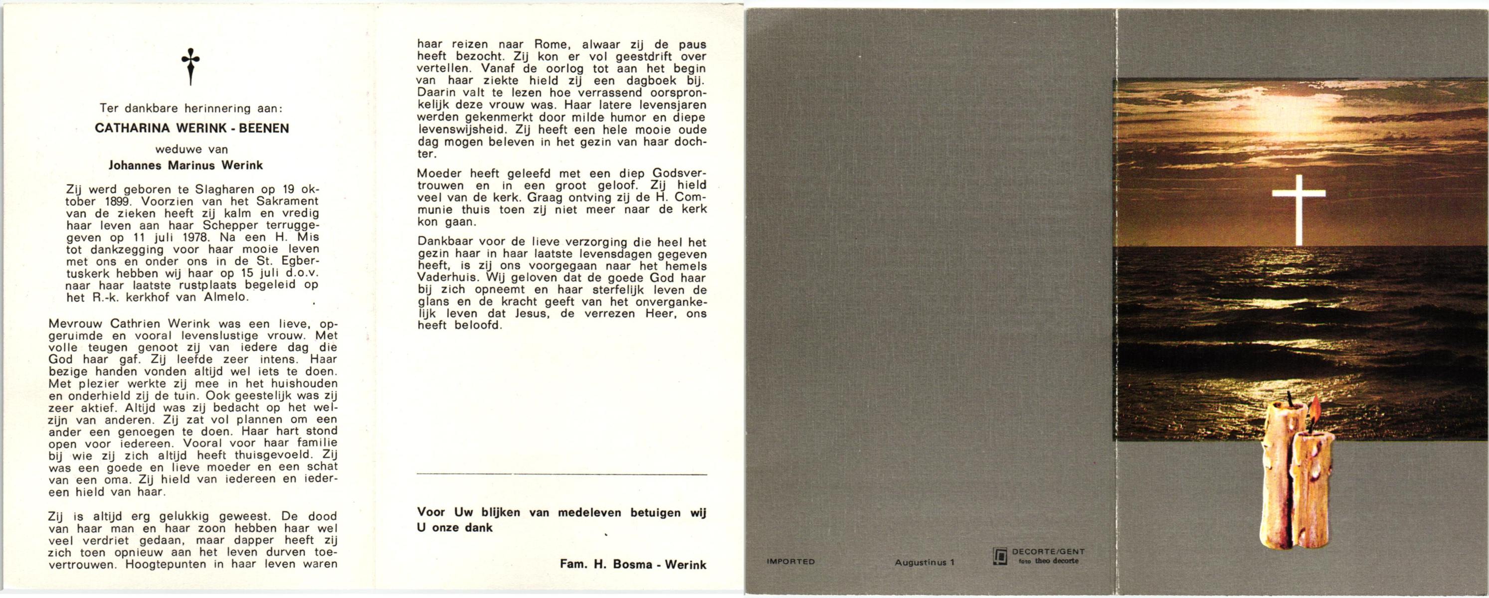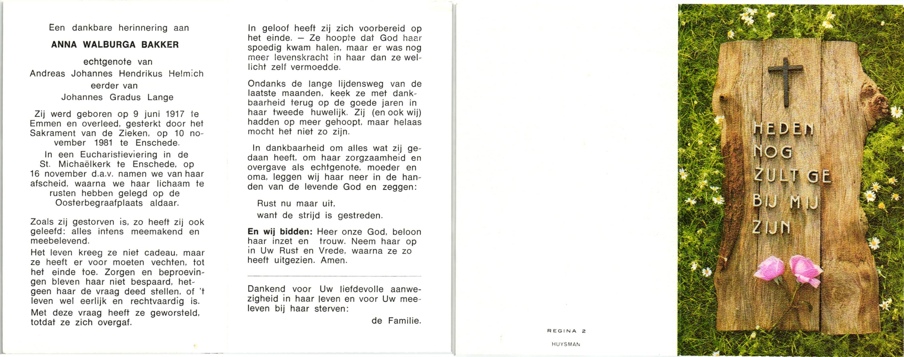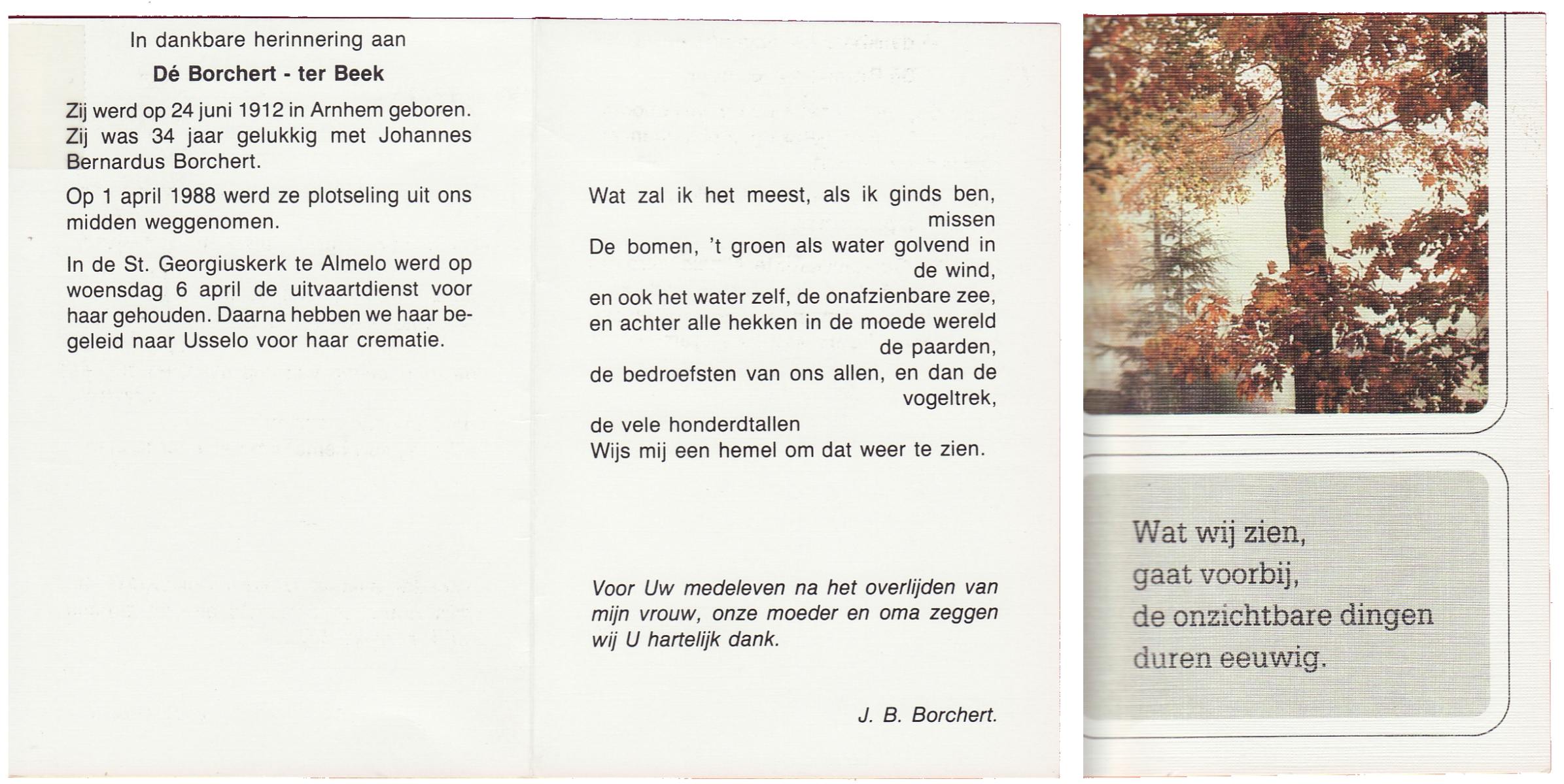 BEKE, ter, Johanna Berendina, geboren op 17-2-1900 te Wierden, overleden op 17-12-1981 te Wierden op 81-jarige leeftijd, begraven op 22-12-1981 te Wierden.