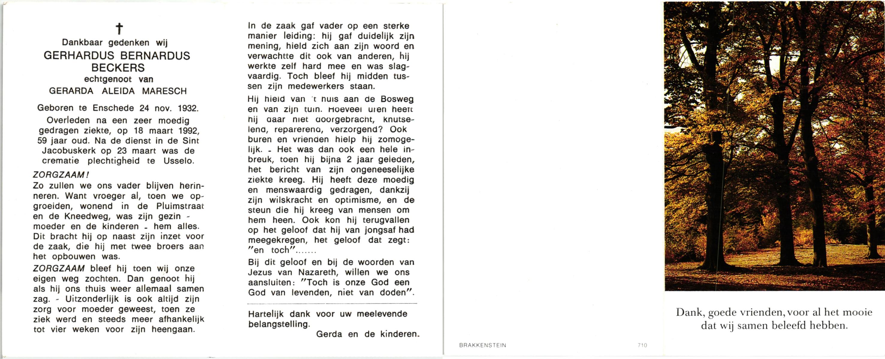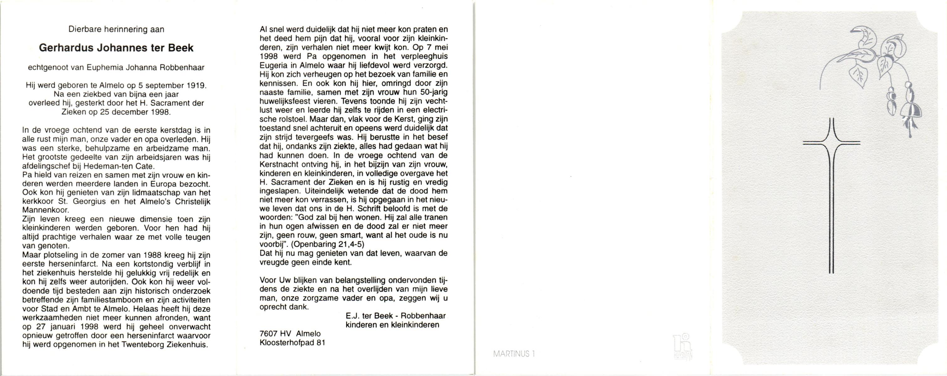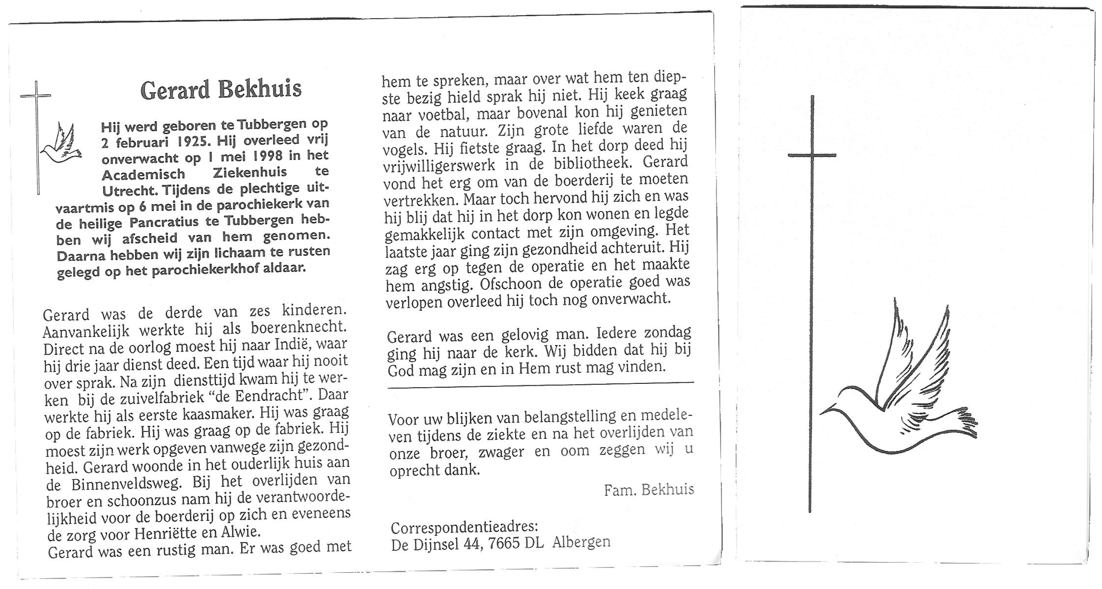 BEKHUIS, Gerard, geboren op 2-2-1925 te Tubbergen, overleden op 1-5-1998 te Utrecht op 73-jarige leeftijd, begraven op 6-5-1998 te Tubbergen.