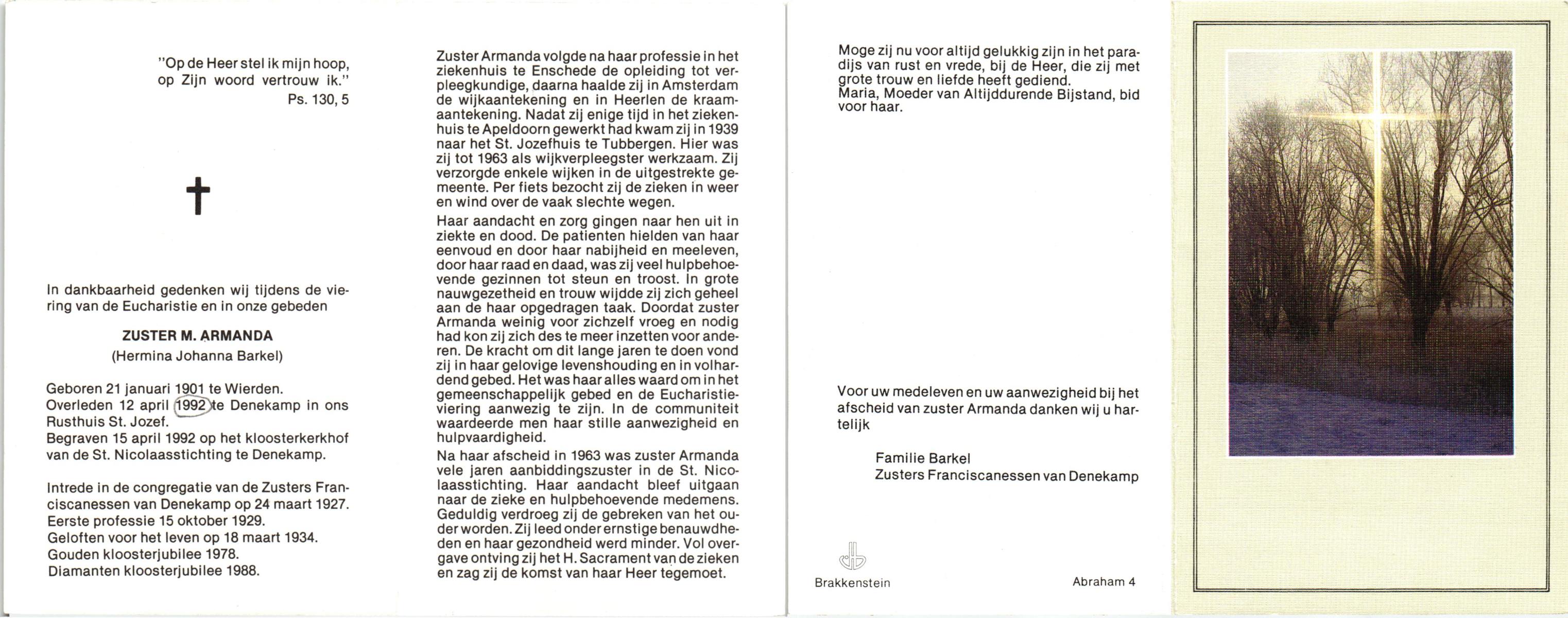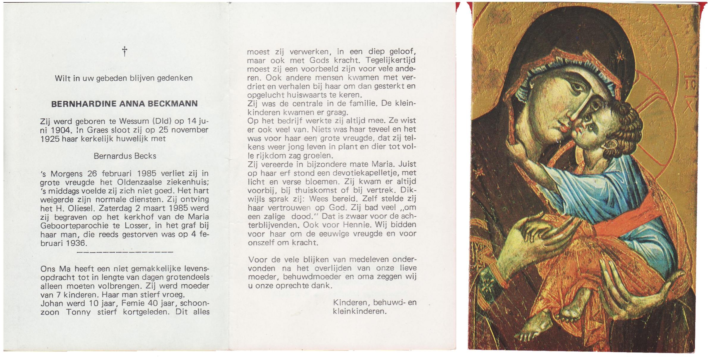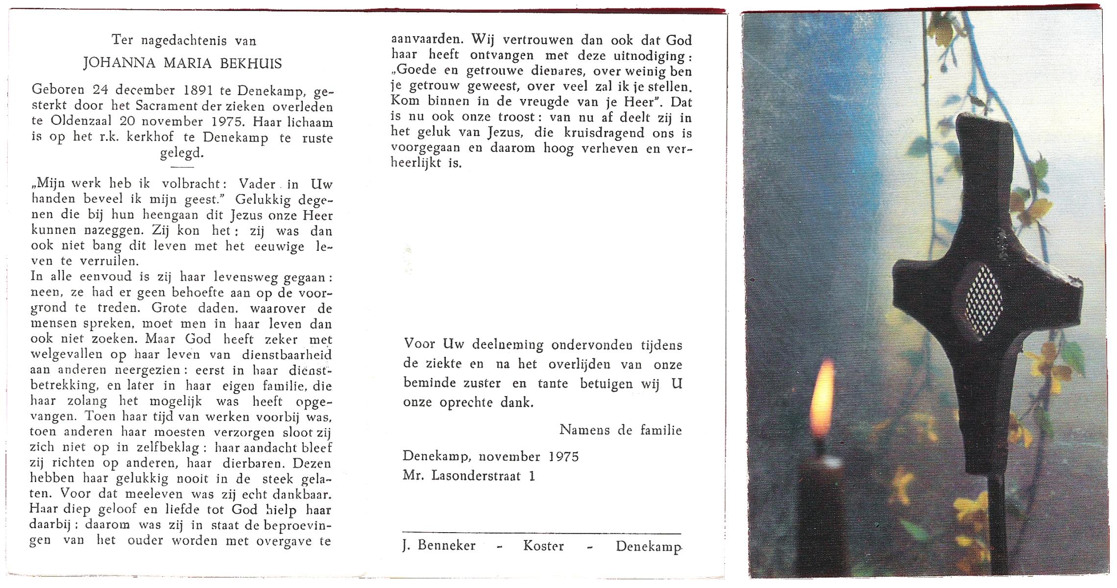 BEKHUIS, Johanna Maria, geboren op 24-12-1891 te Denekamp, overleden op 20-11-1975 te Oldenzaal op 84-jarige leeftijd, begraven te Denekamp.