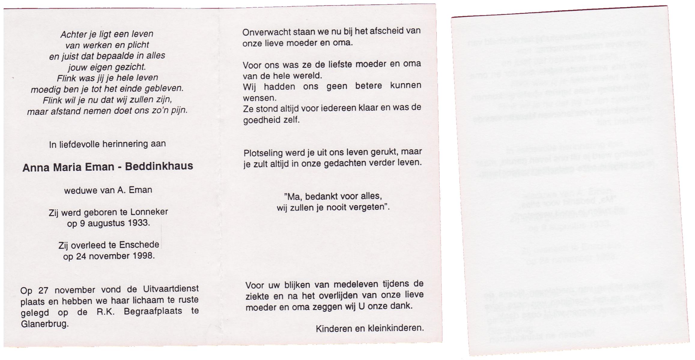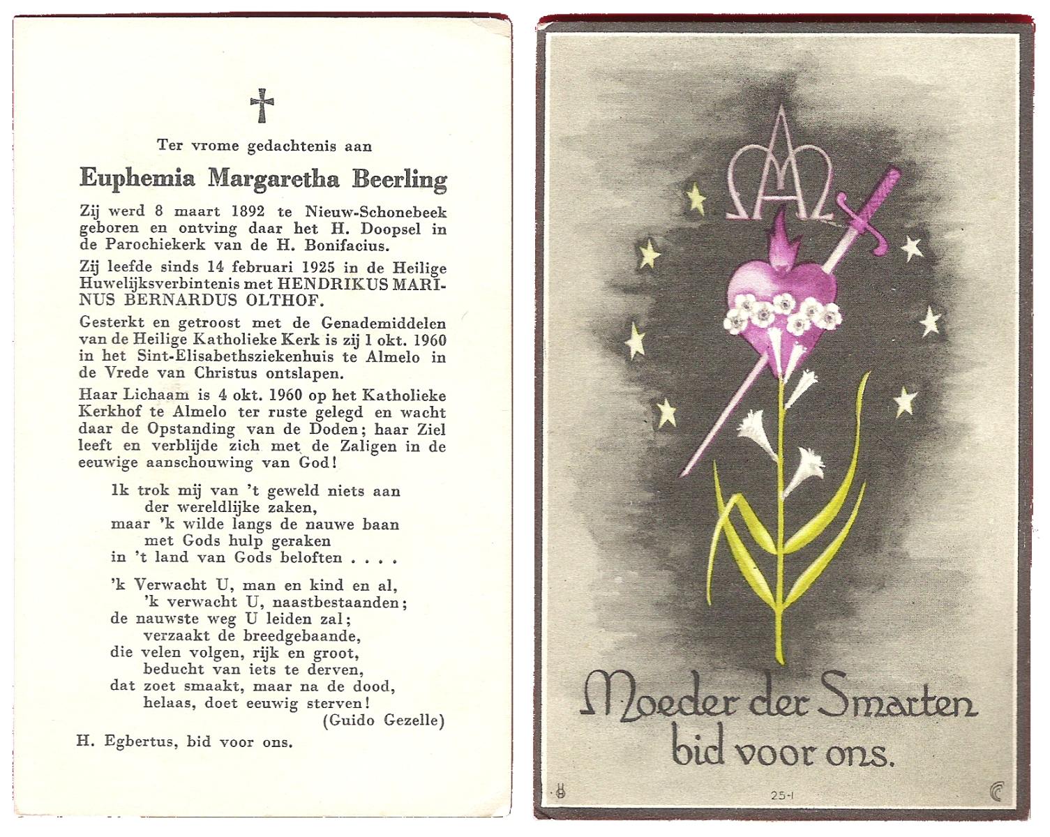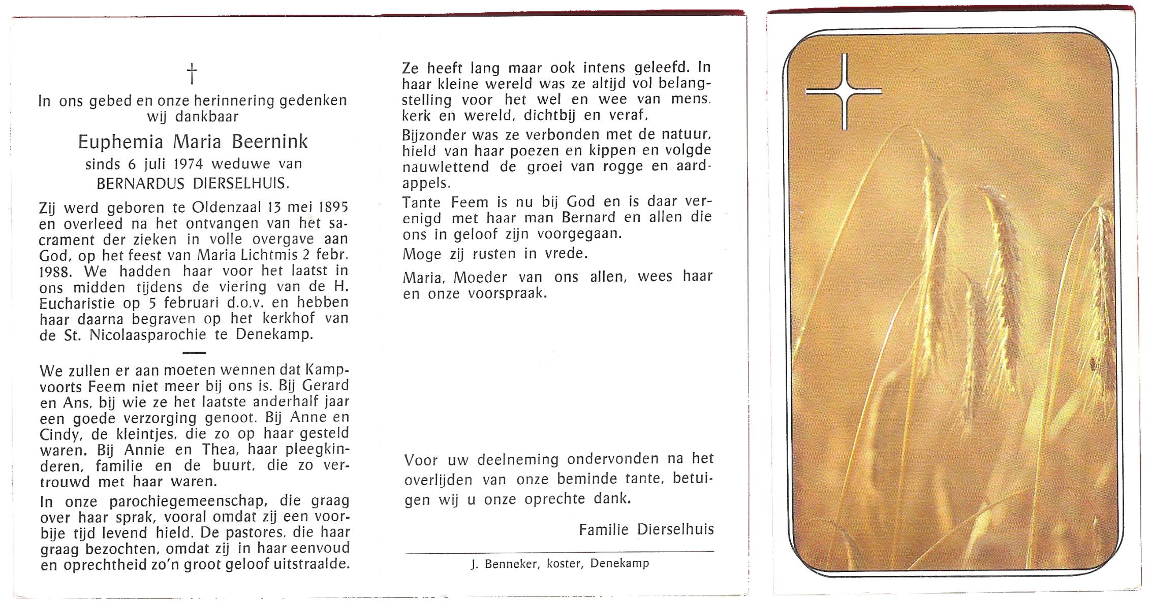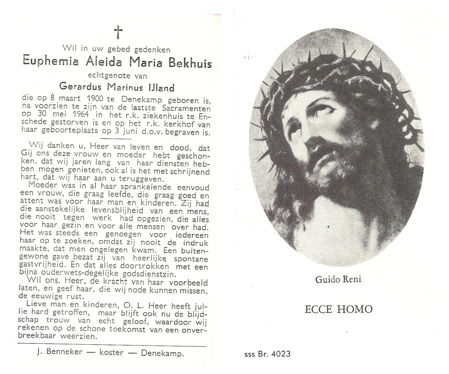BEKHUIS, Euphemia Aleida Maria, geboren op 8-3-1900 te Denekamp, overleden op 30-5-1964 te Enschede op 64-jarige leeftijd, begraven op 3-6-1964 te Denekamp.
