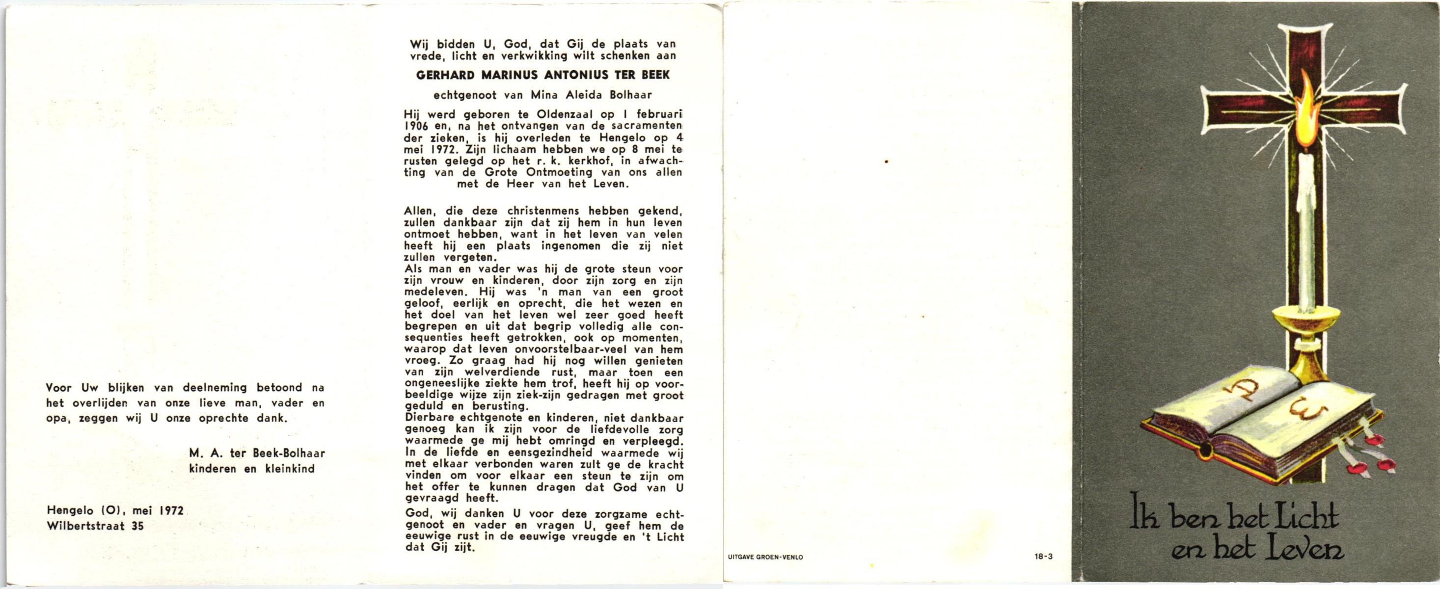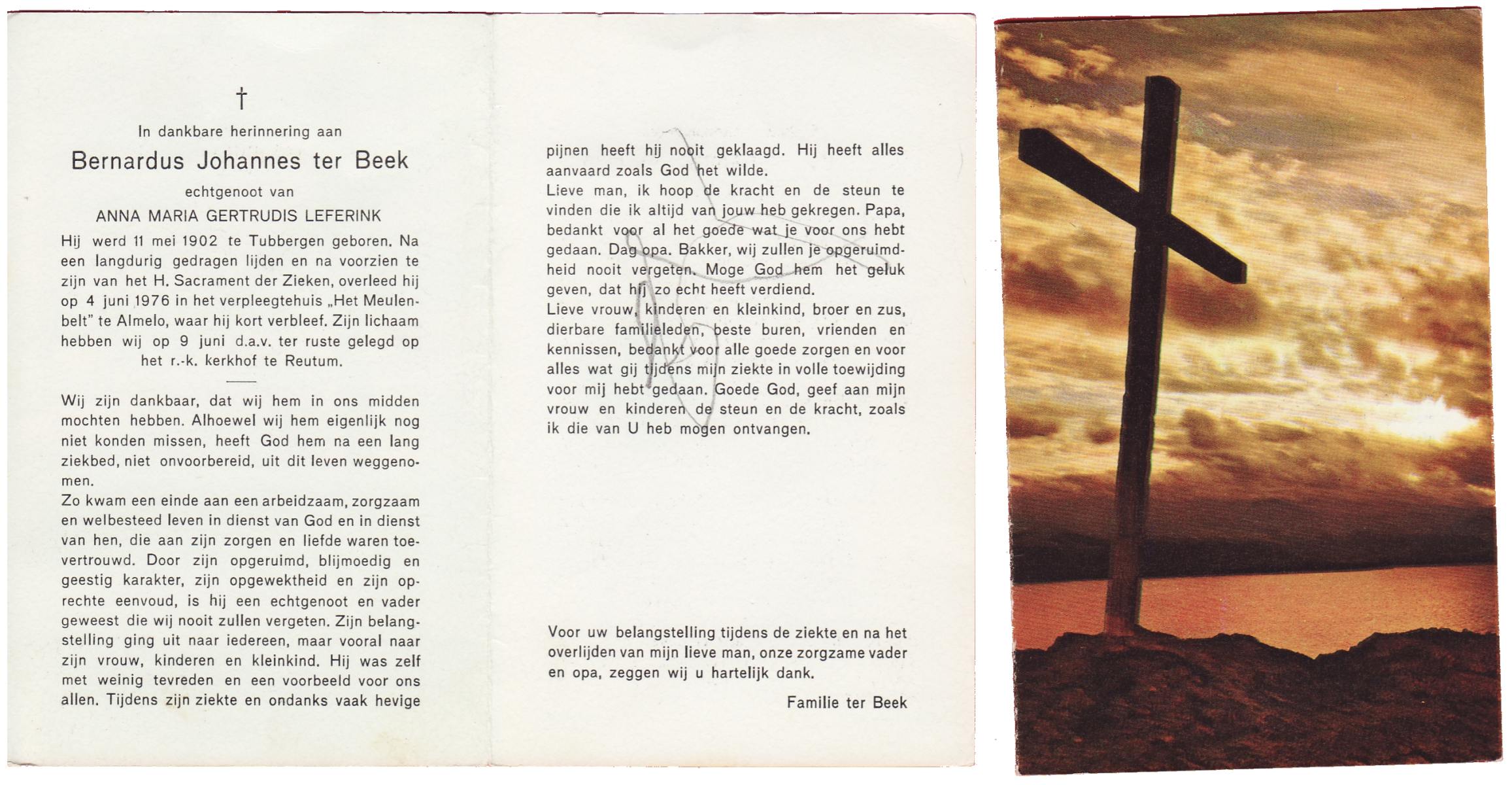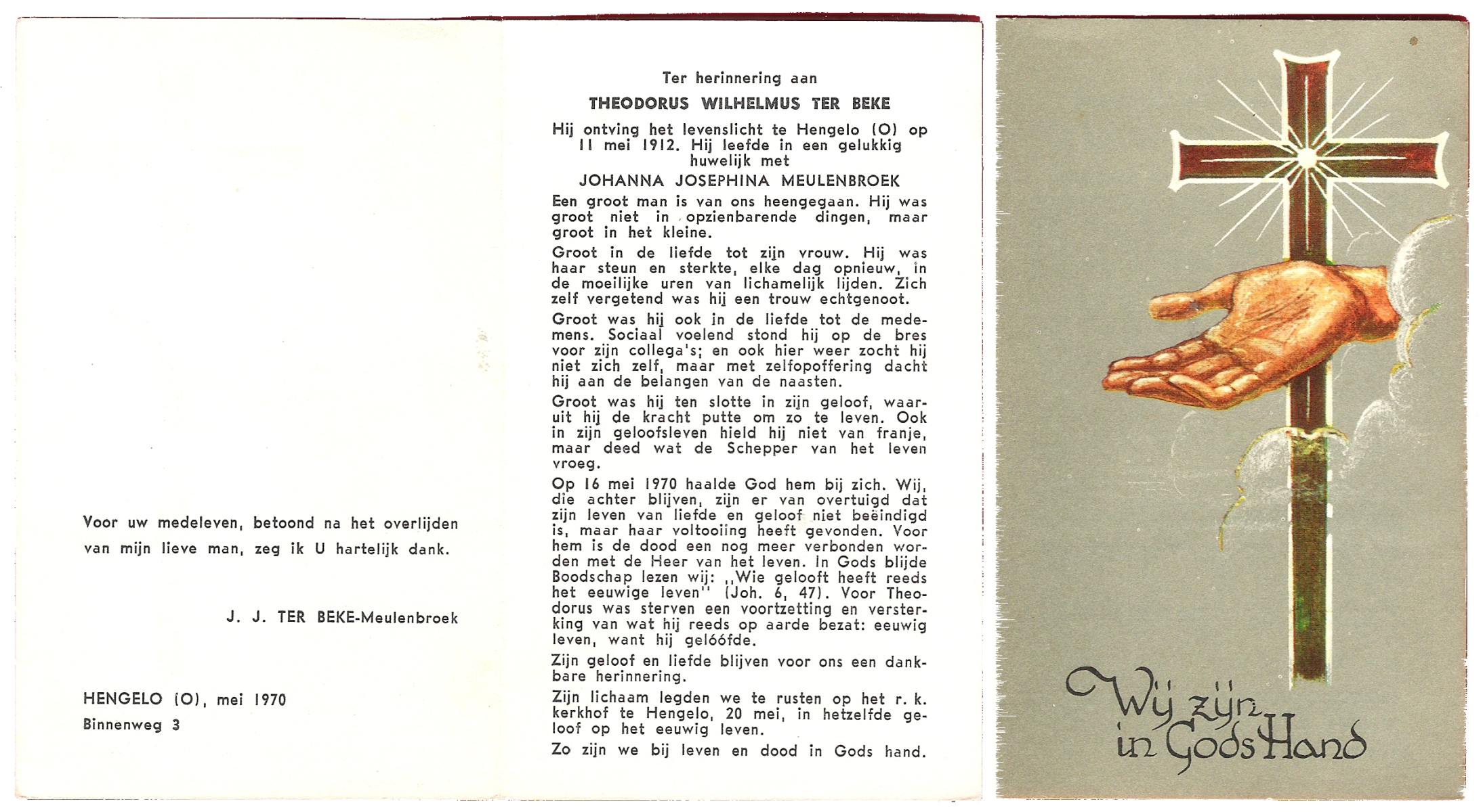 BEKE, ter, Theodorus Wilhelmus, geboren op 11-5-1912 te Hengelo (O), overleden op 16-5-1970 op 58-jarige leeftijd, begraven op 20-5-1970 te Hengelo (Ov.).