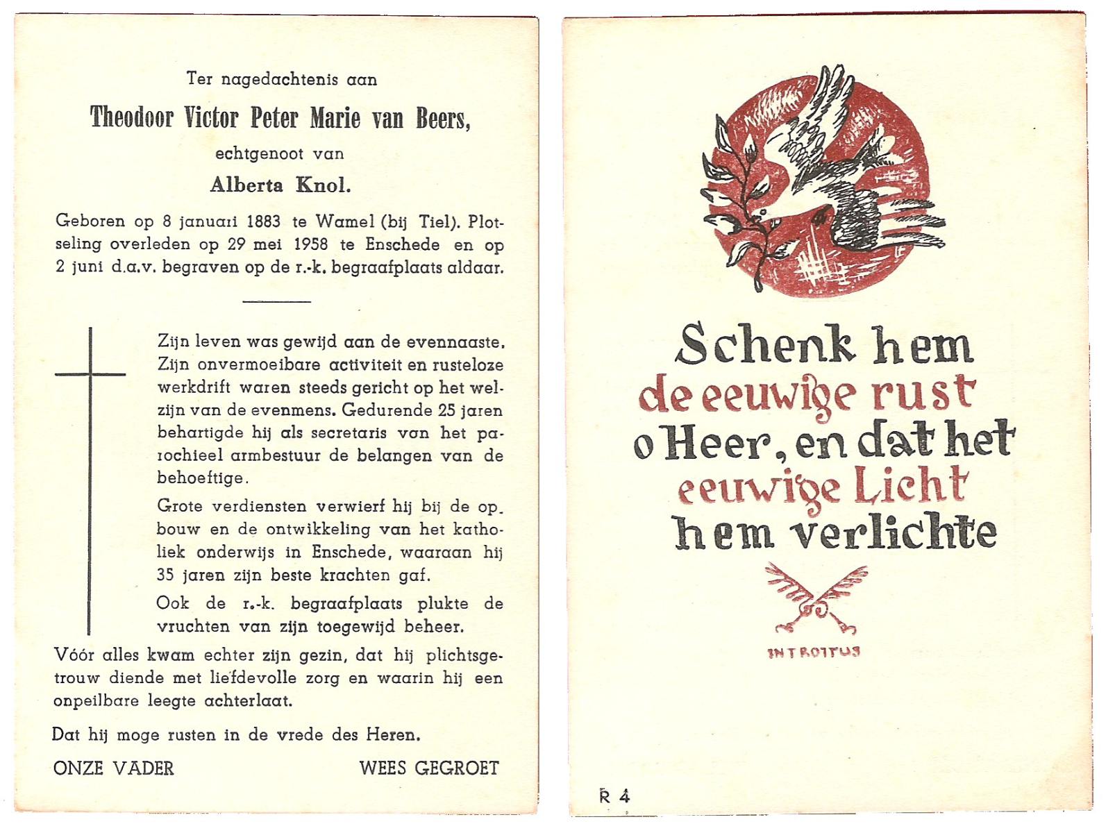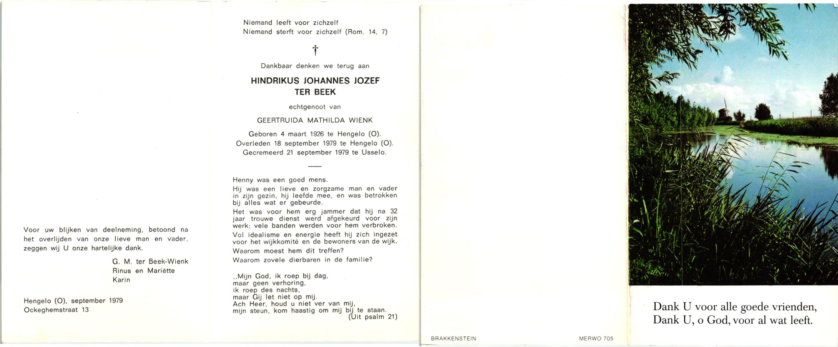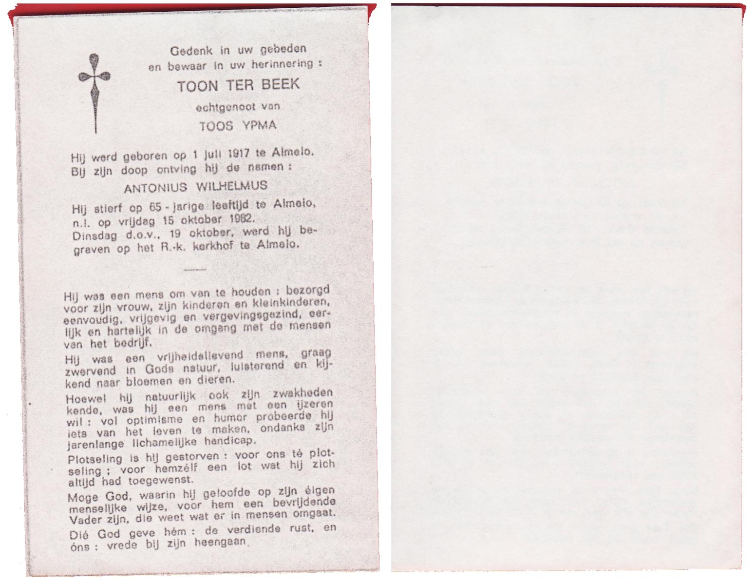 BEKE, ter, Theodorus Wilhelmus, geboren op 11-5-1912 te Hengelo (O), overleden op 16-5-1970 op 58-jarige leeftijd, begraven op 20-5-1970 te Hengelo (Ov.).