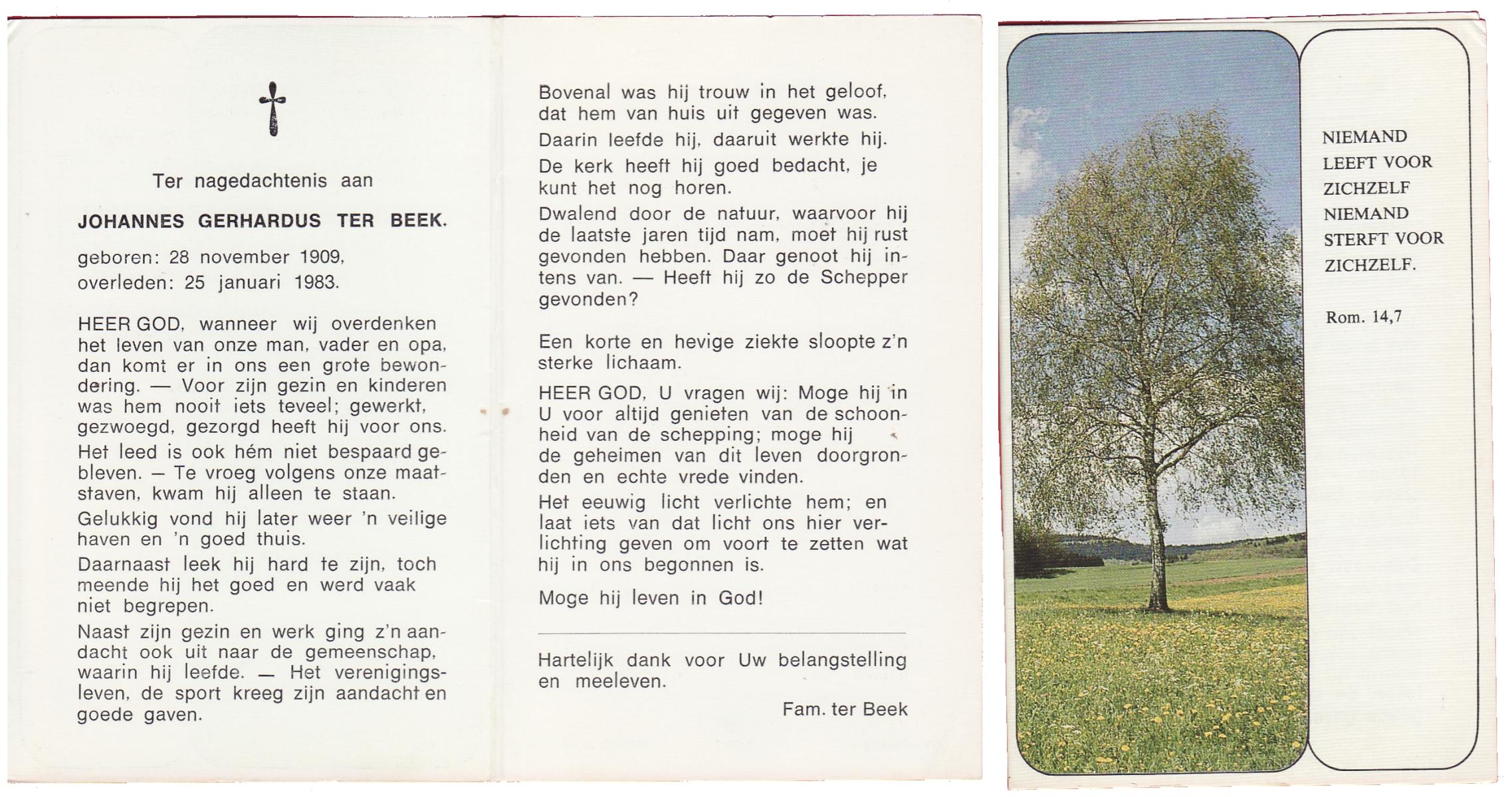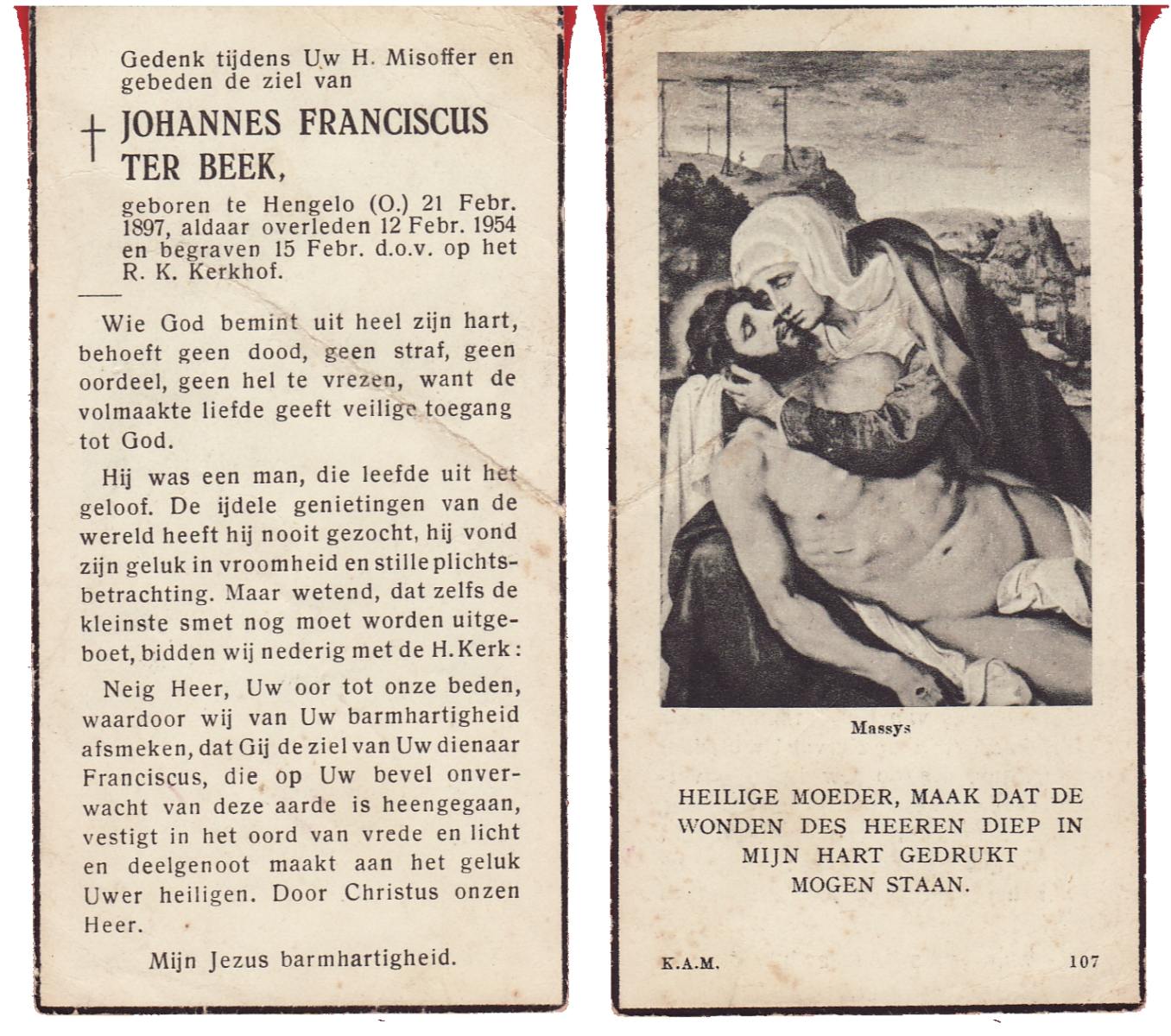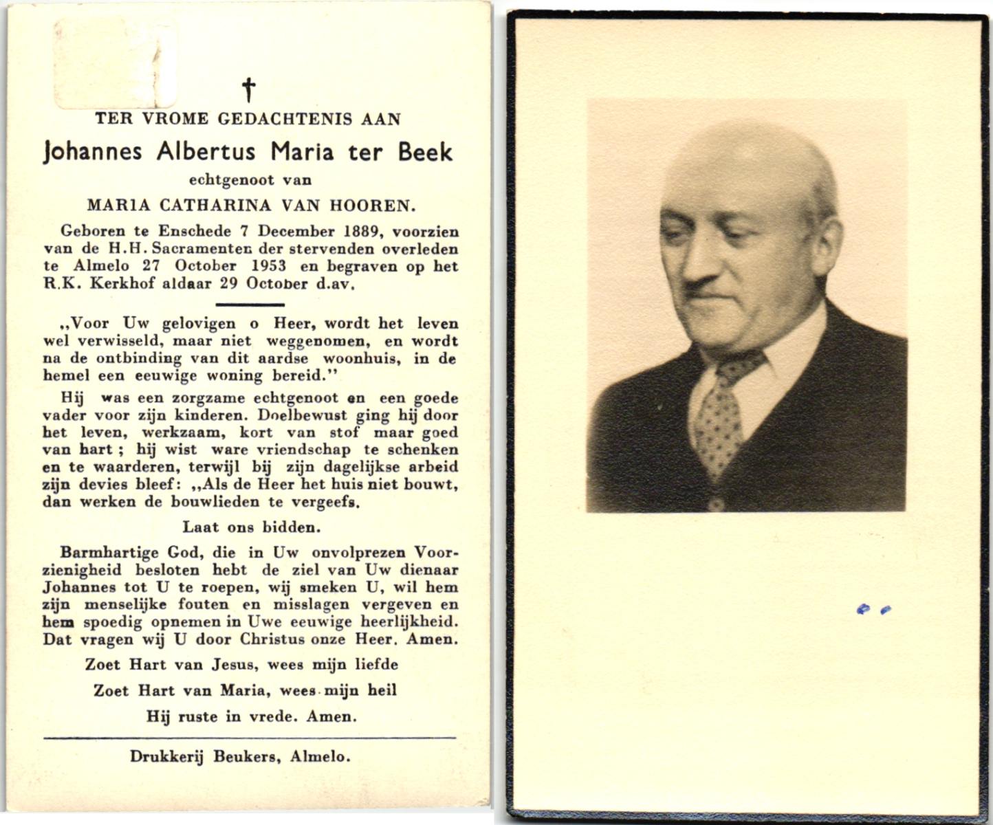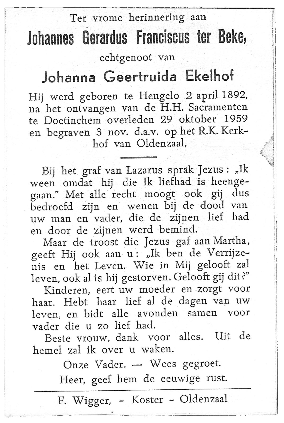 BEKE, ter, Johannes Gerardus Franciscus, geboren op 02-04-1892 te Hengelo (O), overleden op 29-10-1959 te Doetinchem op 67-jarige leeftijd, begraven op 3-11-1959 te Oldenzaal.