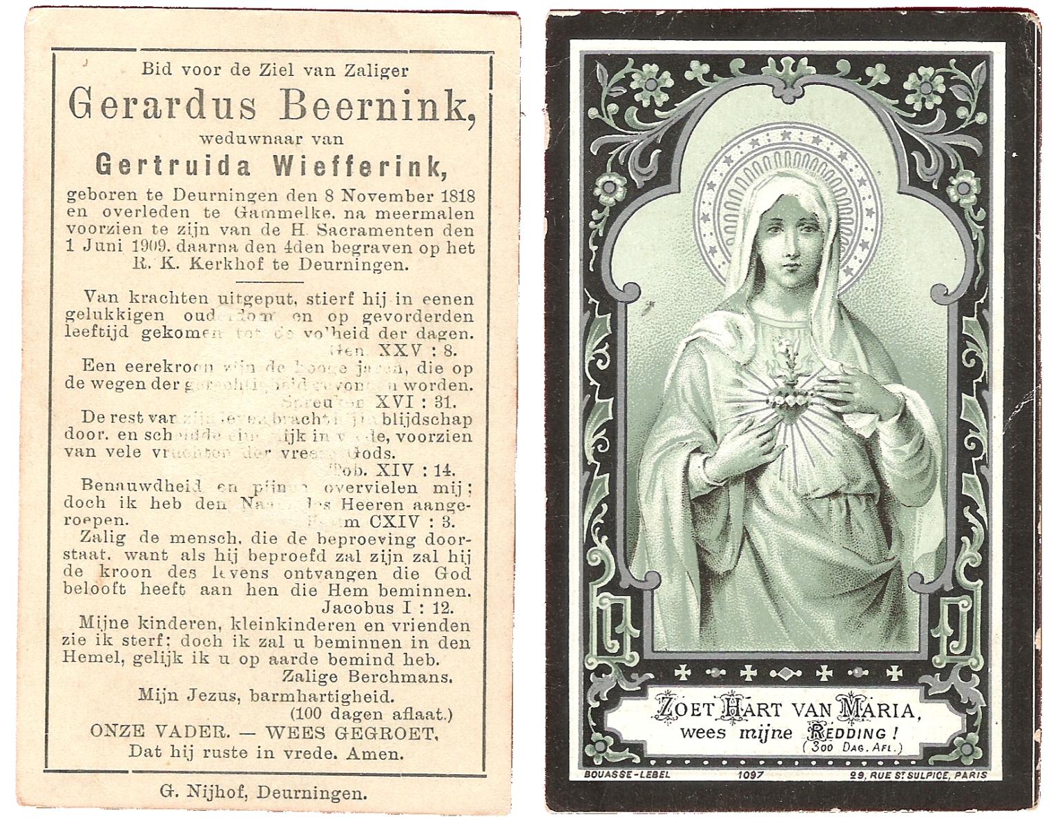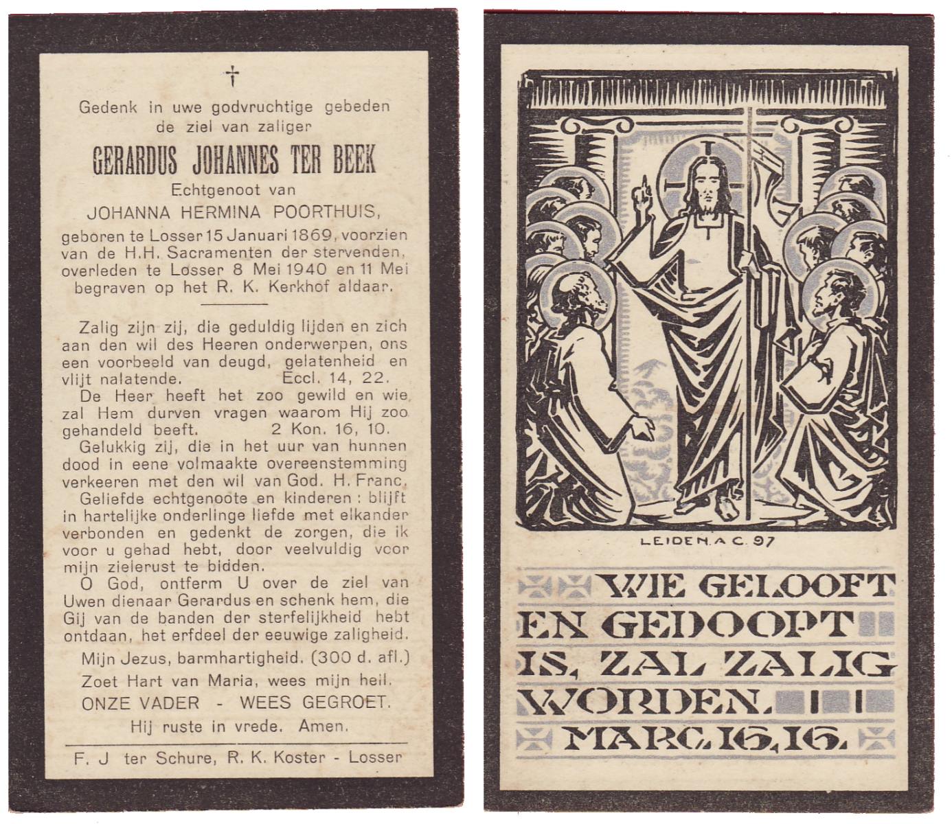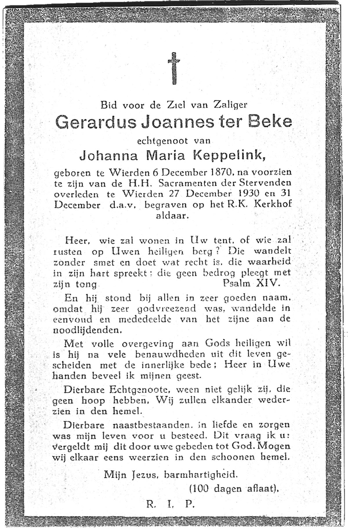 BEKE, ter, Gerardus Joannes, geboren op 06-12-1870 te Wierden, overleden op 27-12-1930 te Wierden op 60-jarige leeftijd, begraven op 31-12-1930 te Wierden.