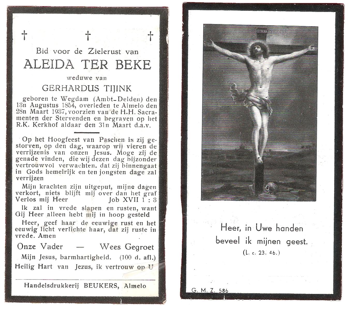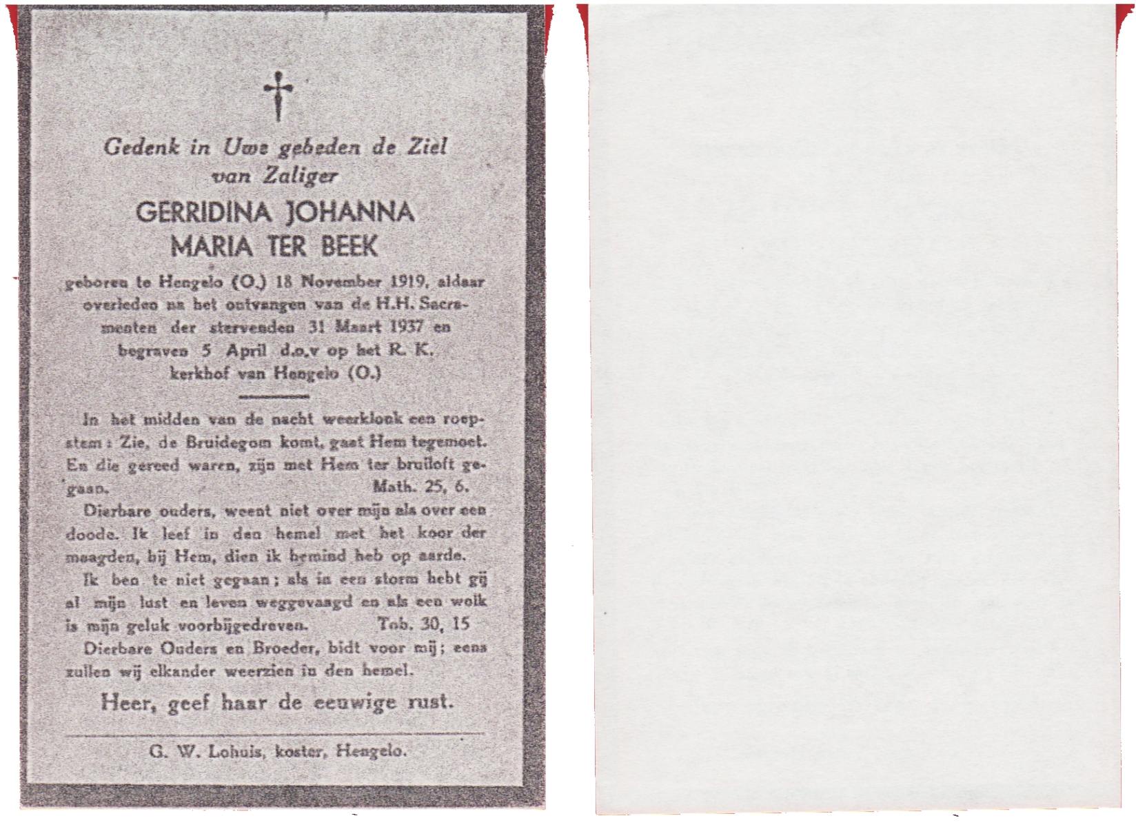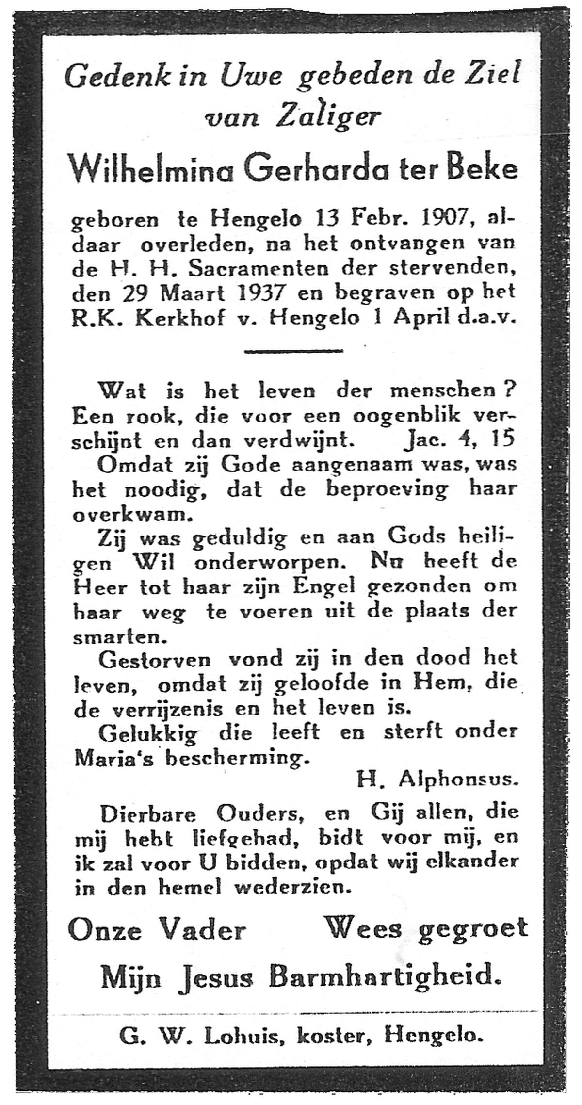 BEKE, ter, Wilhelmina Gerharda, geboren op 13-2-1907 te Hengelo (O), overleden op 29-3-1937 te Hengelo (Ov.) op 30-jarige leeftijd, begraven op 1-4-1937 te Hengelo (Ov.).