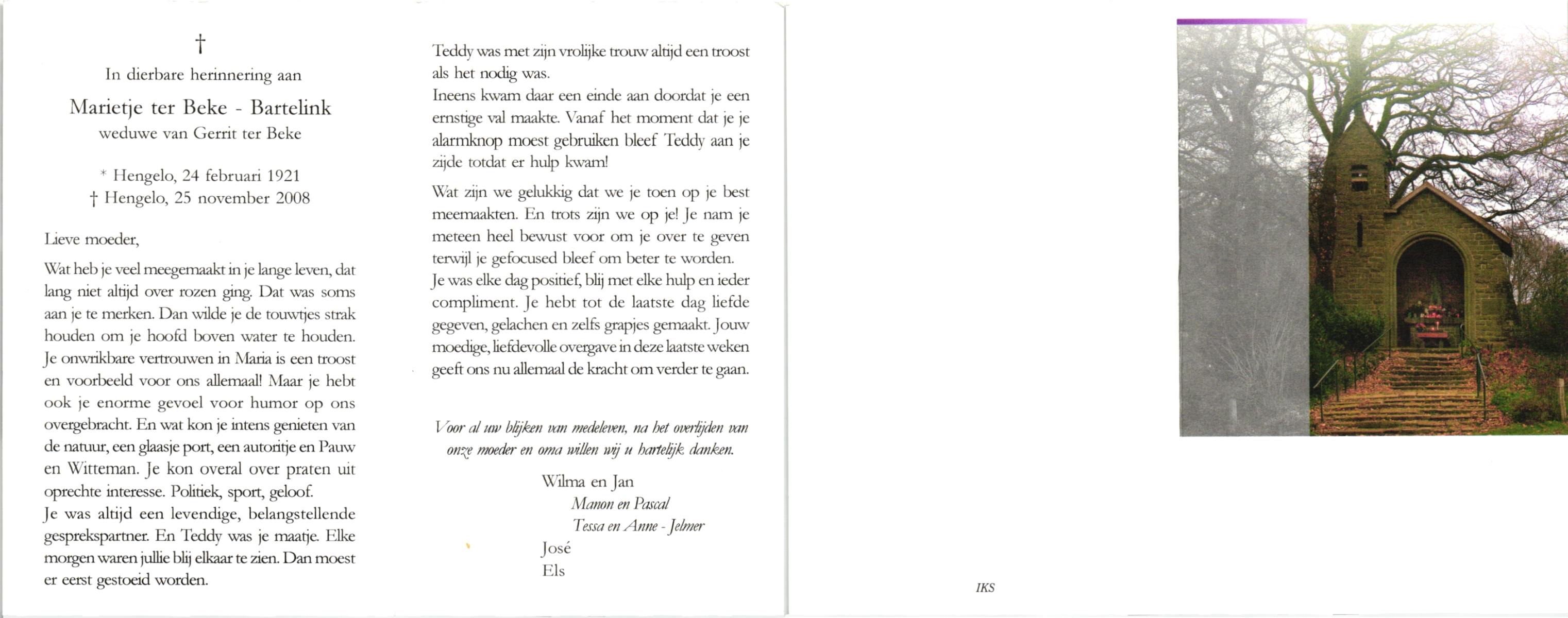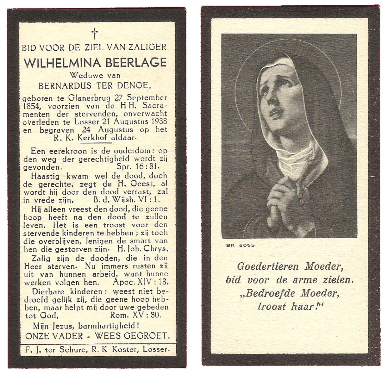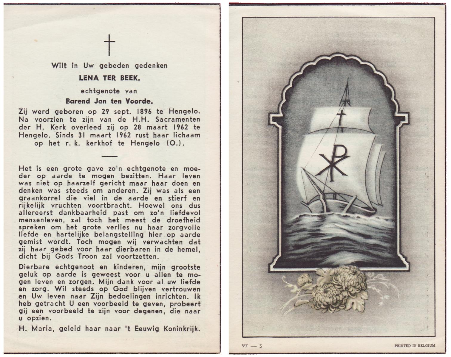 BEKE, ter, Wilhelmina Gerharda, geboren op 13-2-1907 te Hengelo (O), overleden op 29-3-1937 te Hengelo (Ov.) op 30-jarige leeftijd, begraven op 1-4-1937 te Hengelo (Ov.).