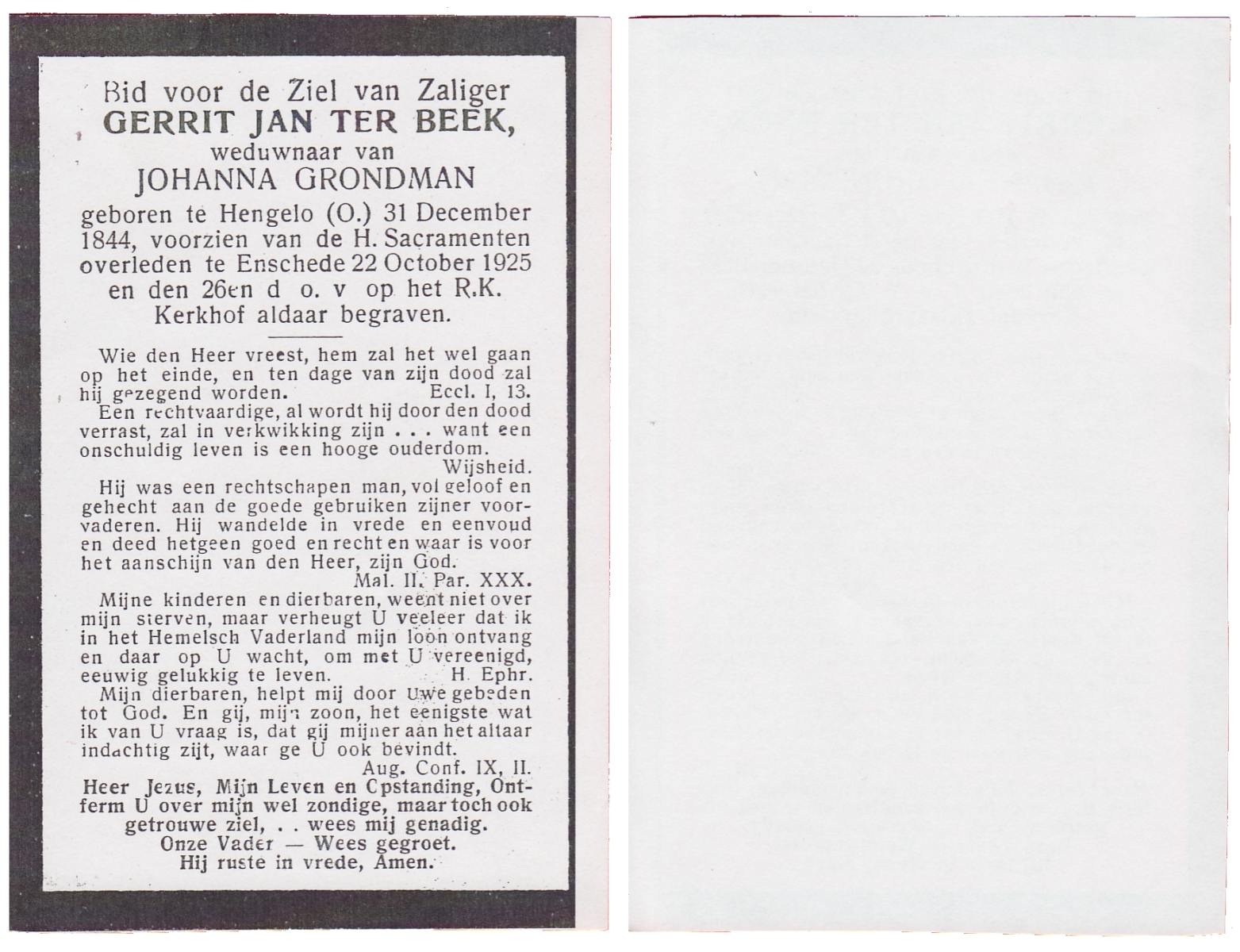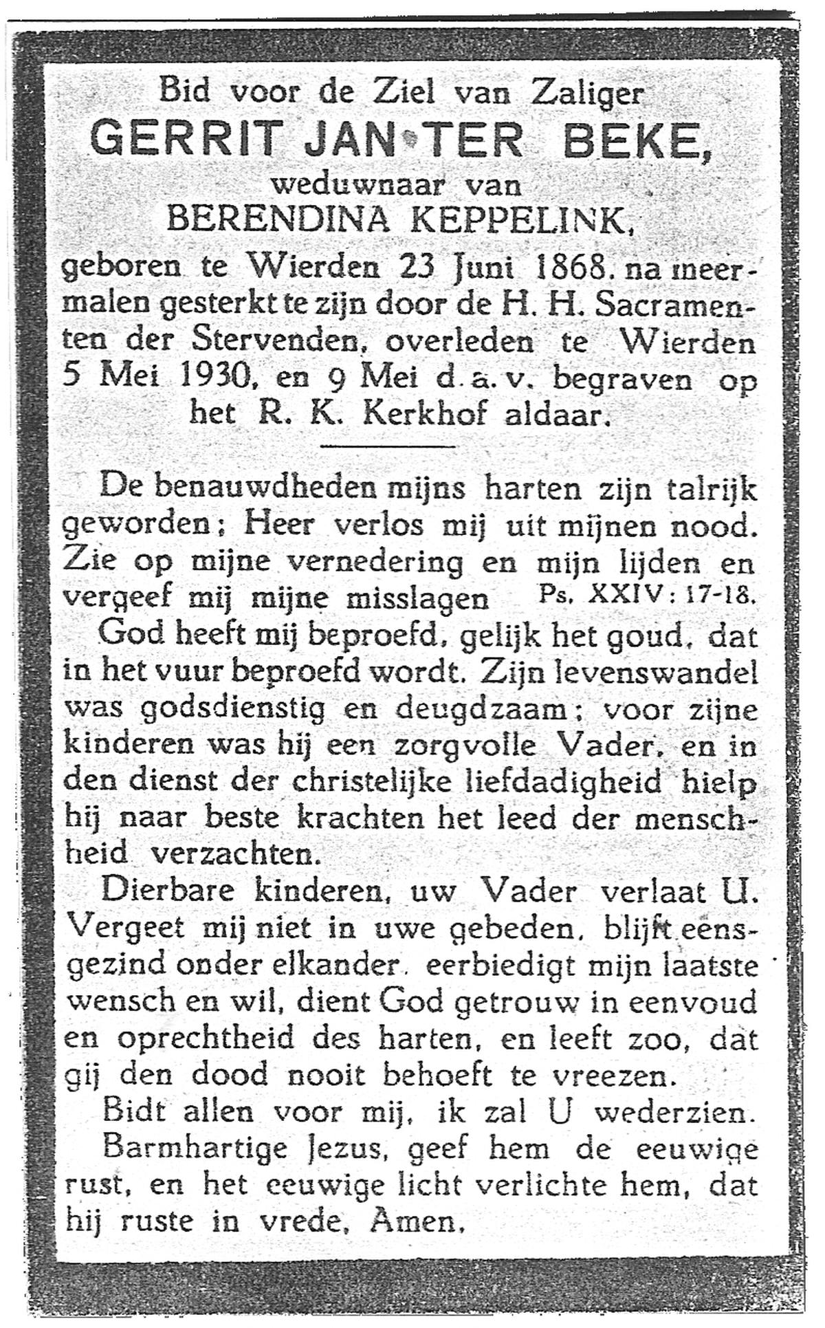 BEKE, ter, Gerrit Jan, geboren op 23-06-1868 te Wierden, overleden op 5-5-1930 te Wierden op 61-jarige leeftijd, begraven op 9-5-1930 te Wierden.