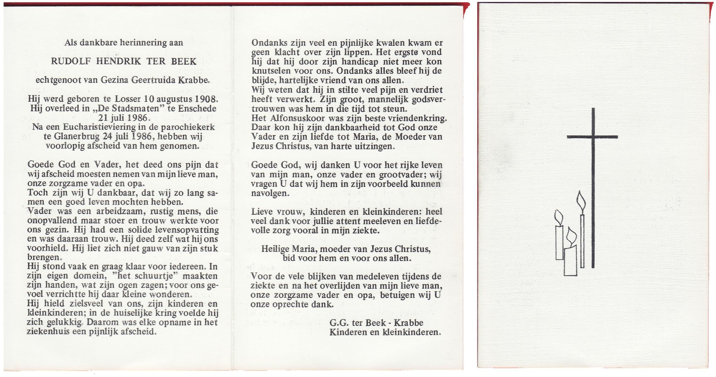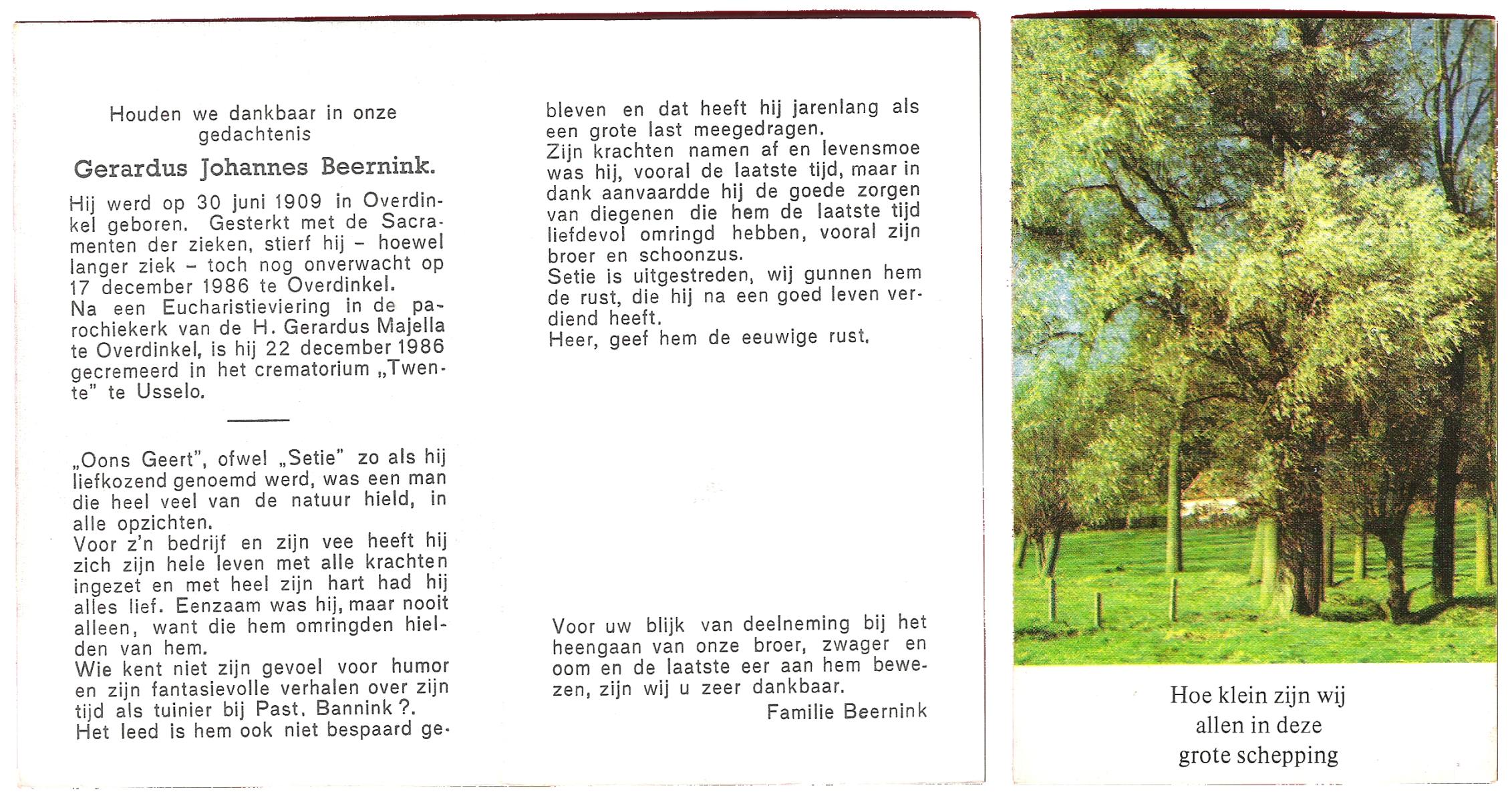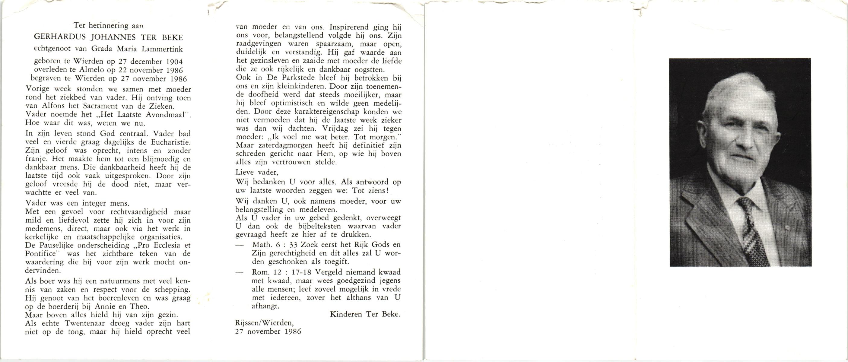 BEKE, ter, Gerhardus Johannes, geboren op 27-12-1904 te Wierden, overleden op 22-11-1986 te Almelo op 81-jarige leeftijd, begraven op 27-11-1986 te Wierden.
